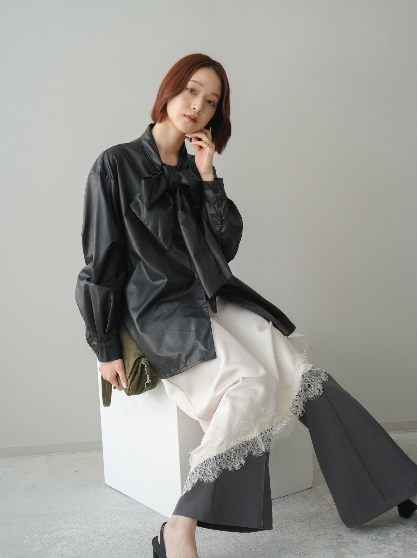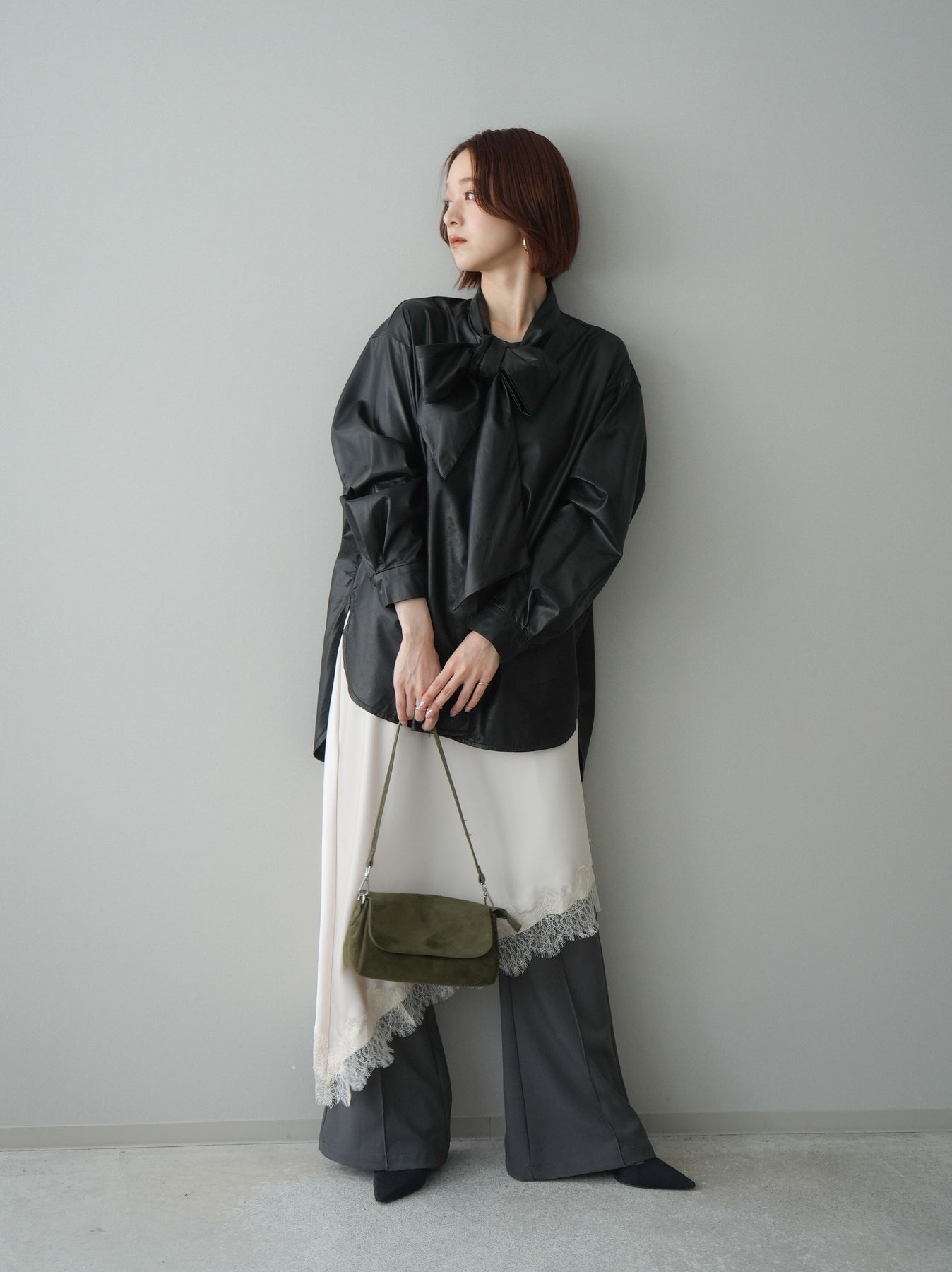 ◆ [予約]フェイクレザーボウタイブラウス