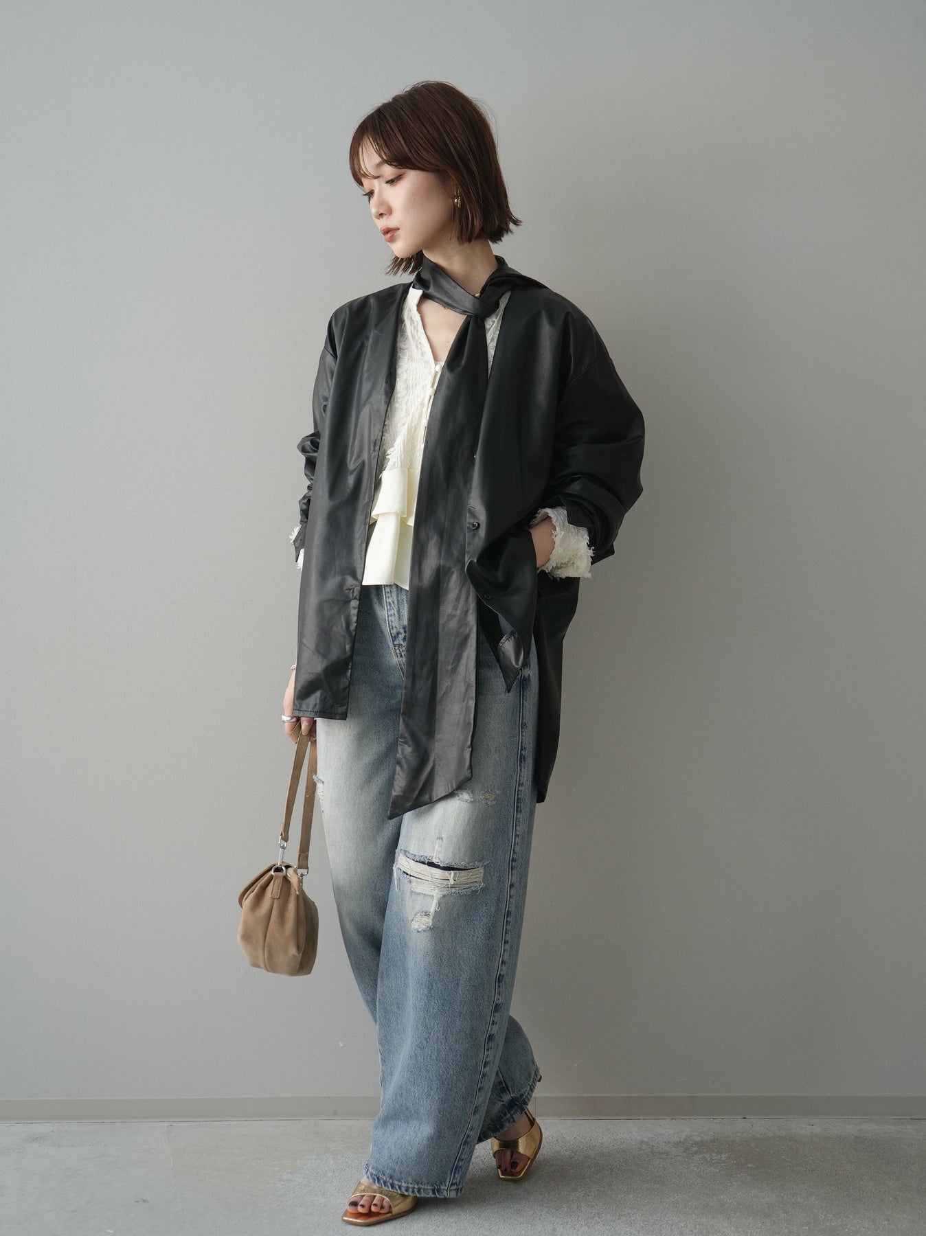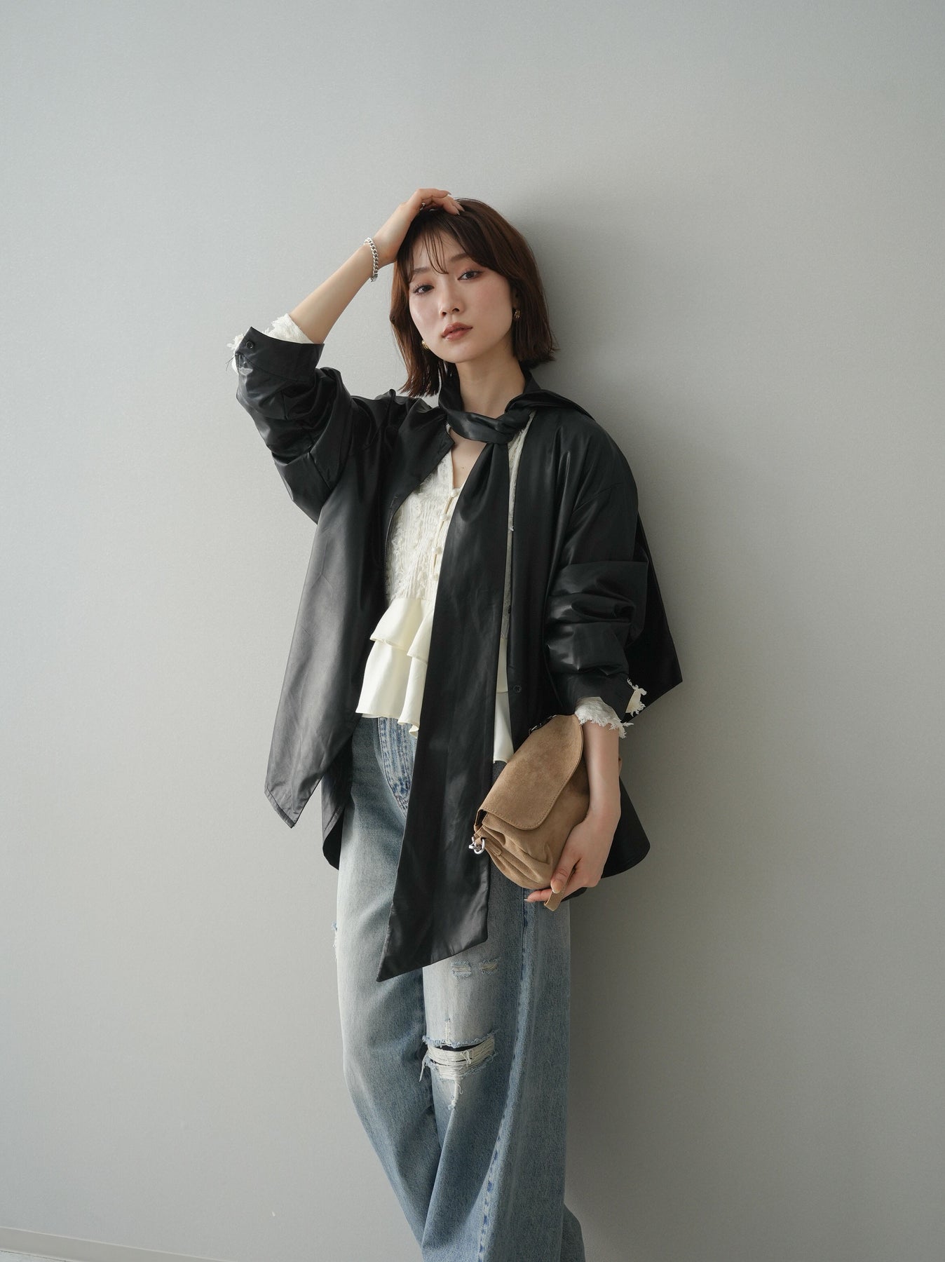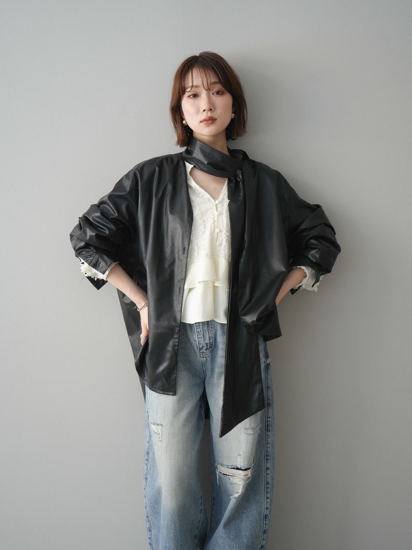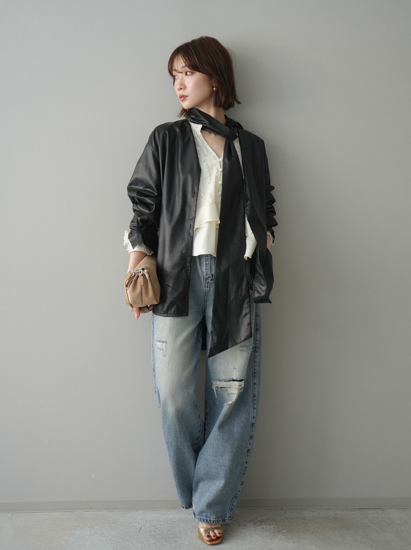[SET]フェイクレザーボウタイブラウス+ジャガードぺプラムフリルブラウス+ダメージデニムセミワイドパンツ(3set)