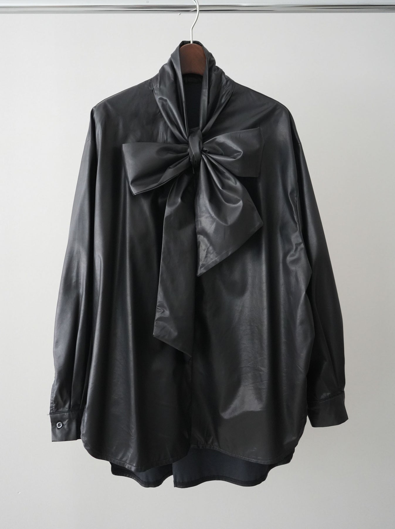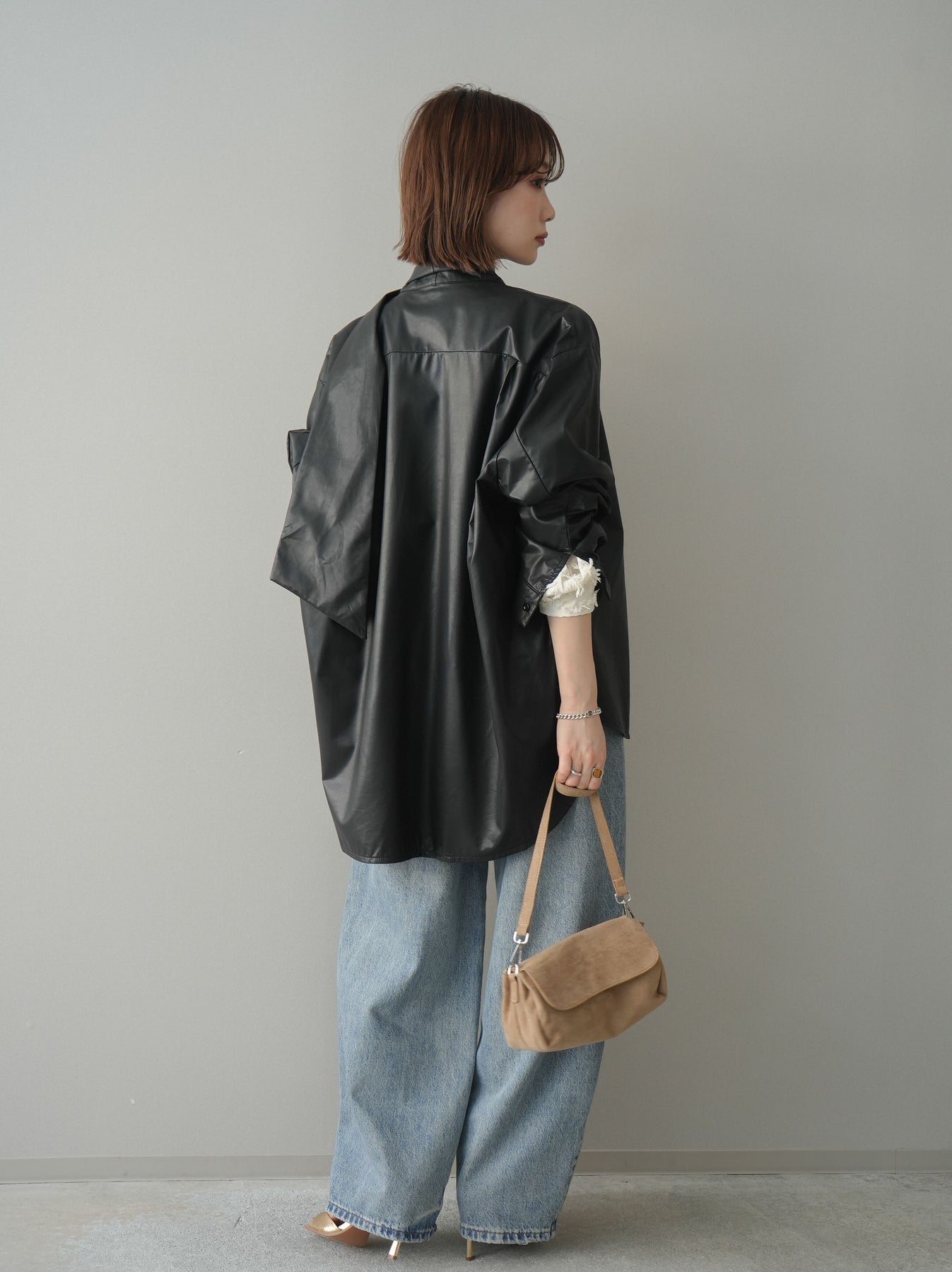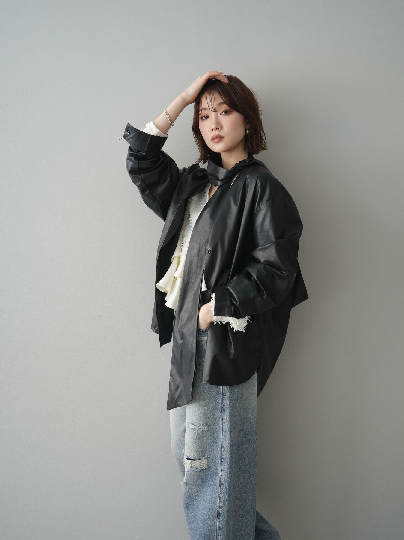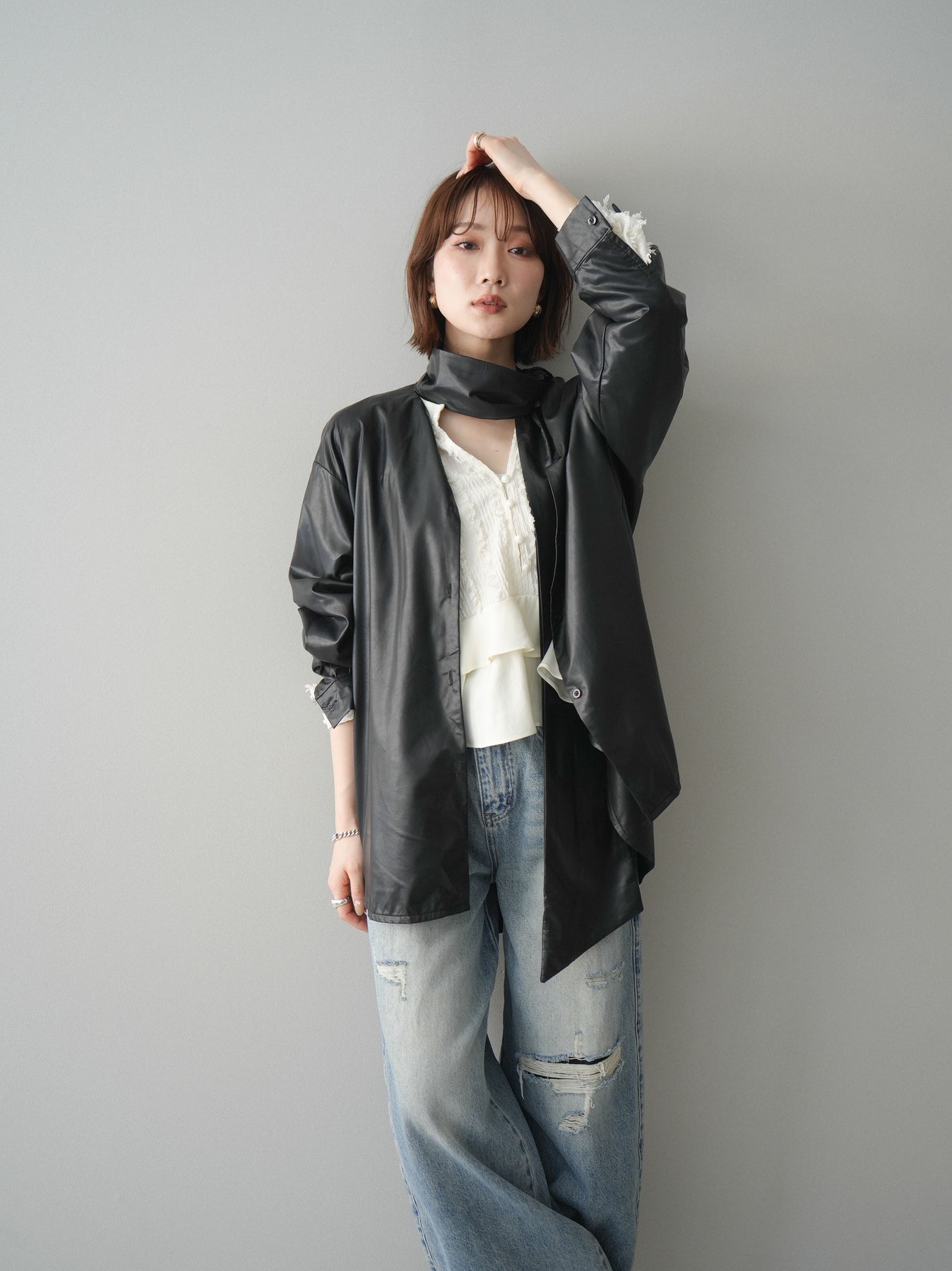 [SET]フェイクレザーボウタイブラウス+ジャガードぺプラムフリルブラウス+ダメージデニムセミワイドパンツ(3set)