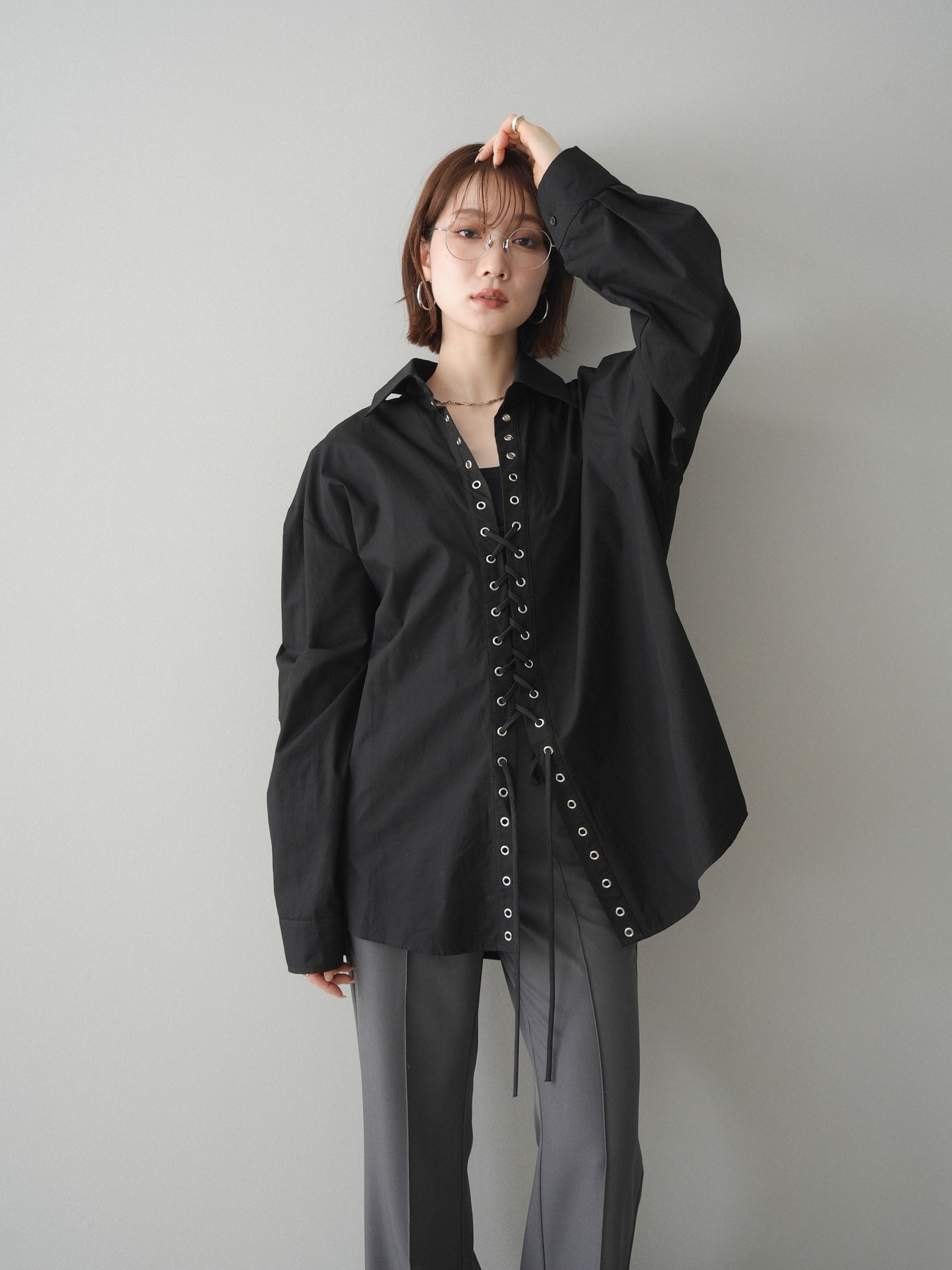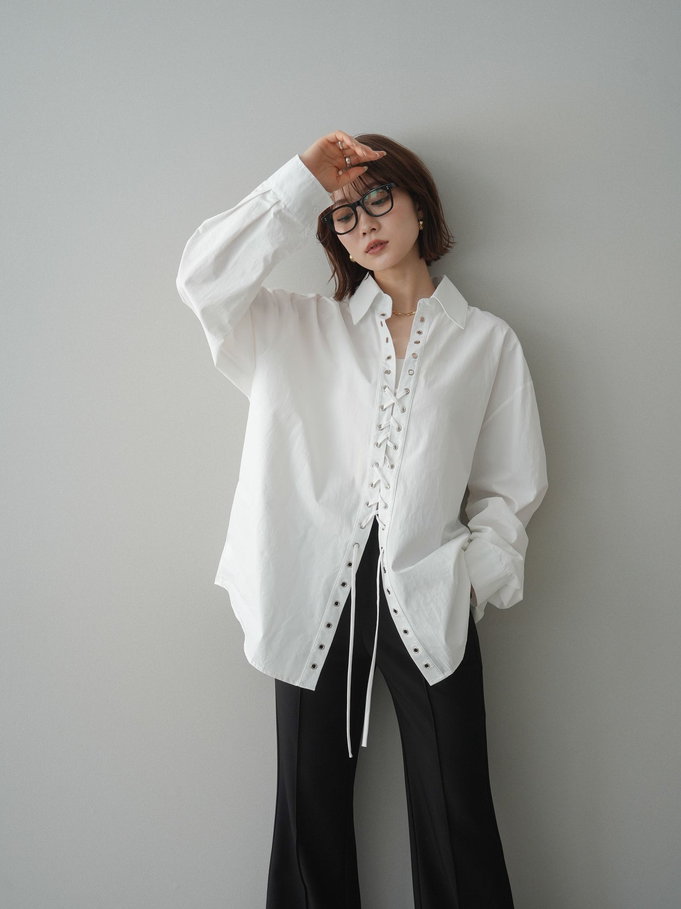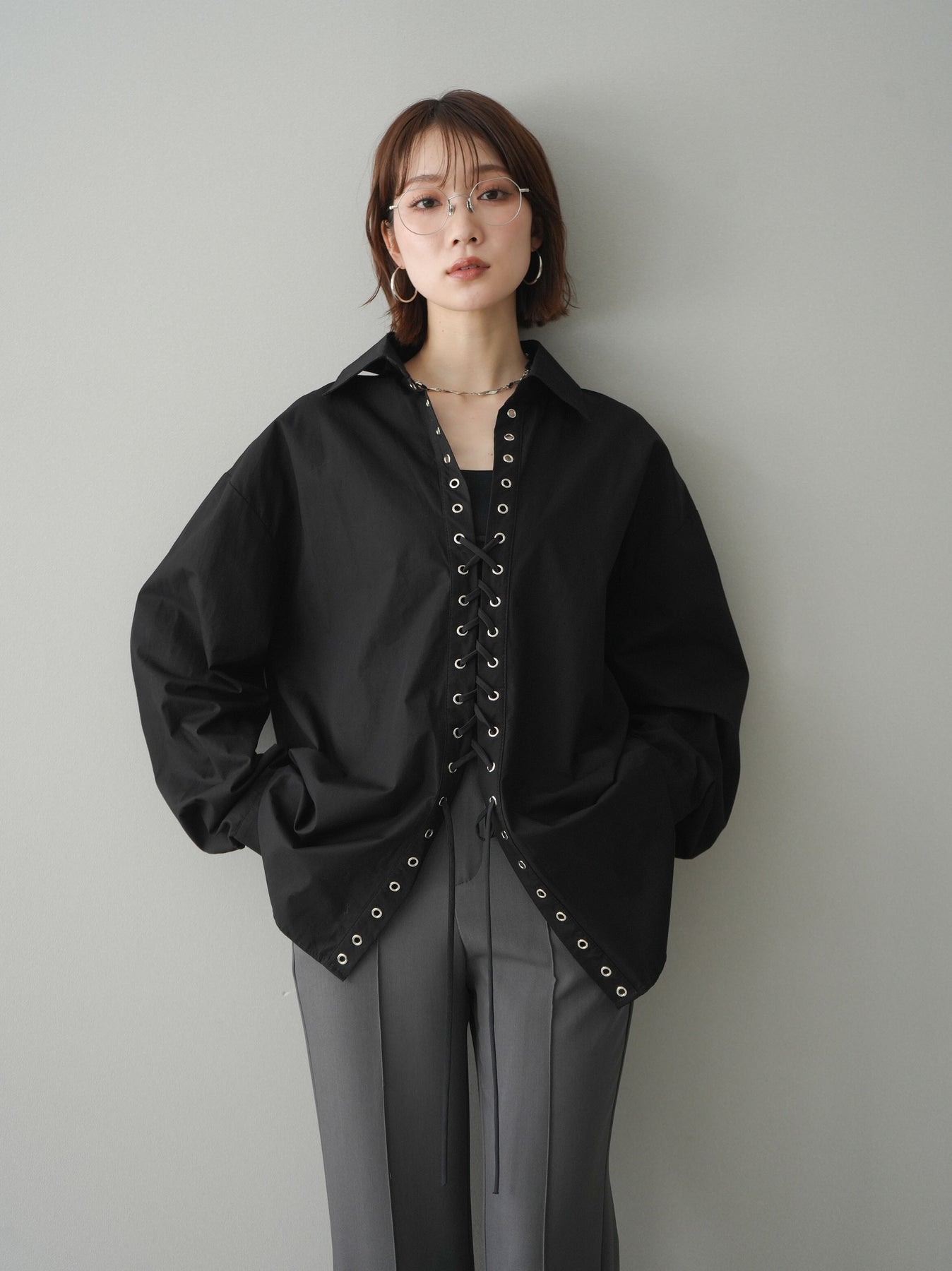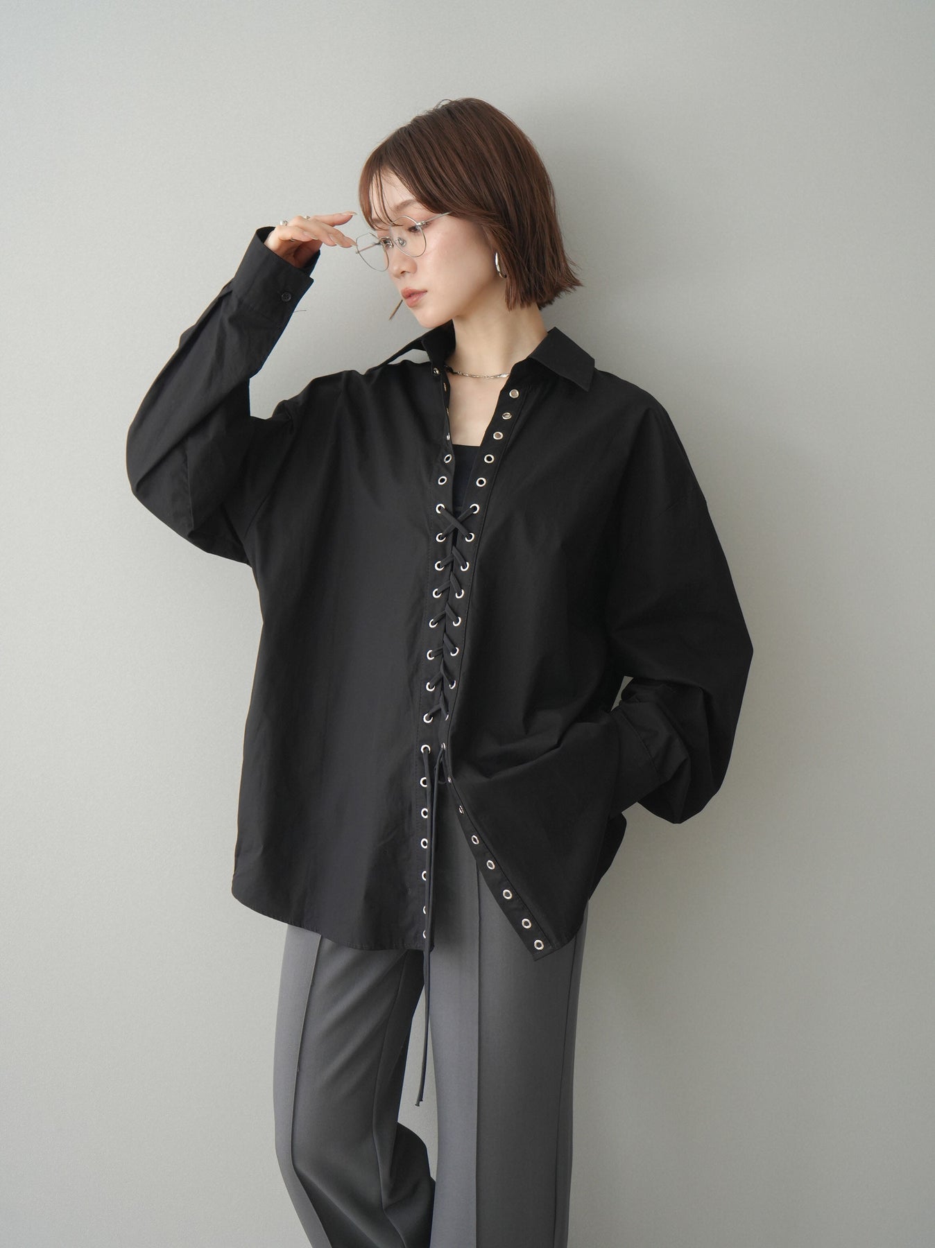 フロントのレースアップデザインが目を惹く主役級ブラウス。アイレットを施した縦ラインがスタイリングに程よいエッジを加えつつ、ゆとりのあるシルエットで抜け感のあるバランスに仕上げています。紐の結び方や開き具合で印象をアレンジでき、1枚ではもちろん羽織りとしても活躍。きれいめからモードな着こなしまで幅広く合わせやすいアイテムです。 ※ボトムス、キャミソール(インナー)以外の商品は一律でインナーは付属していません