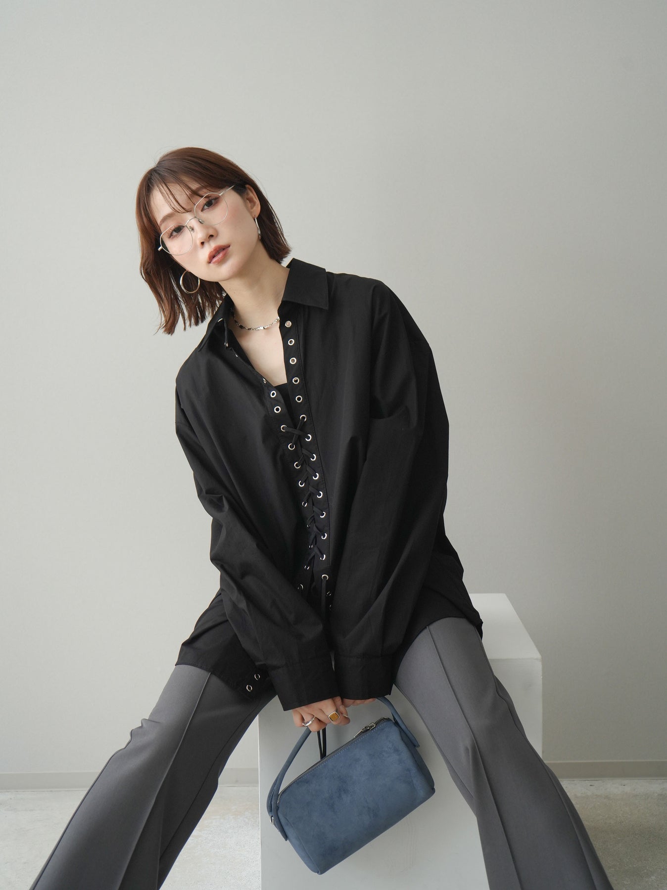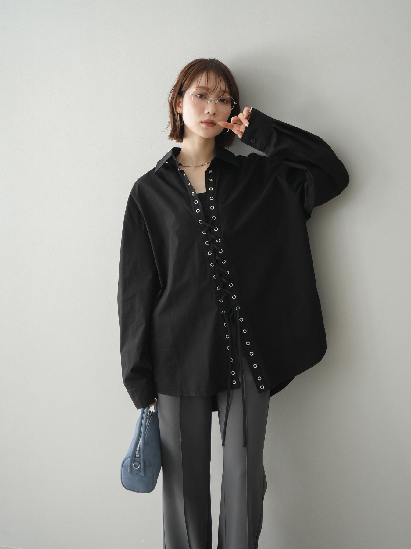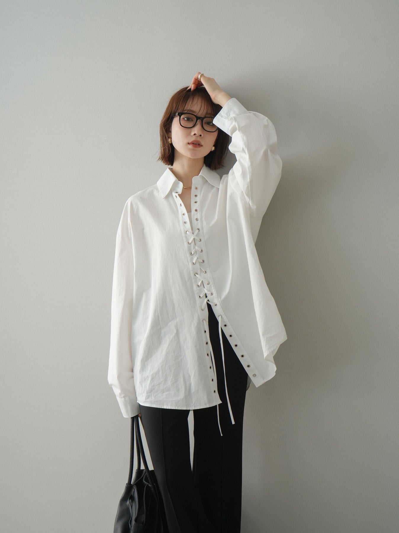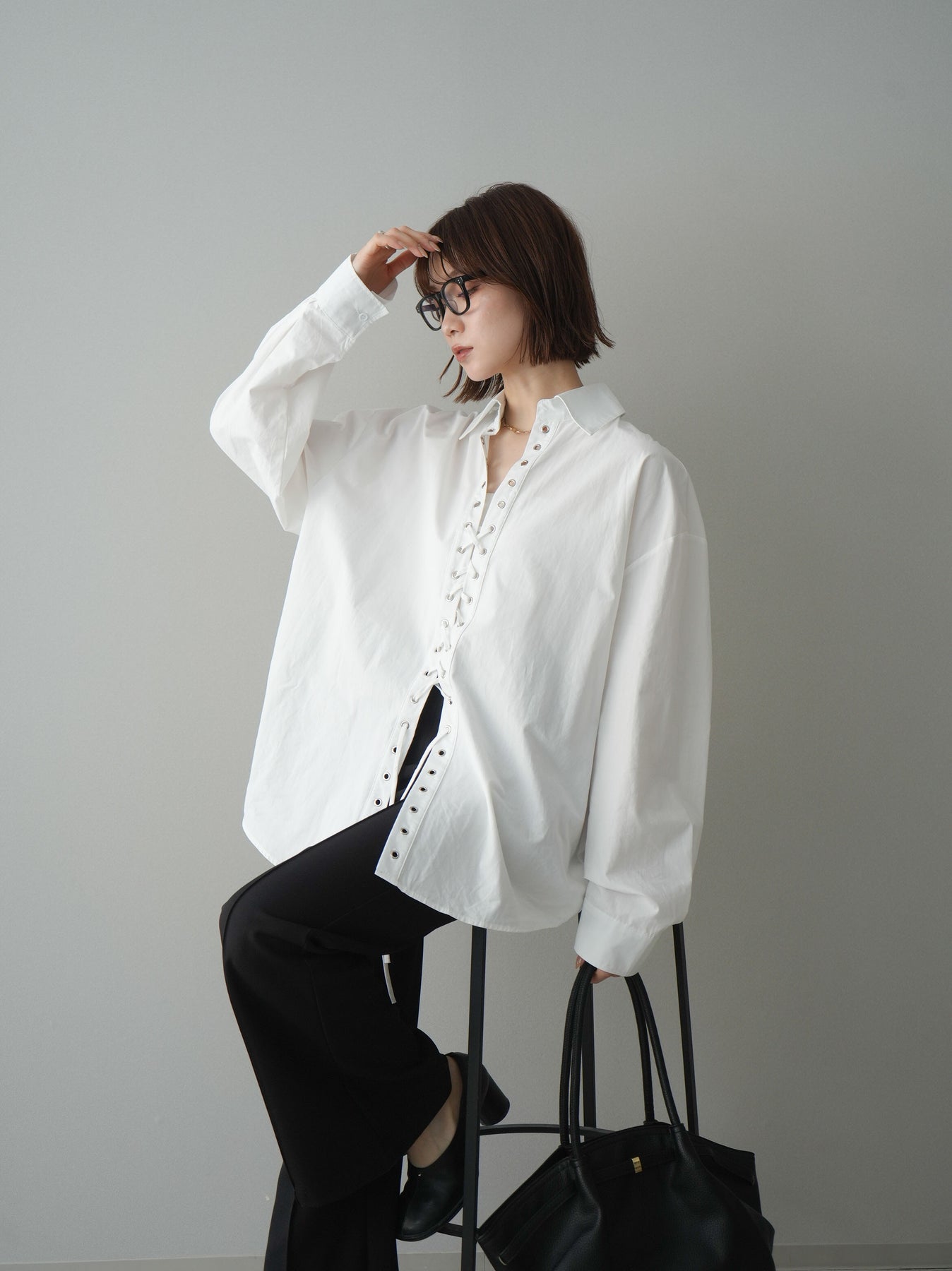 フロントのレースアップデザインが目を惹く主役級ブラウス。アイレットを施した縦ラインがスタイリングに程よいエッジを加えつつ、ゆとりのあるシルエットで抜け感のあるバランスに仕上げています。紐の結び方や開き具合で印象をアレンジでき、1枚ではもちろん羽織りとしても活躍。きれいめからモードな着こなしまで幅広く合わせやすいアイテムです。 ※ボトムス、キャミソール(インナー)以外の商品は一律でインナーは付属していません