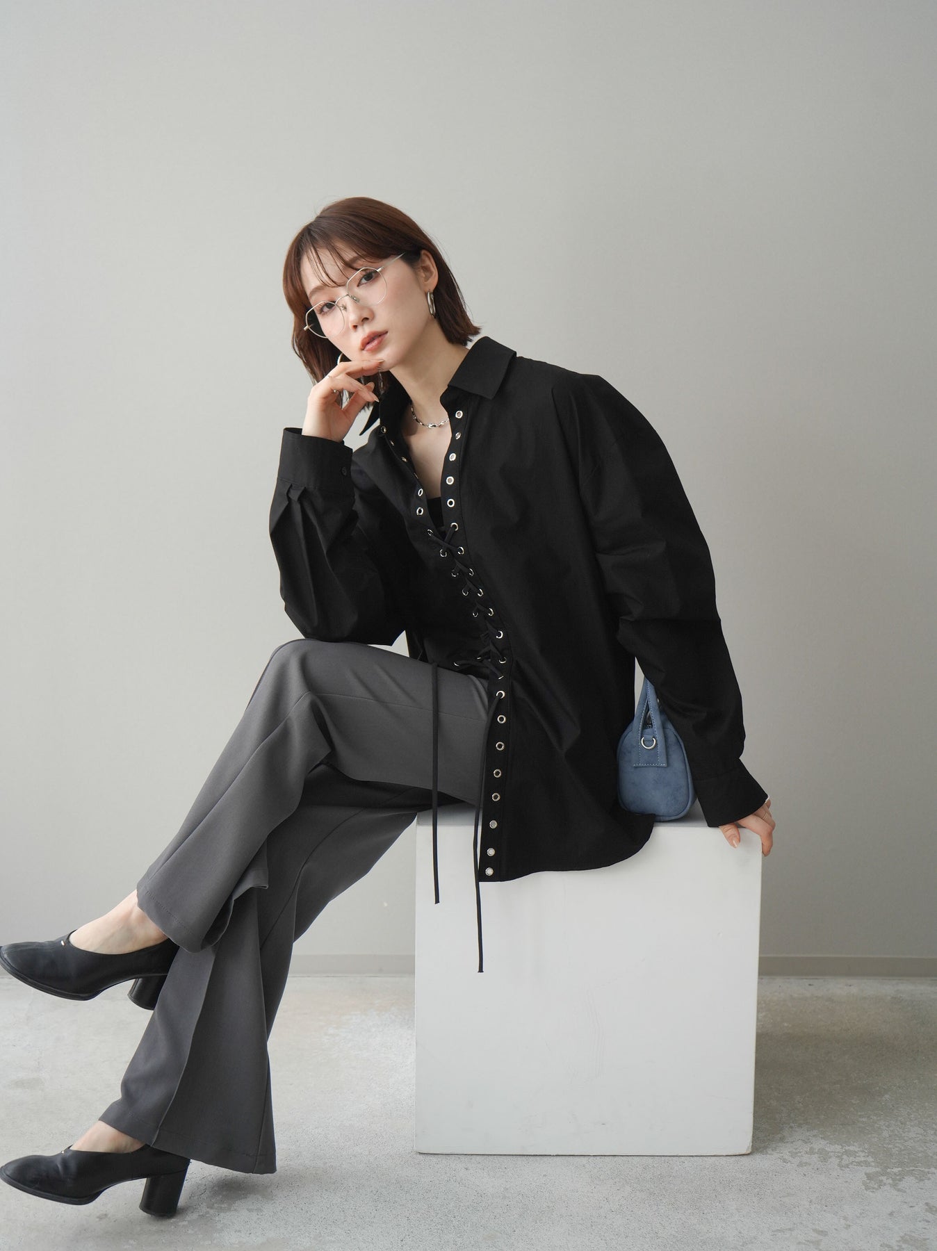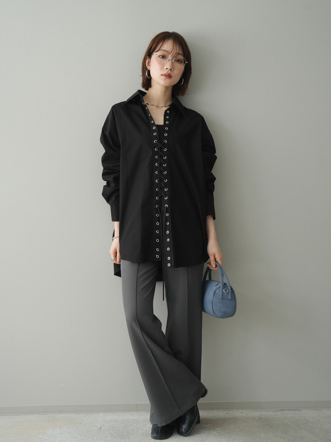 [SET]レースアップブロードシャツ+センターシームフレアパンツ(2set)