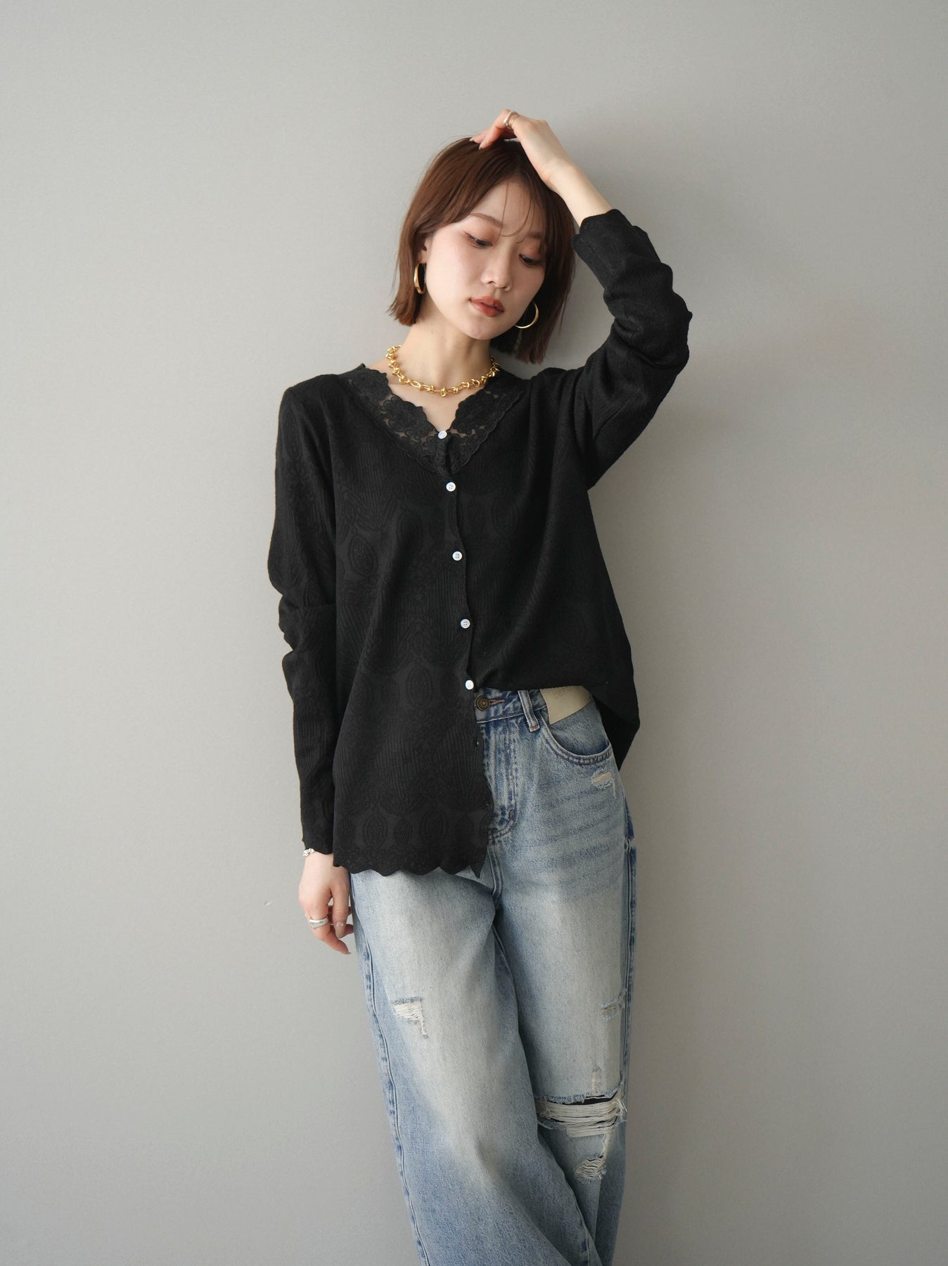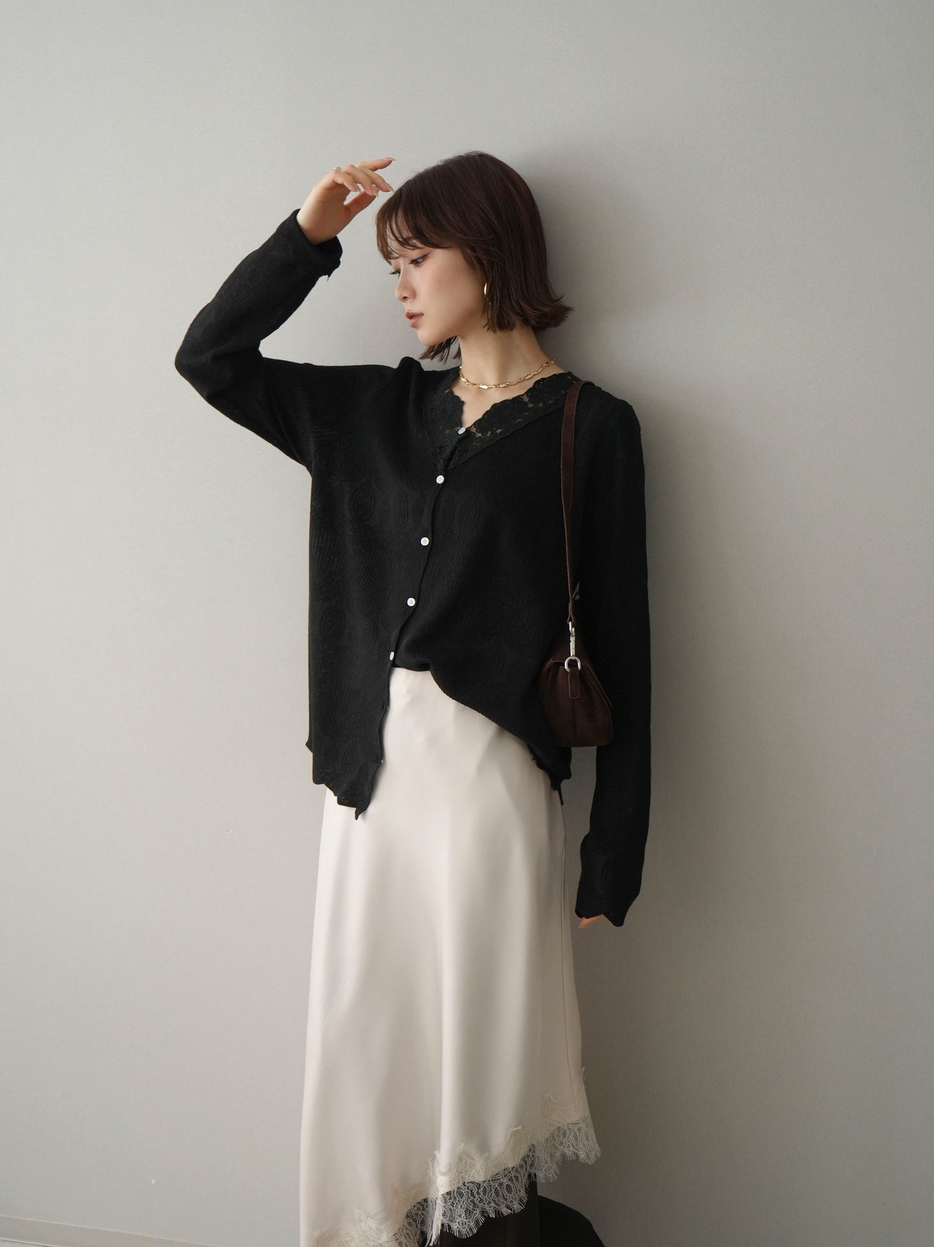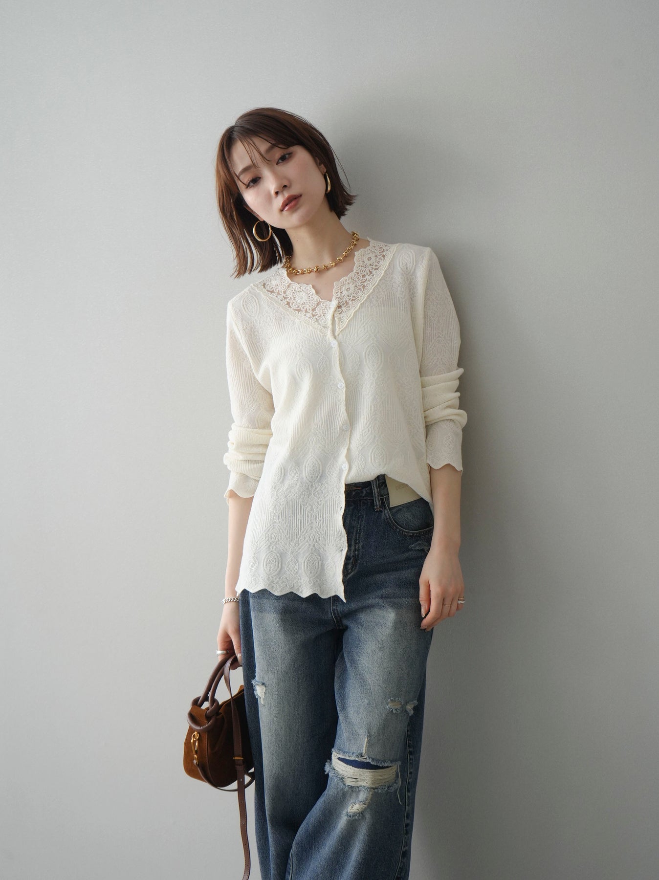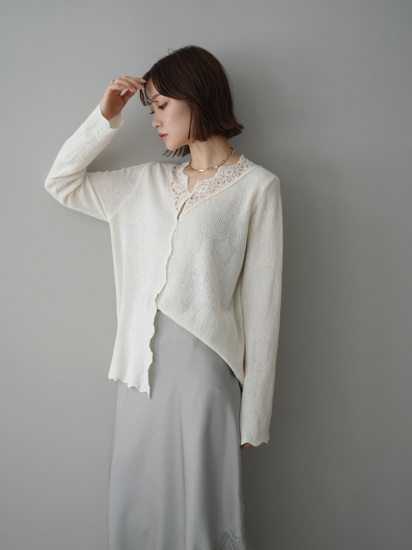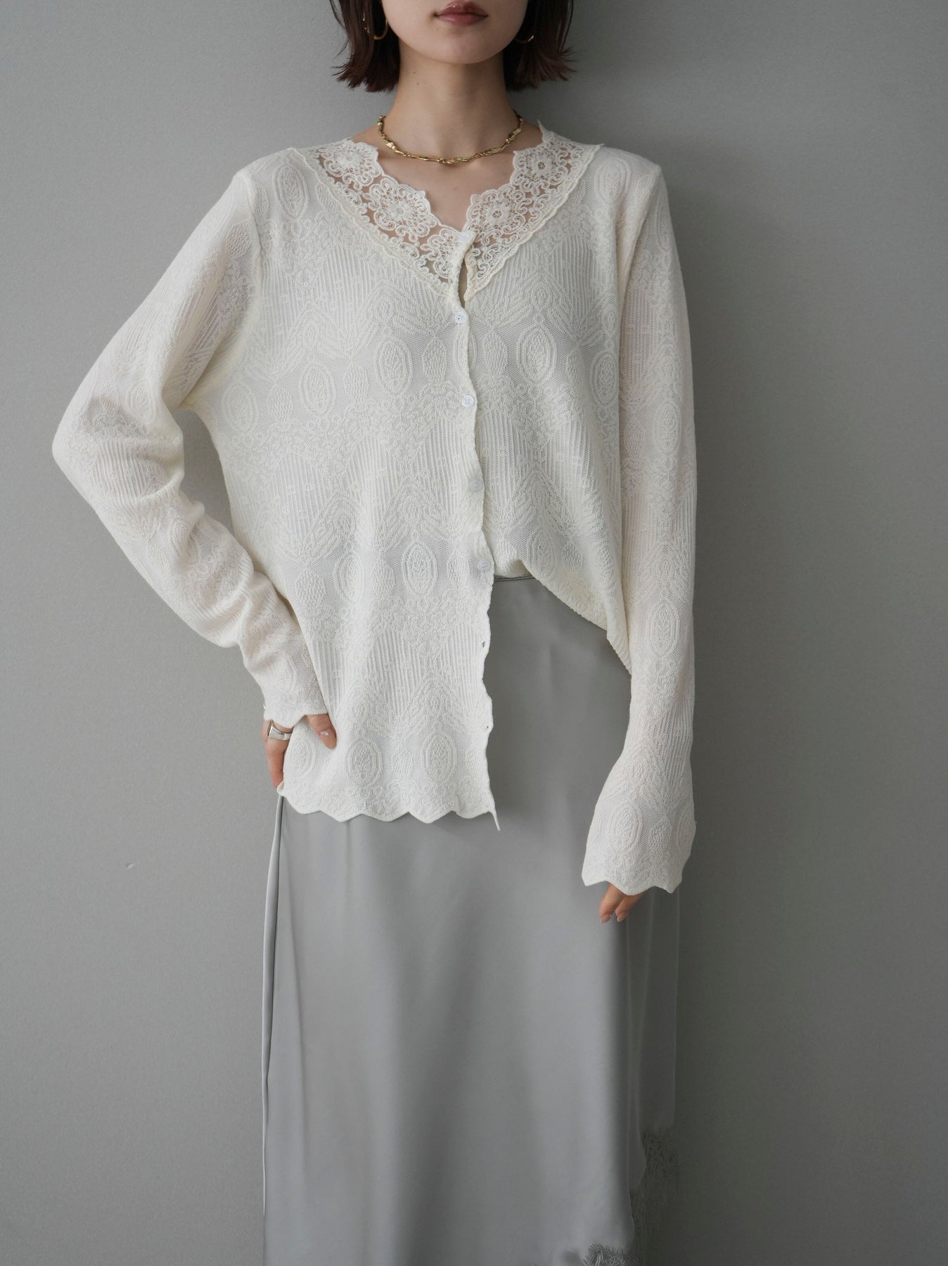 繊細なジャガード編みとレースネックが上品な印象を与えるニットカーディガン。さりげない透け感のある編み地が軽やかさを演出し、Vネックラインにあしらったレースが顔まわりを華やかに彩ります。ほどよくゆとりのあるシルエットで羽織りとしてはもちろん、ボタンを留めてトップス風にも着用可能。デニムからきれいめボトムまで幅広いスタイリングに馴染む一着です。 ※ボトムス、キャミソール(インナー)以外の商品は一律でインナーは付属していません