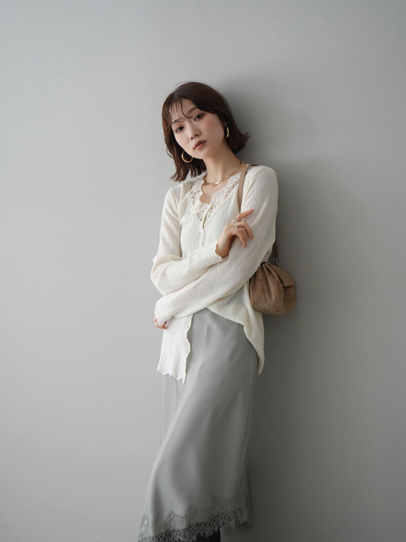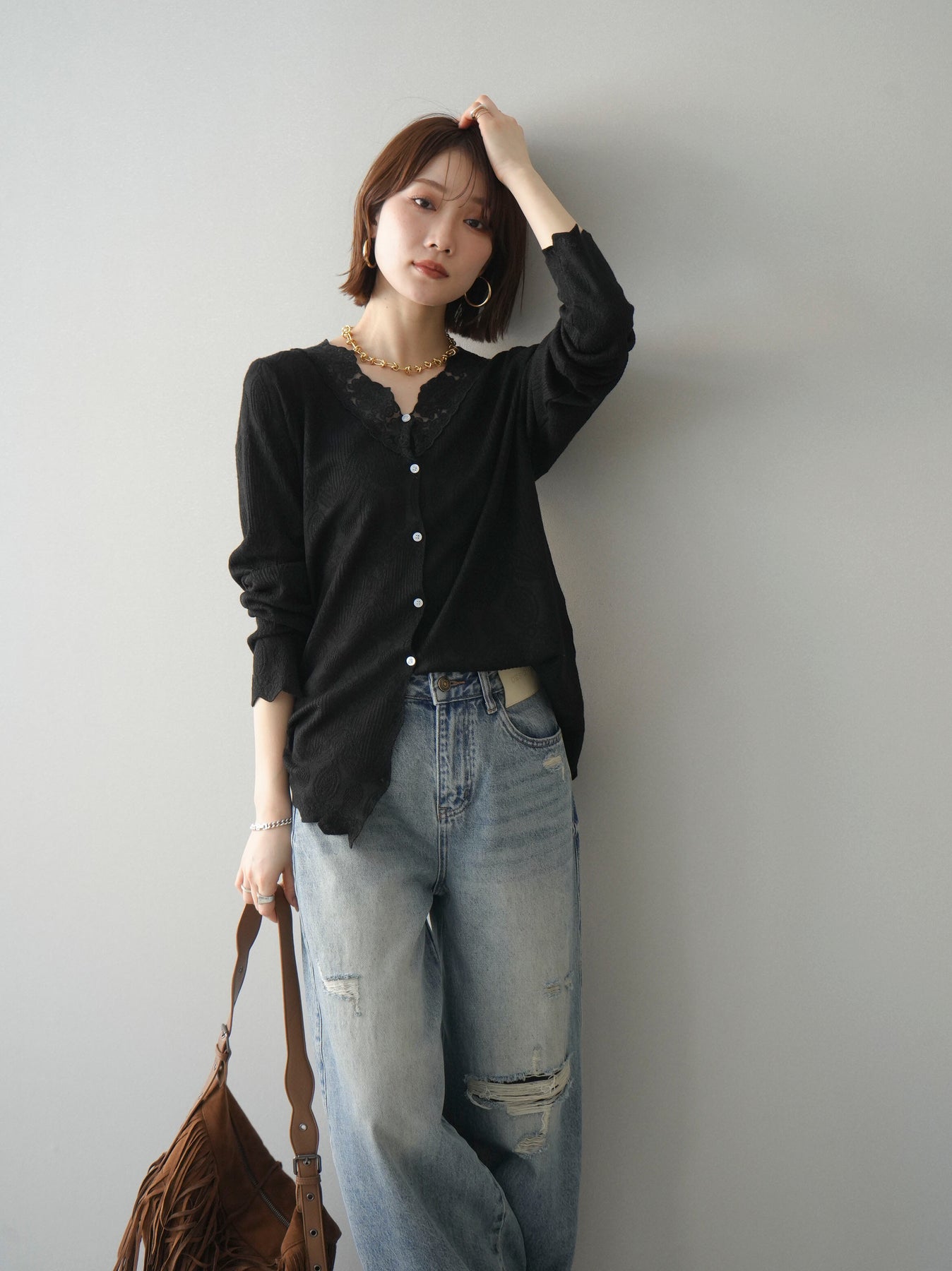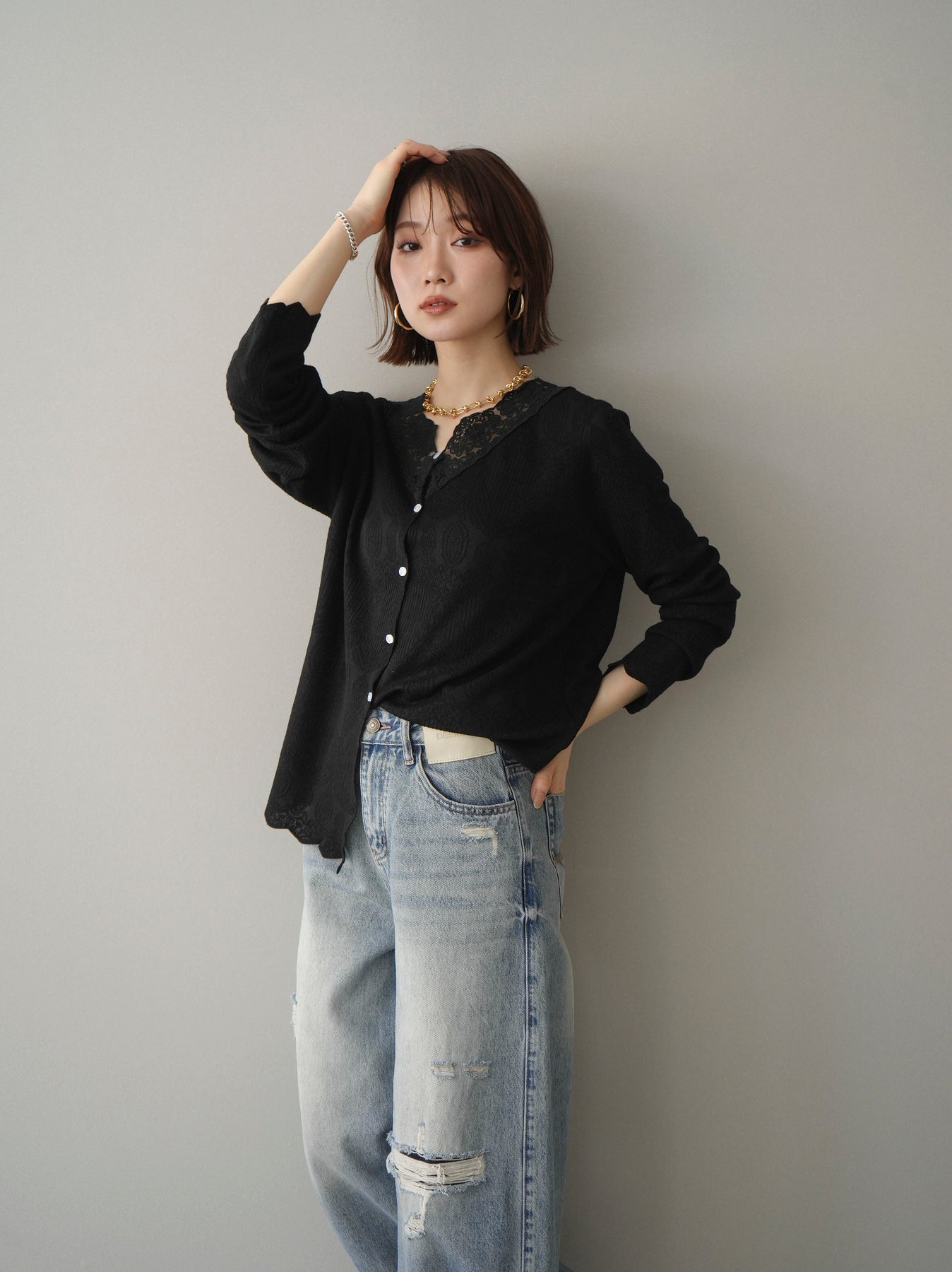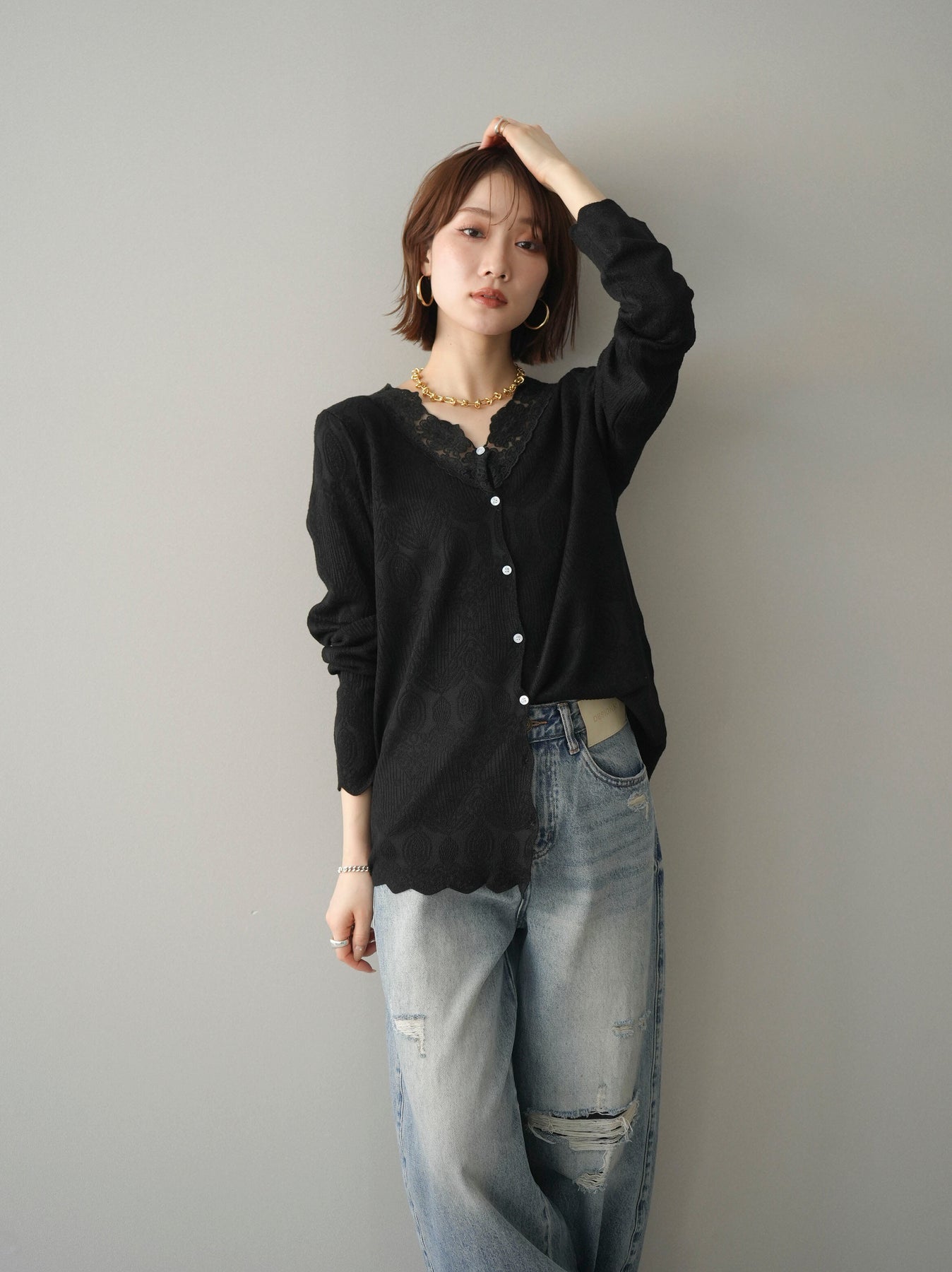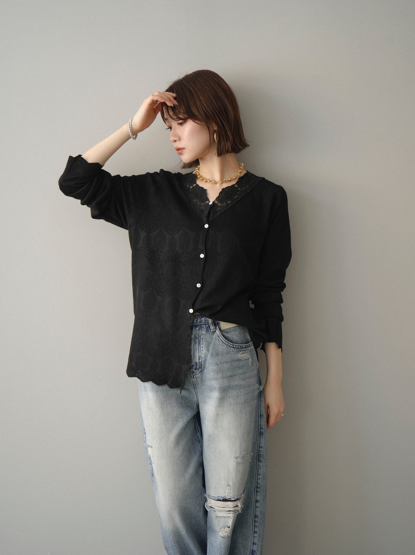 繊細なジャガード編みとレースネックが上品な印象を与えるニットカーディガン。さりげない透け感のある編み地が軽やかさを演出し、Vネックラインにあしらったレースが顔まわりを華やかに彩ります。ほどよくゆとりのあるシルエットで羽織りとしてはもちろん、ボタンを留めてトップス風にも着用可能。デニムからきれいめボトムまで幅広いスタイリングに馴染む一着です。 ※ボトムス、キャミソール(インナー)以外の商品は一律でインナーは付属していません