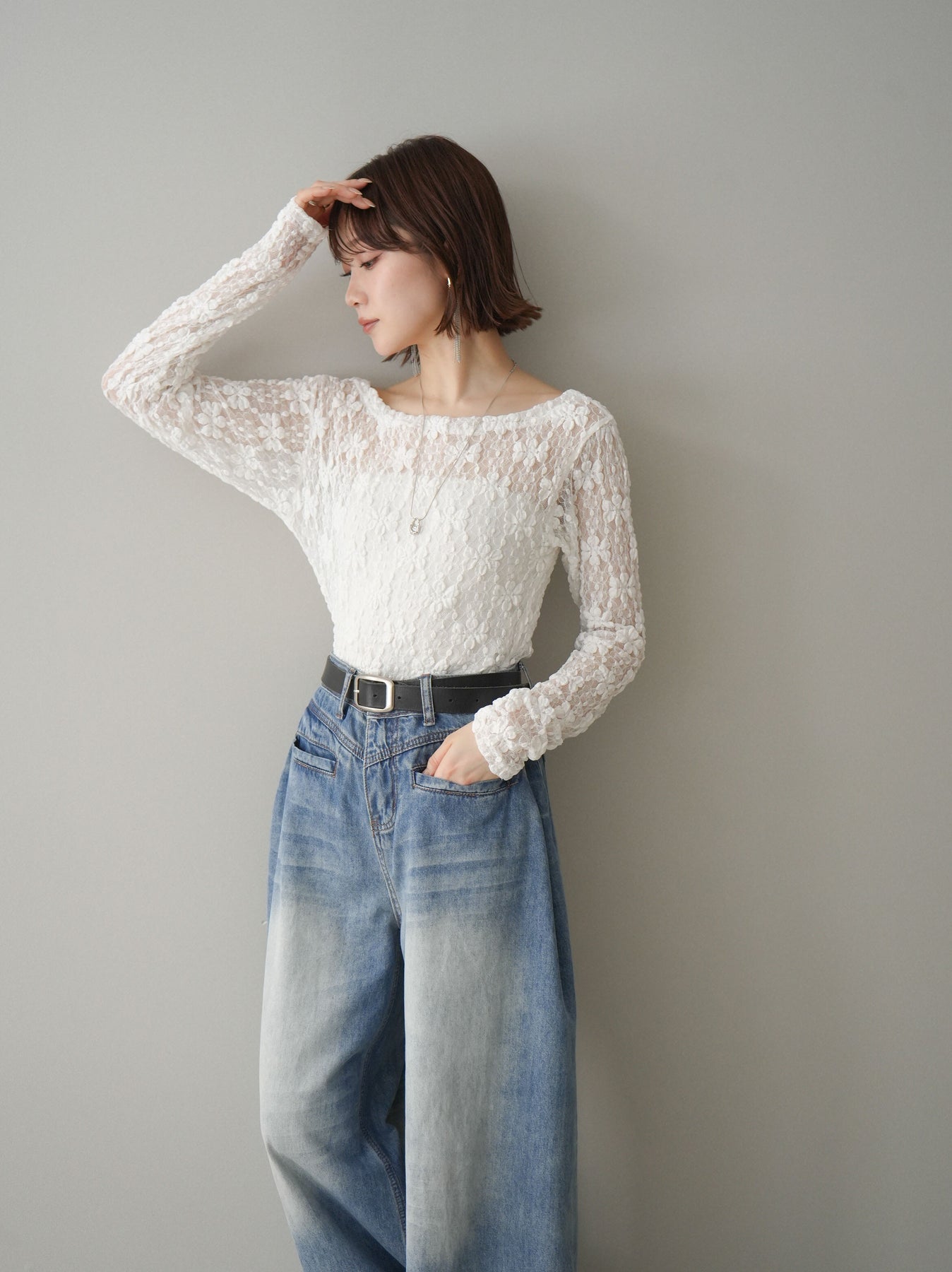 立体感のあるジャガード素材が印象的なシアートップス。程よい透け感が軽やかな抜け感を演出し、シンプルなインナーに重ねるだけでこなれたスタイリングが完成します。身体にやさしく沿うシルエットで女性らしさを引き立て、デニムやスラックス、ジャンスカのインナーとしても活躍する一枚です。