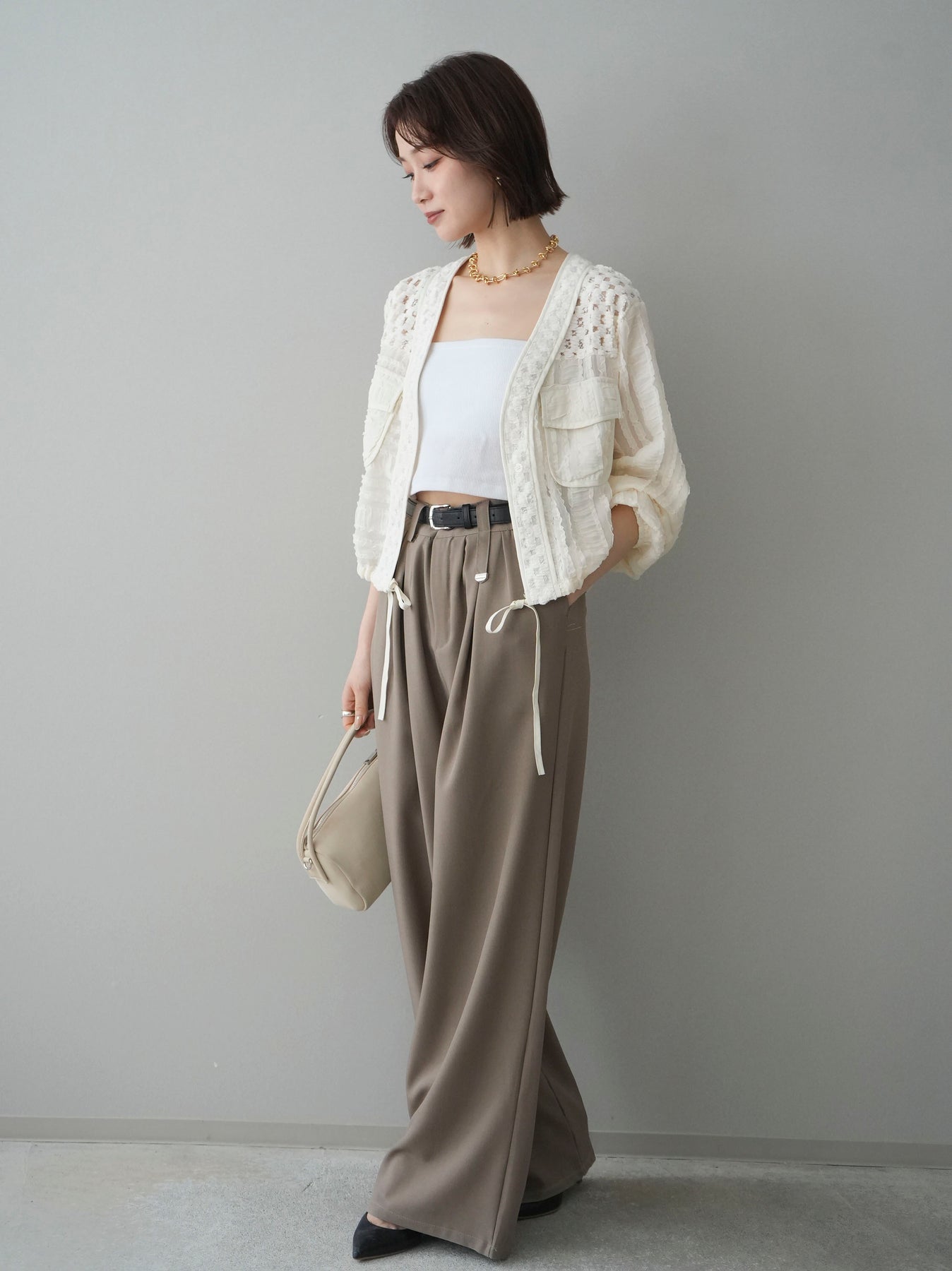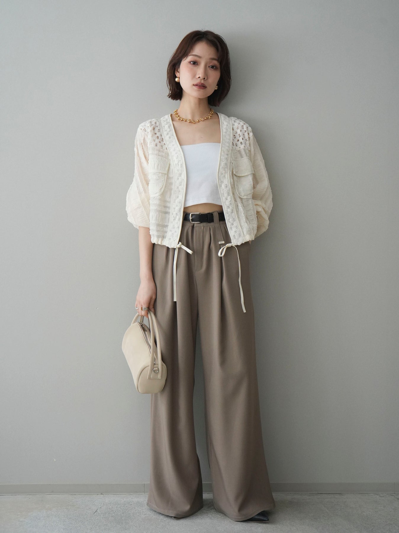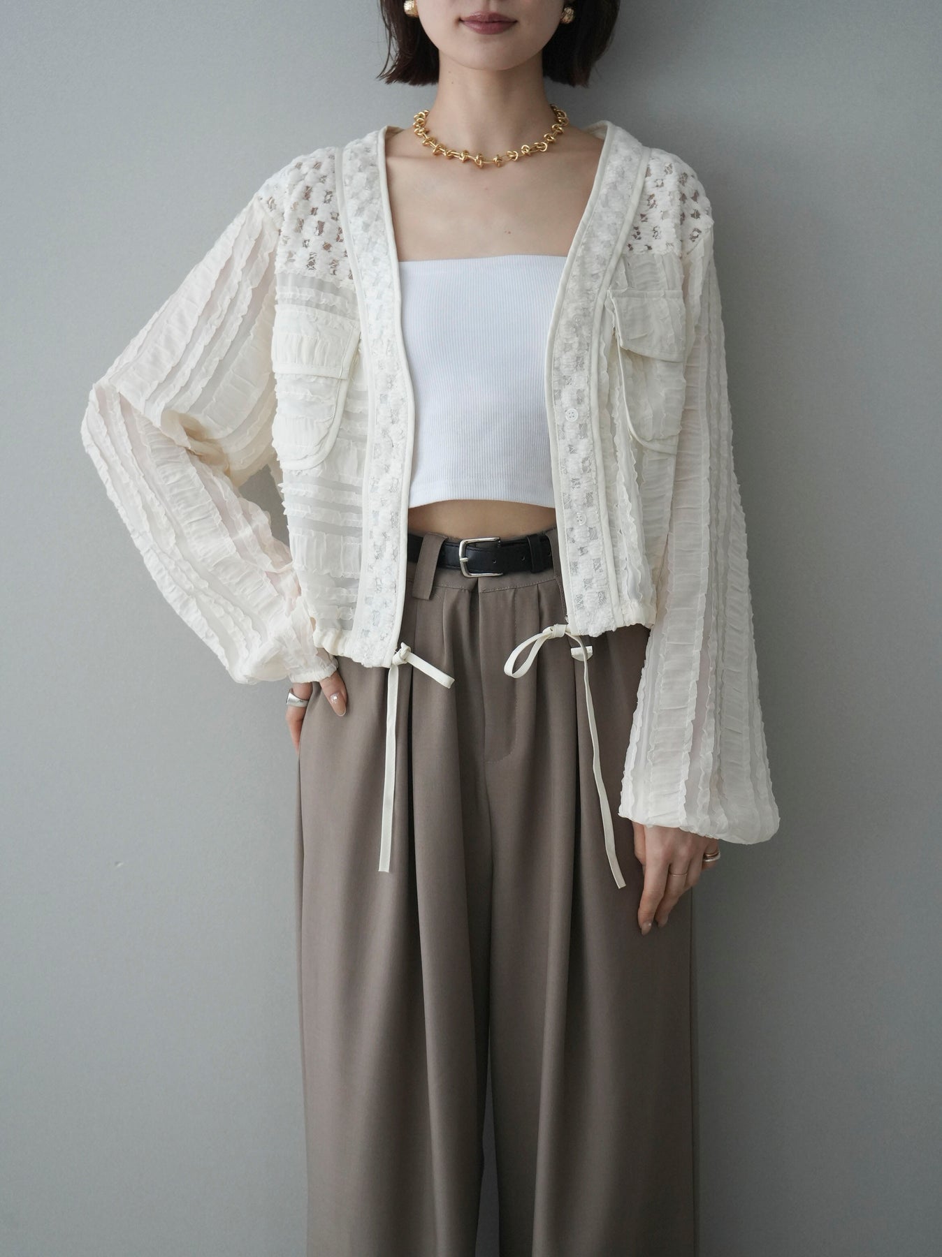 [SET]パッチワークシアーフリルブルゾン+カップ付テレコリブベアキャミソール+ベルト付キーホルダーモチーフワイドパンツ(3set)