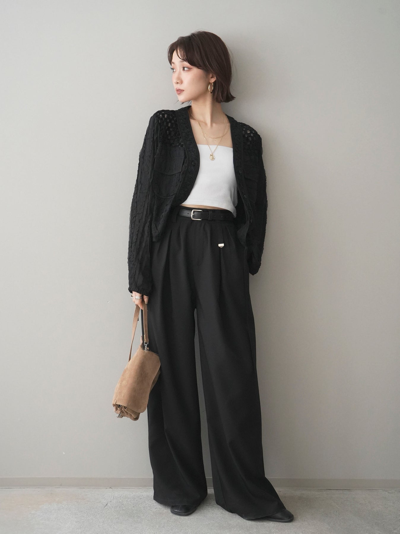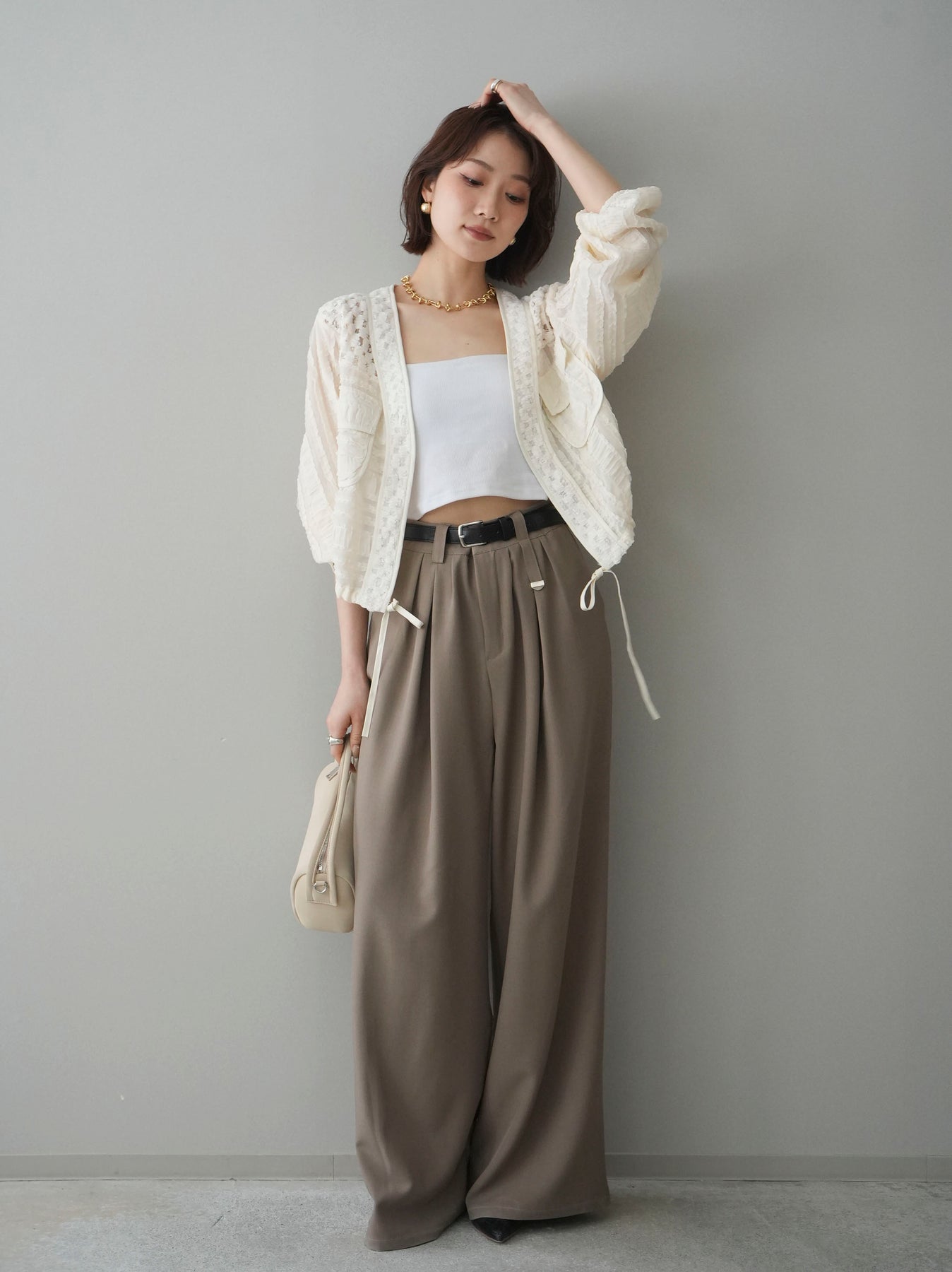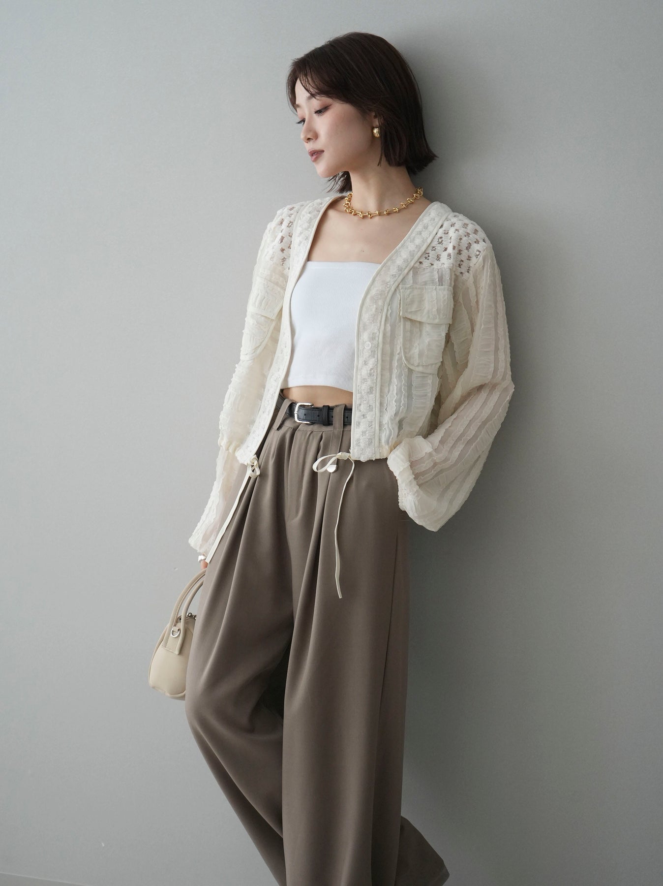 [SET]パッチワークシアーフリルブルゾン+カップ付テレコリブベアキャミソール+ベルト付キーホルダーモチーフワイドパンツ(3set)