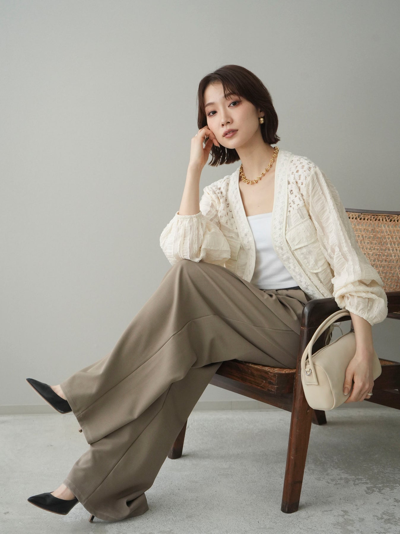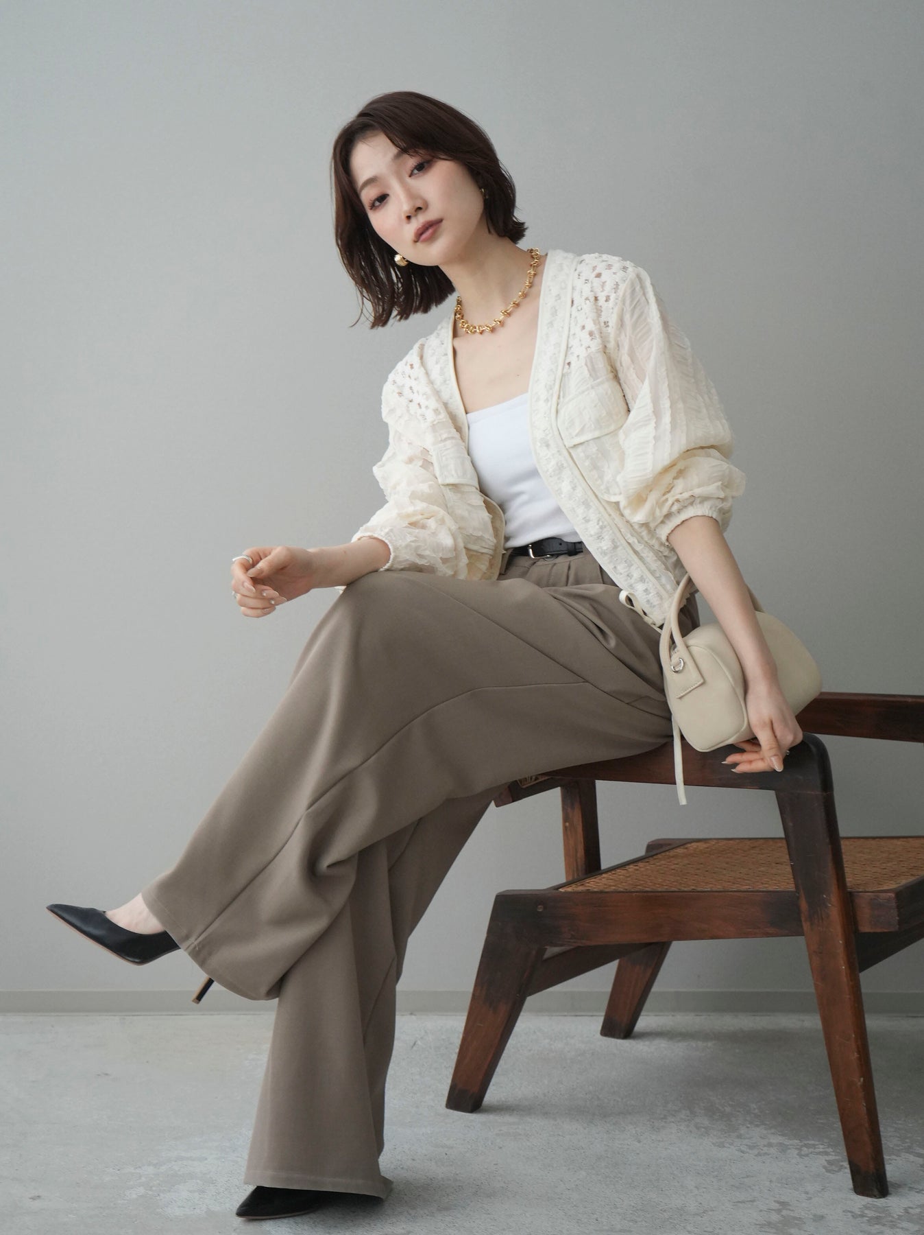 トレンドのヘルシーな肌見せが叶うカップ付きベアキャミソール。テレコリブ素材が程よいフィット感を生み出し、快適な着心地を実現。1枚での着用はもちろん、シャツやジャケットのインナーとしても活躍します。レースのディテールがさりげなく女性らしさをプラスし、カジュアルながらも洗練された印象に。幅広いスタイリングにマッチする万能アイテムです。 ※ボトムス、キャミソール(インナー)以外の商品は一律でインナーは付属していません