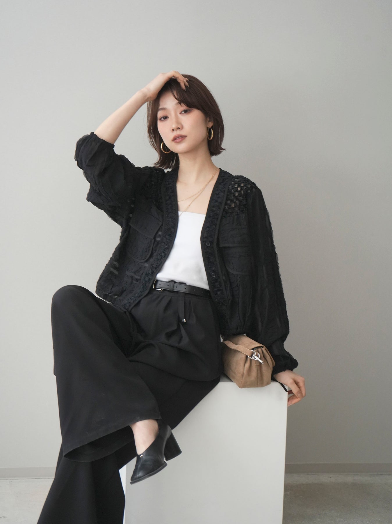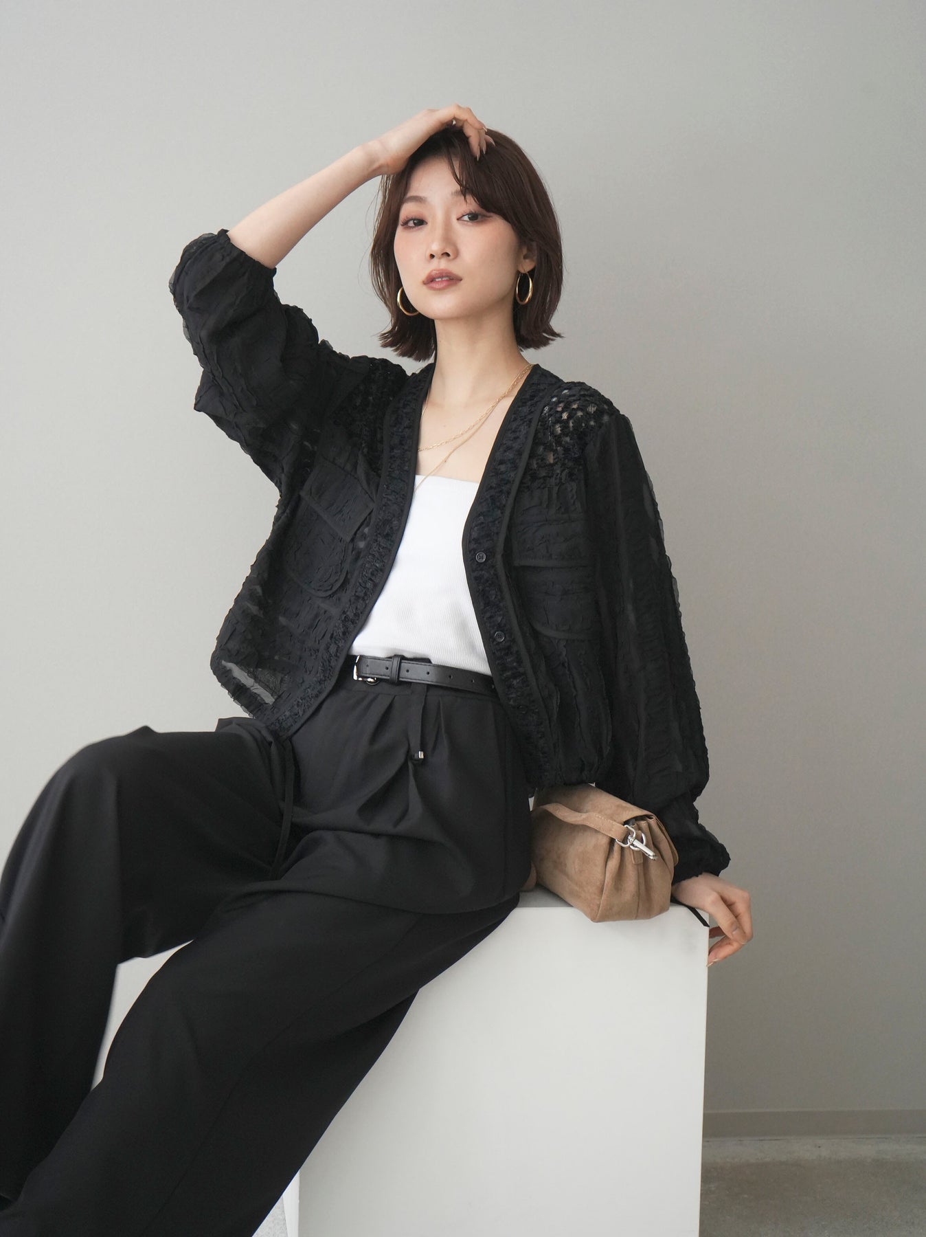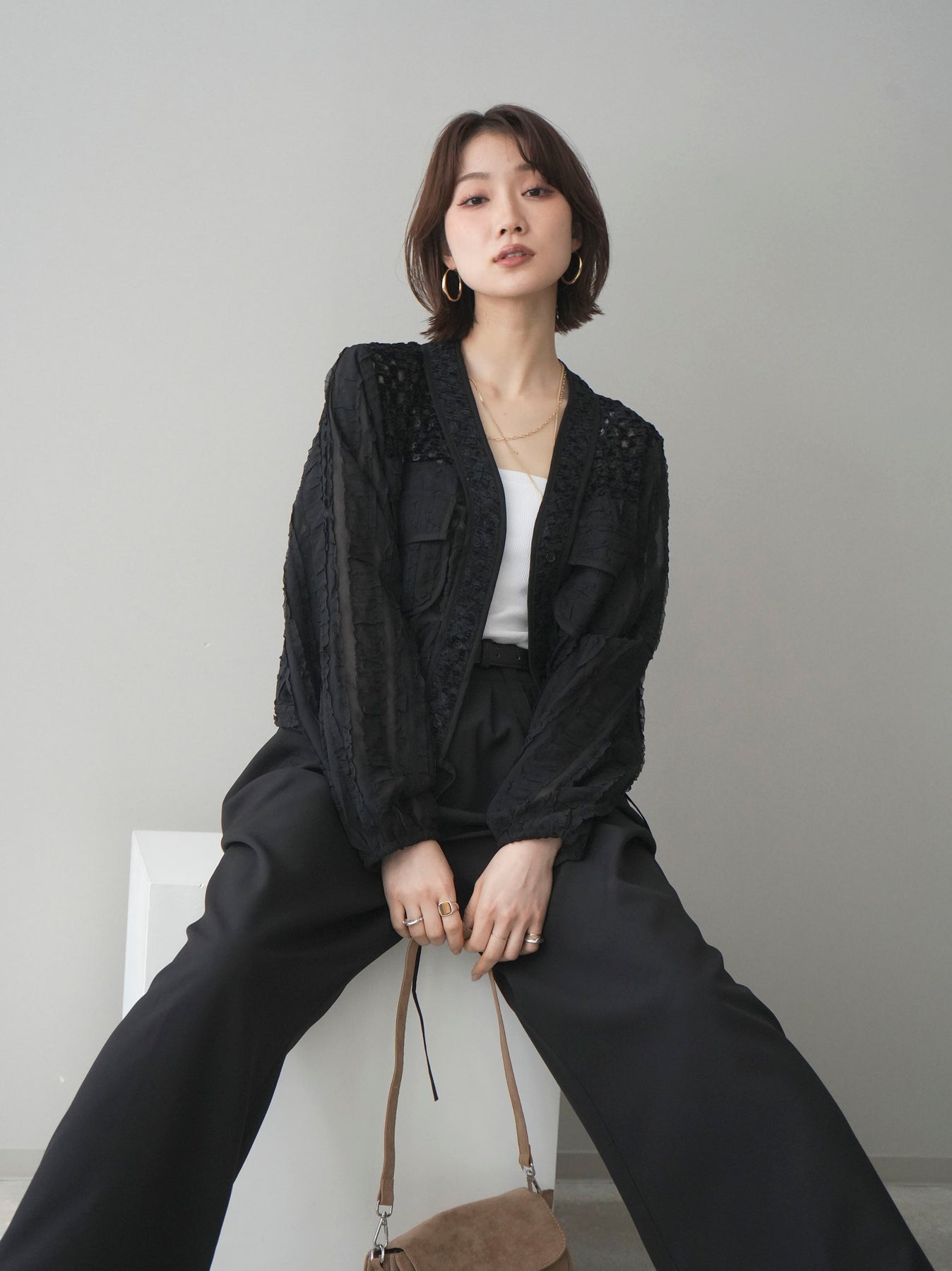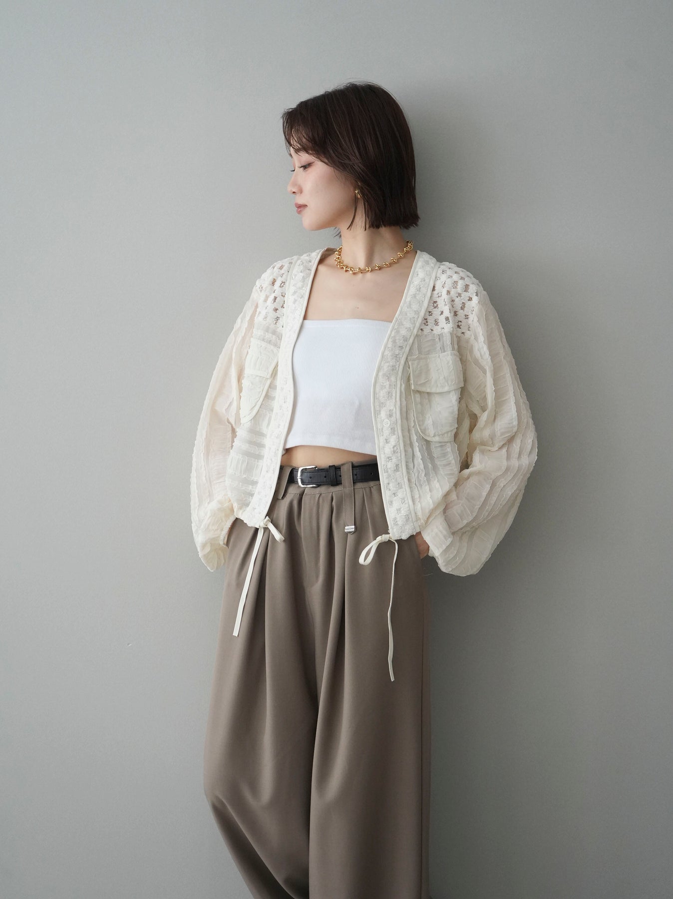 立体感のある表情豊かな素材が目を惹くシアーシャツブルゾン。ほんのり透ける軽やかな生地に、胸元のフラップポケットやリブ仕様の裾デザインを組み合わせることで、シャツのきちんと感とブルゾンのラフさをバランスよく両立。裾のドロストでシルエットの調整ができ、コンパクトにもボリューム感のある着こなしにもアレンジ可能。羽織りとしてはもちろん、ボタンを留めてトップス風に着用するのもおすすめです。 ※ボトムス、キャミソール(インナー)以外の商品は一律でインナーは付属していません
