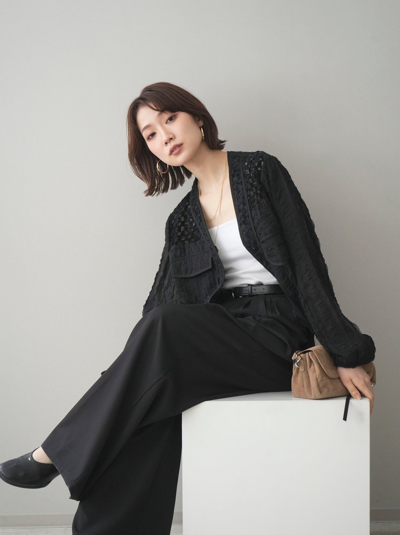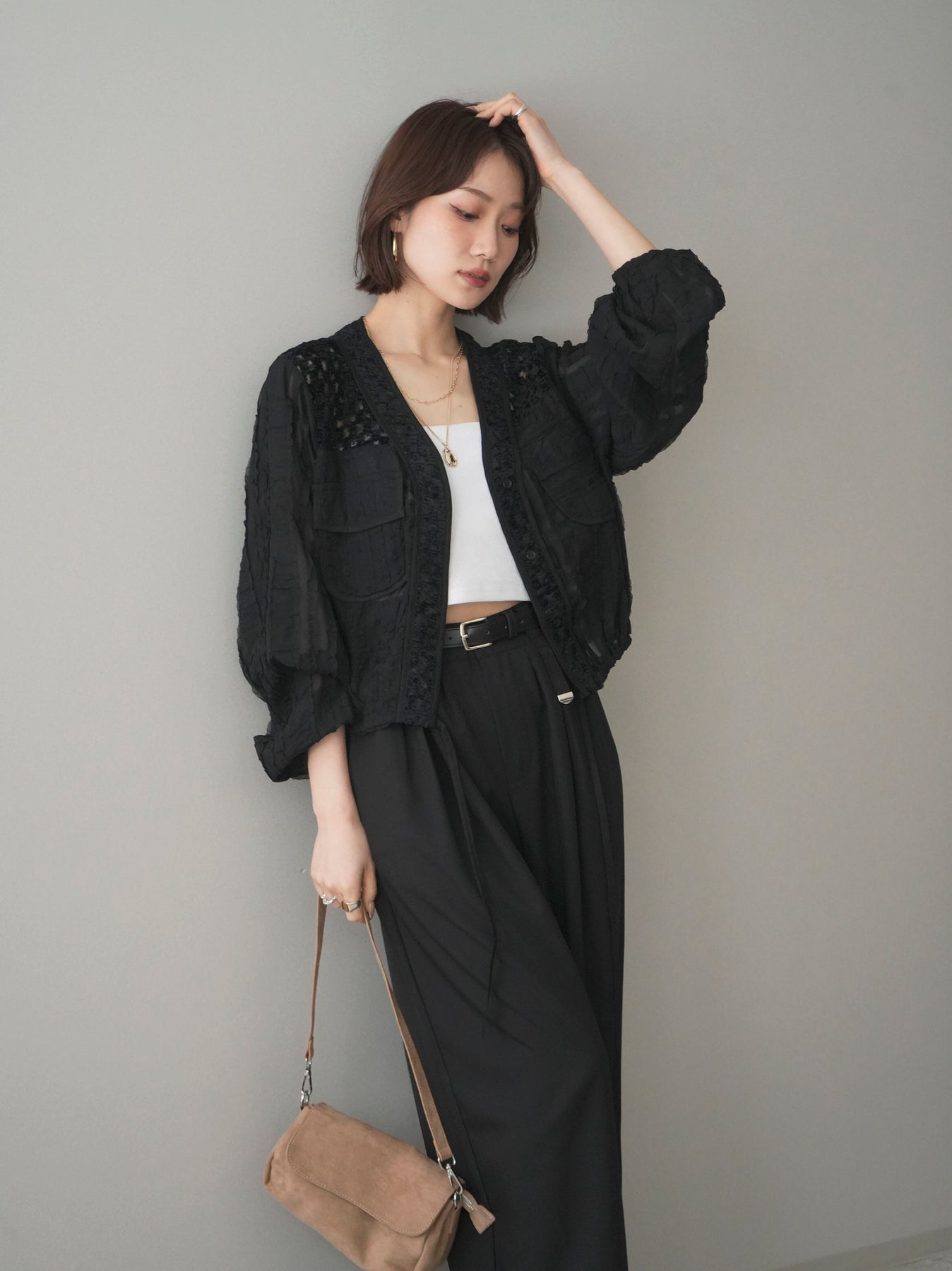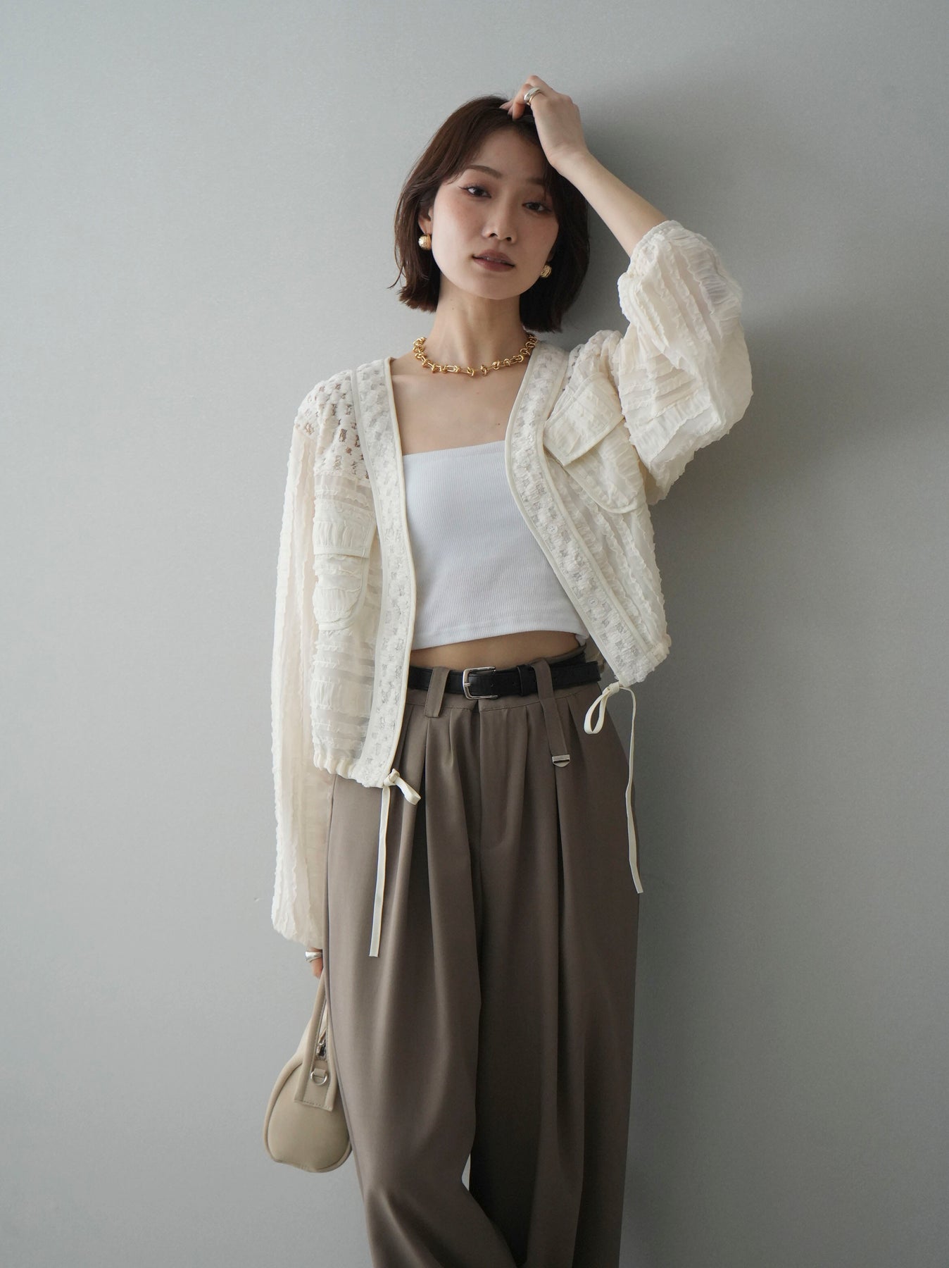 立体感のある表情豊かな素材が目を惹くシアーシャツブルゾン。ほんのり透ける軽やかな生地に、胸元のフラップポケットやリブ仕様の裾デザインを組み合わせることで、シャツのきちんと感とブルゾンのラフさをバランスよく両立。裾のドロストでシルエットの調整ができ、コンパクトにもボリューム感のある着こなしにもアレンジ可能。羽織りとしてはもちろん、ボタンを留めてトップス風に着用するのもおすすめです。 ※ボトムス、キャミソール(インナー)以外の商品は一律でインナーは付属していません