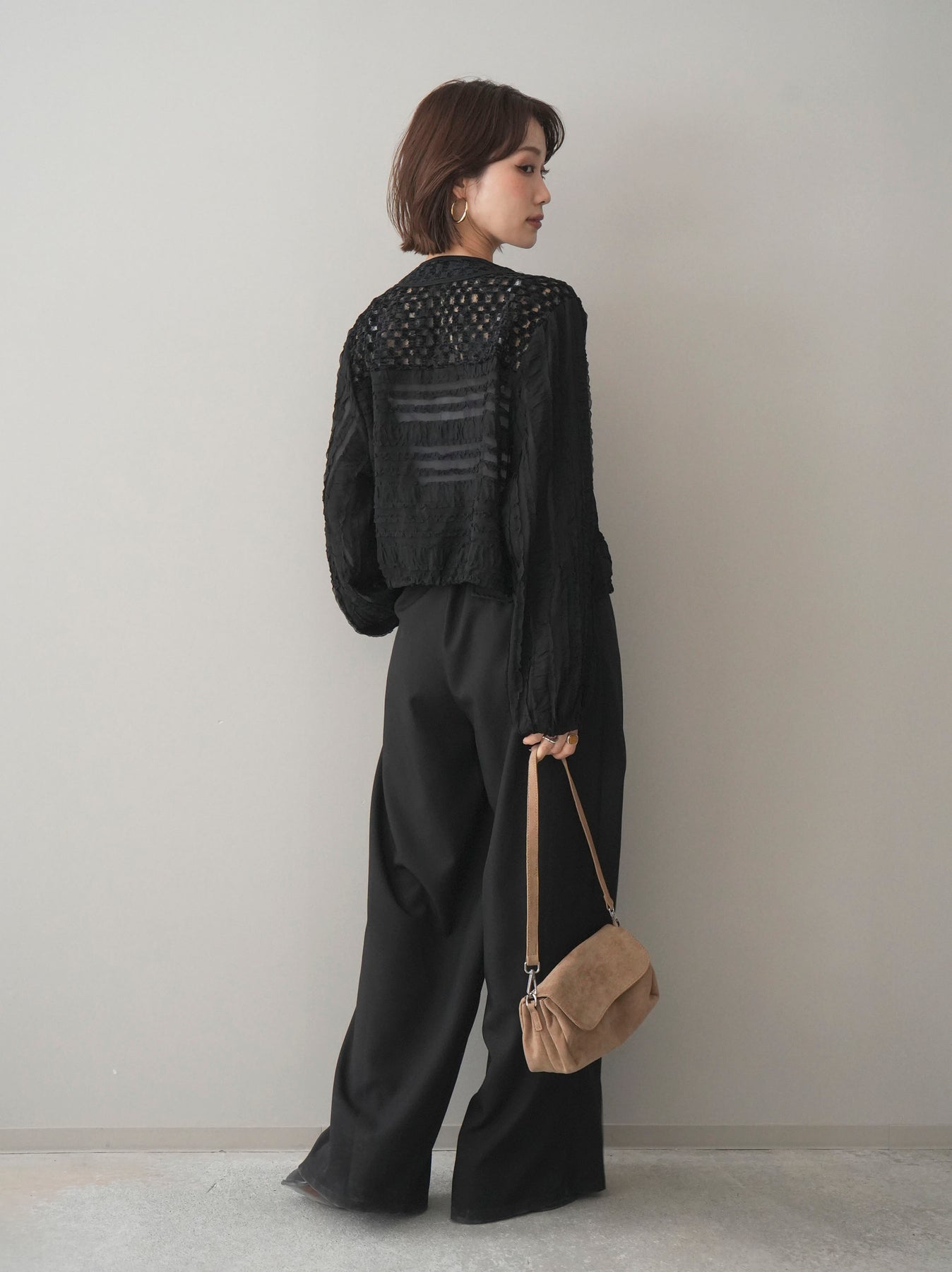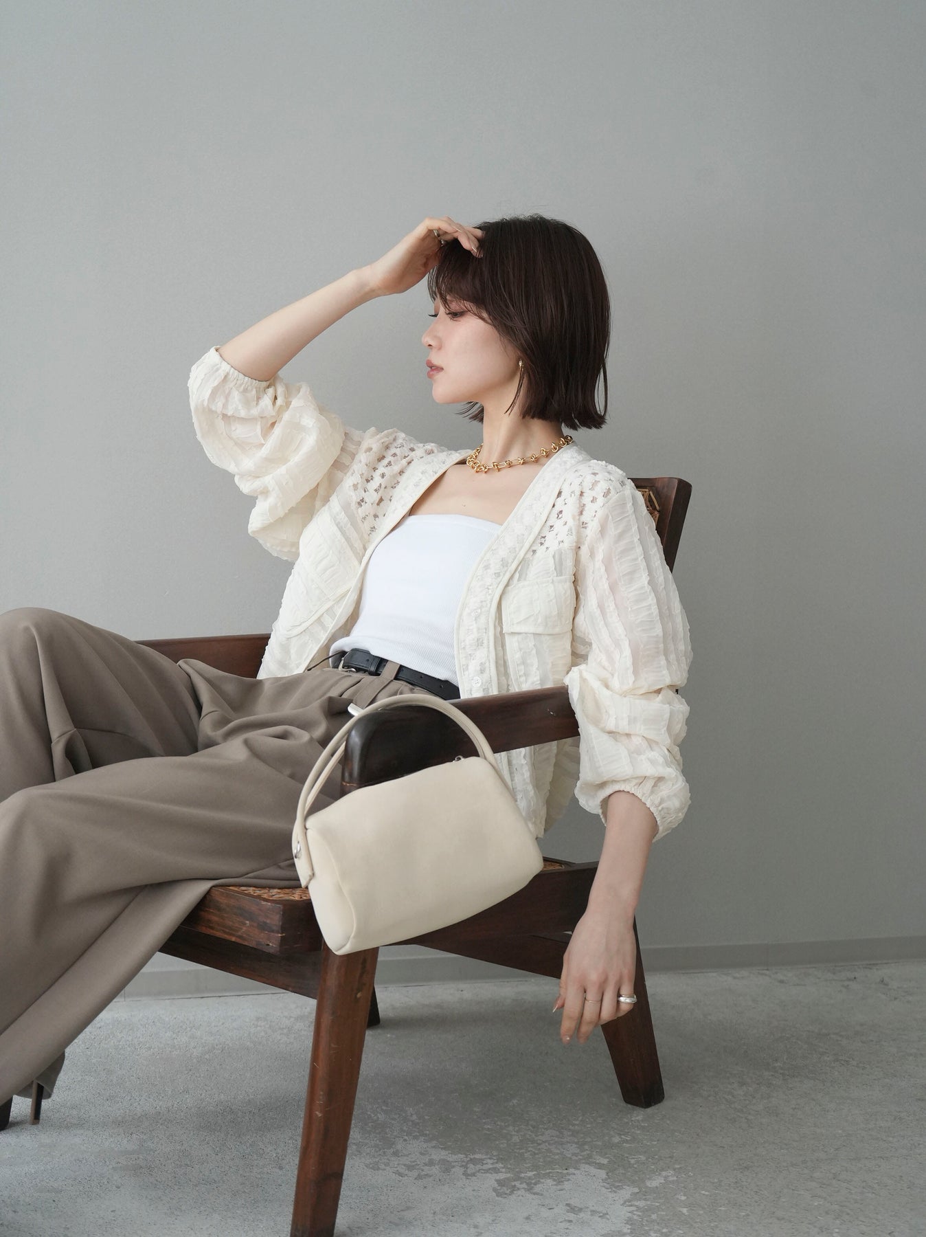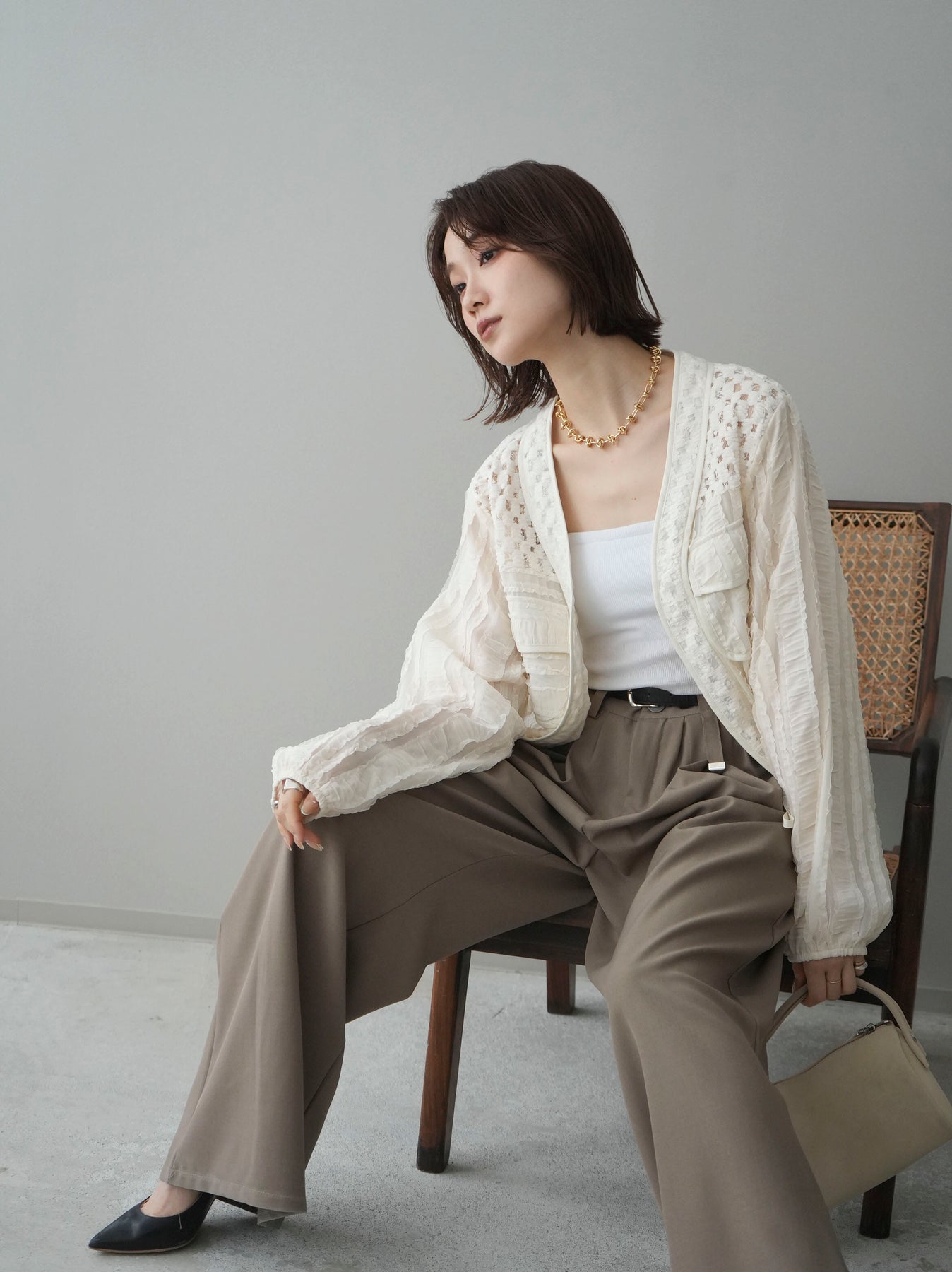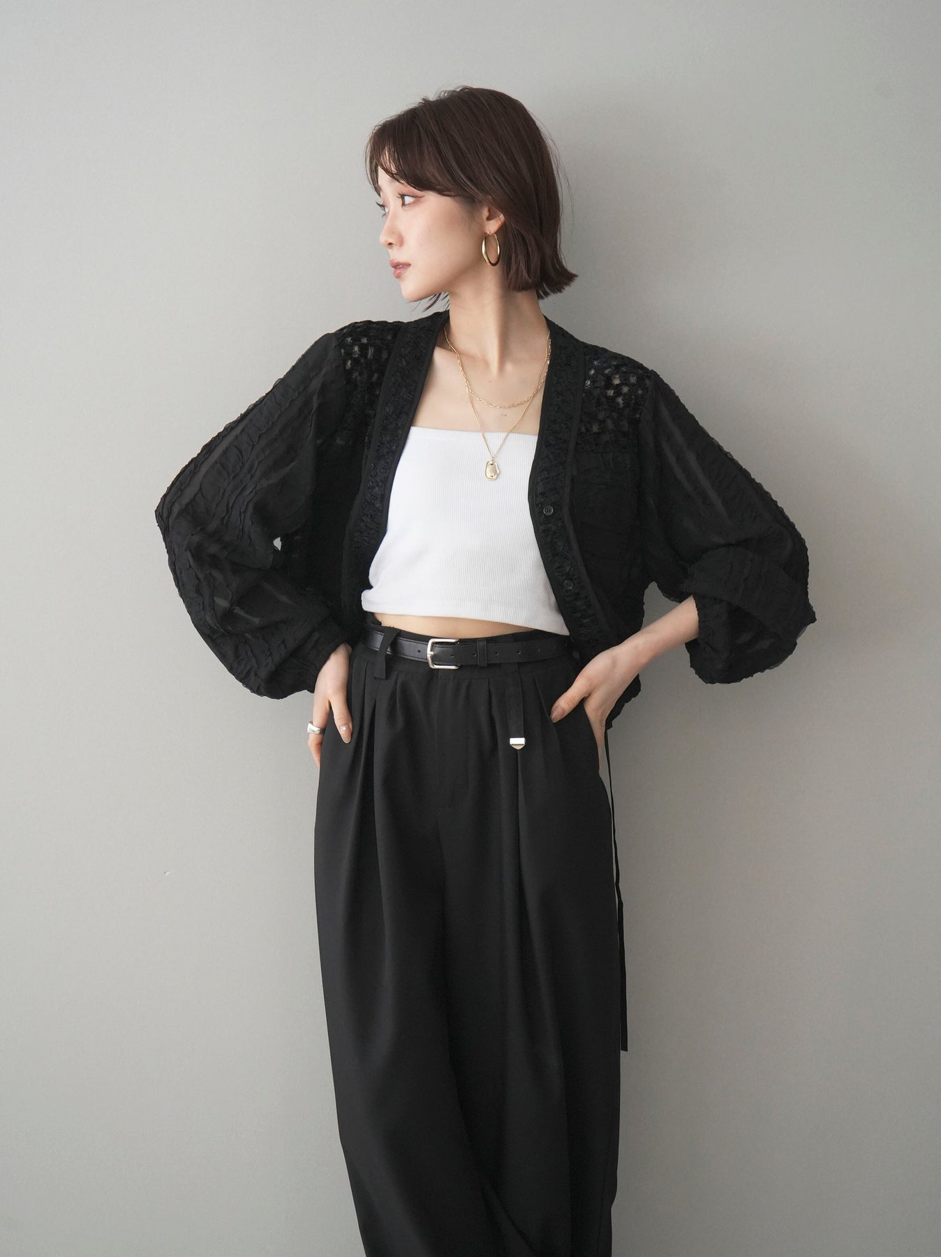 立体感のある表情豊かな素材が目を惹くシアーシャツブルゾン。ほんのり透ける軽やかな生地に、胸元のフラップポケットやリブ仕様の裾デザインを組み合わせることで、シャツのきちんと感とブルゾンのラフさをバランスよく両立。裾のドロストでシルエットの調整ができ、コンパクトにもボリューム感のある着こなしにもアレンジ可能。羽織りとしてはもちろん、ボタンを留めてトップス風に着用するのもおすすめです。 ※ボトムス、キャミソール(インナー)以外の商品は一律でインナーは付属していません