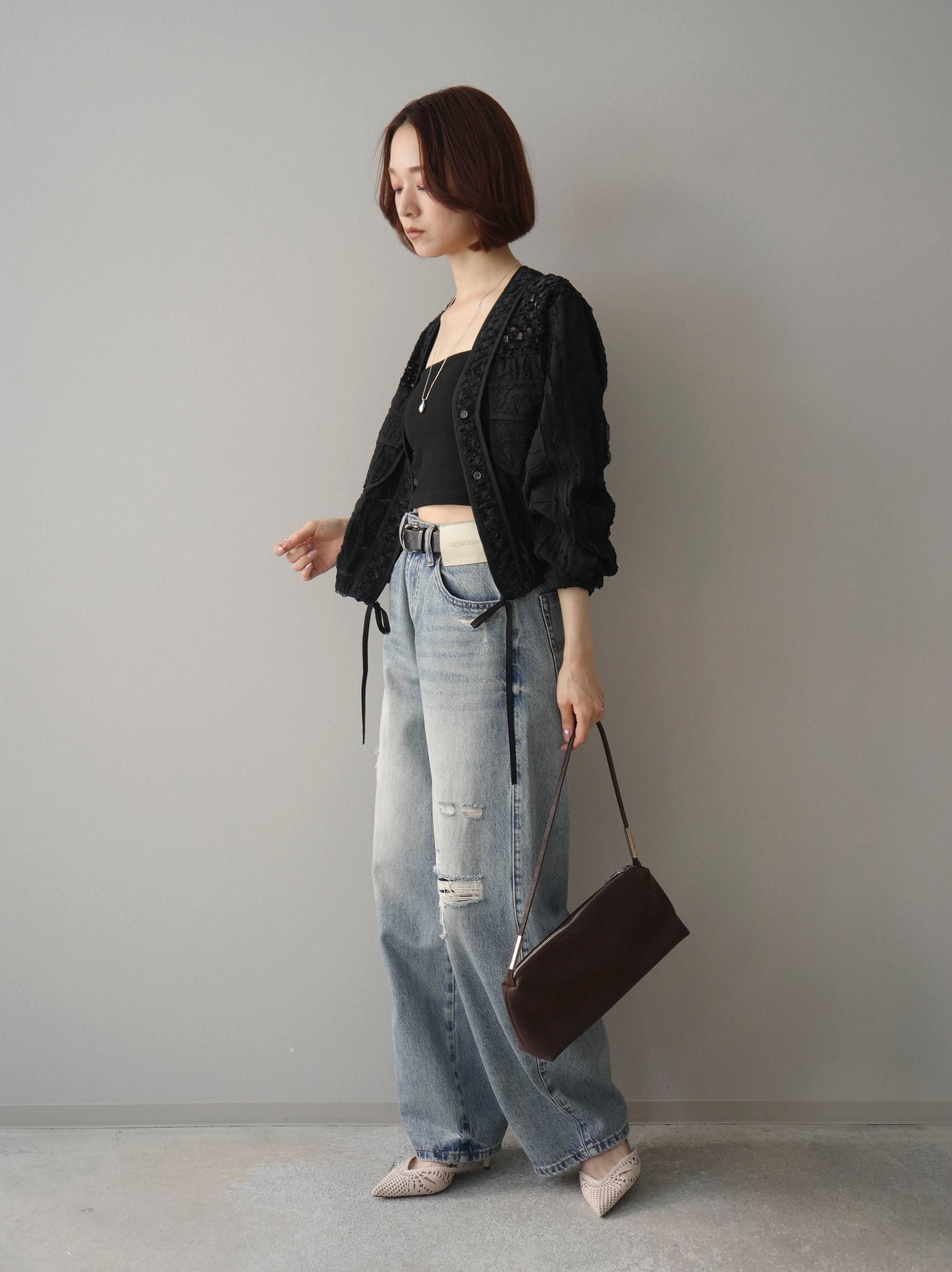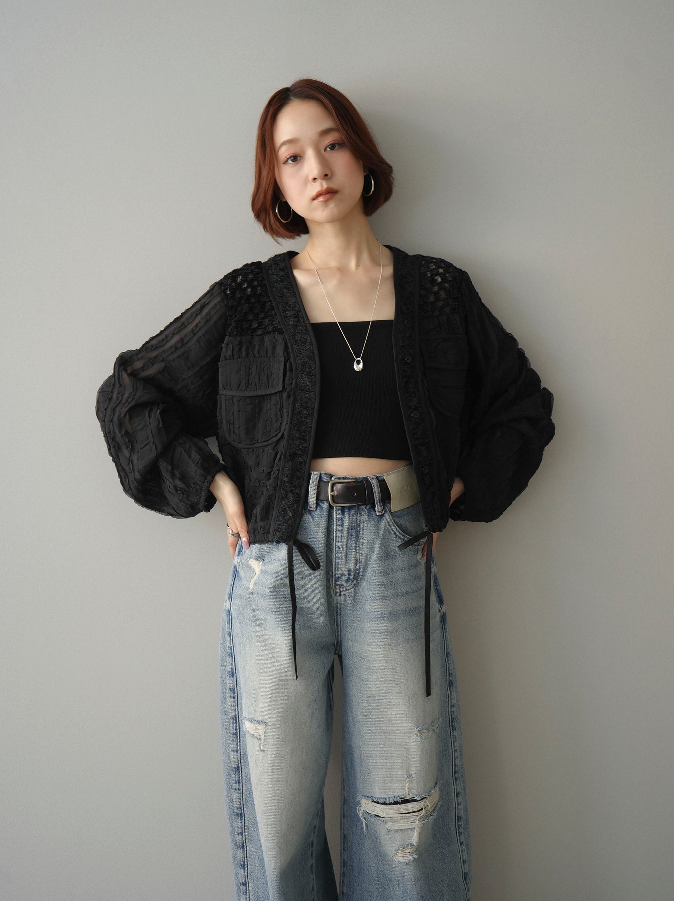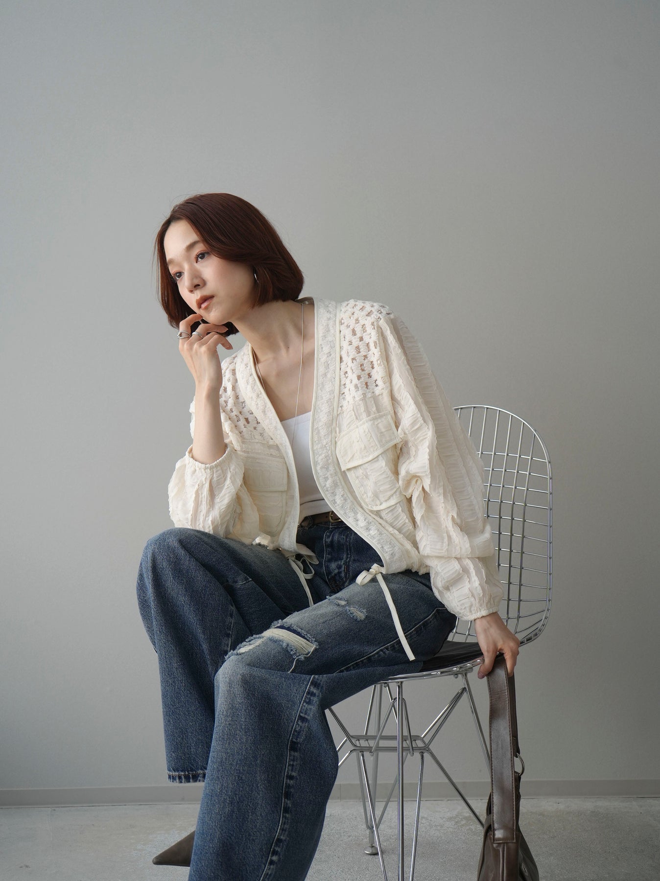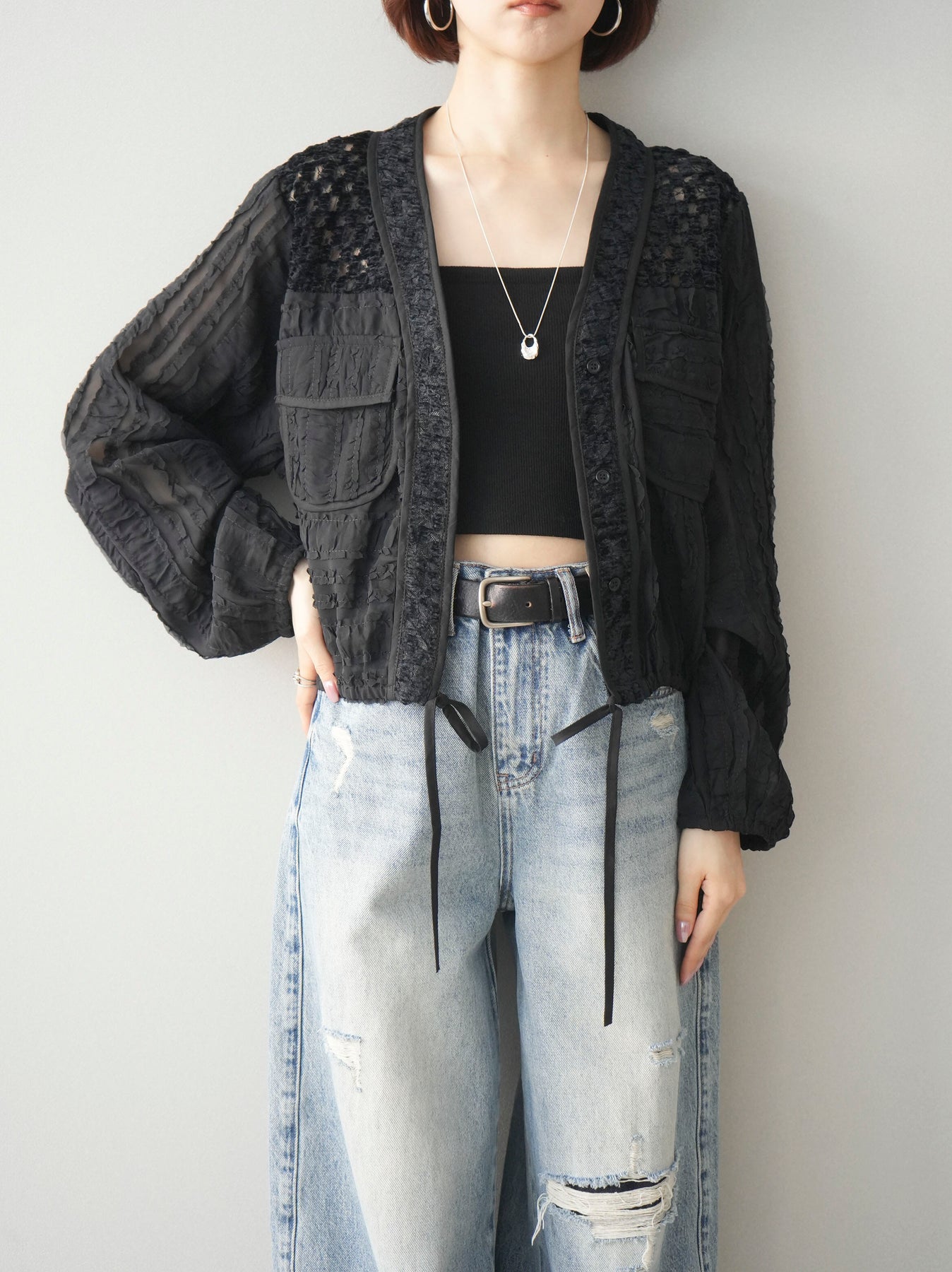 [SET]パッチワークシアーフリルブルゾン+ダメージデニムセミワイドパンツ(2set)