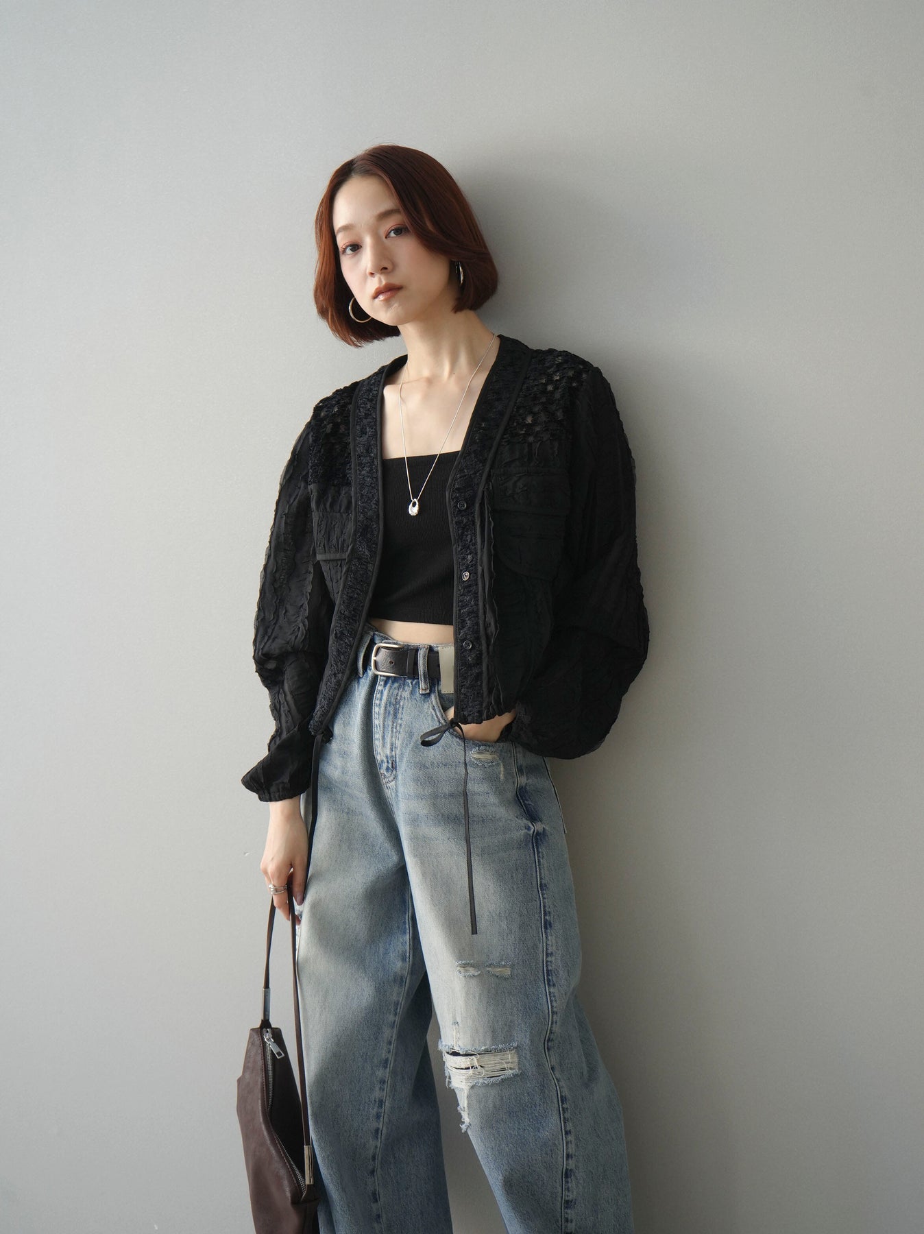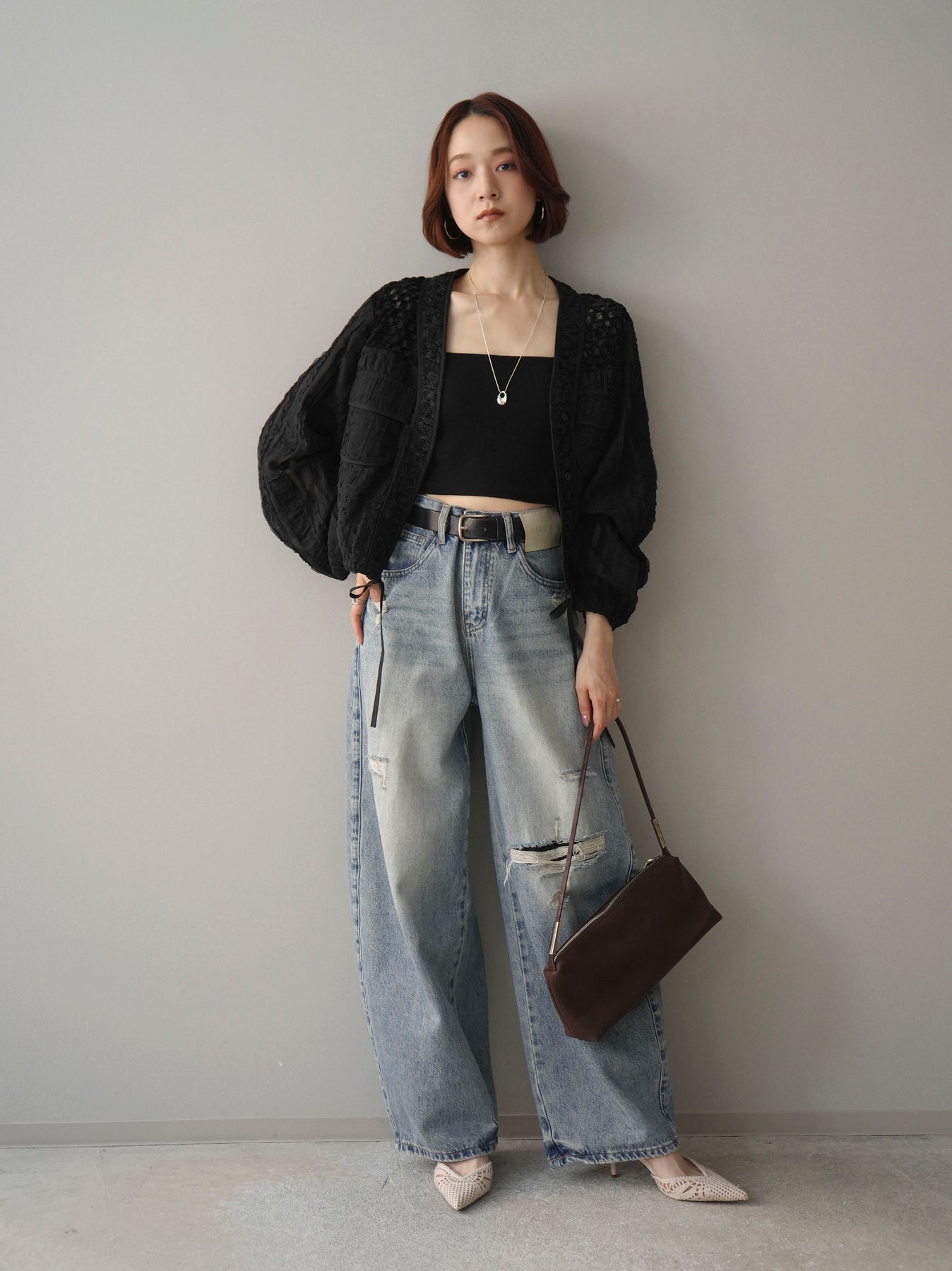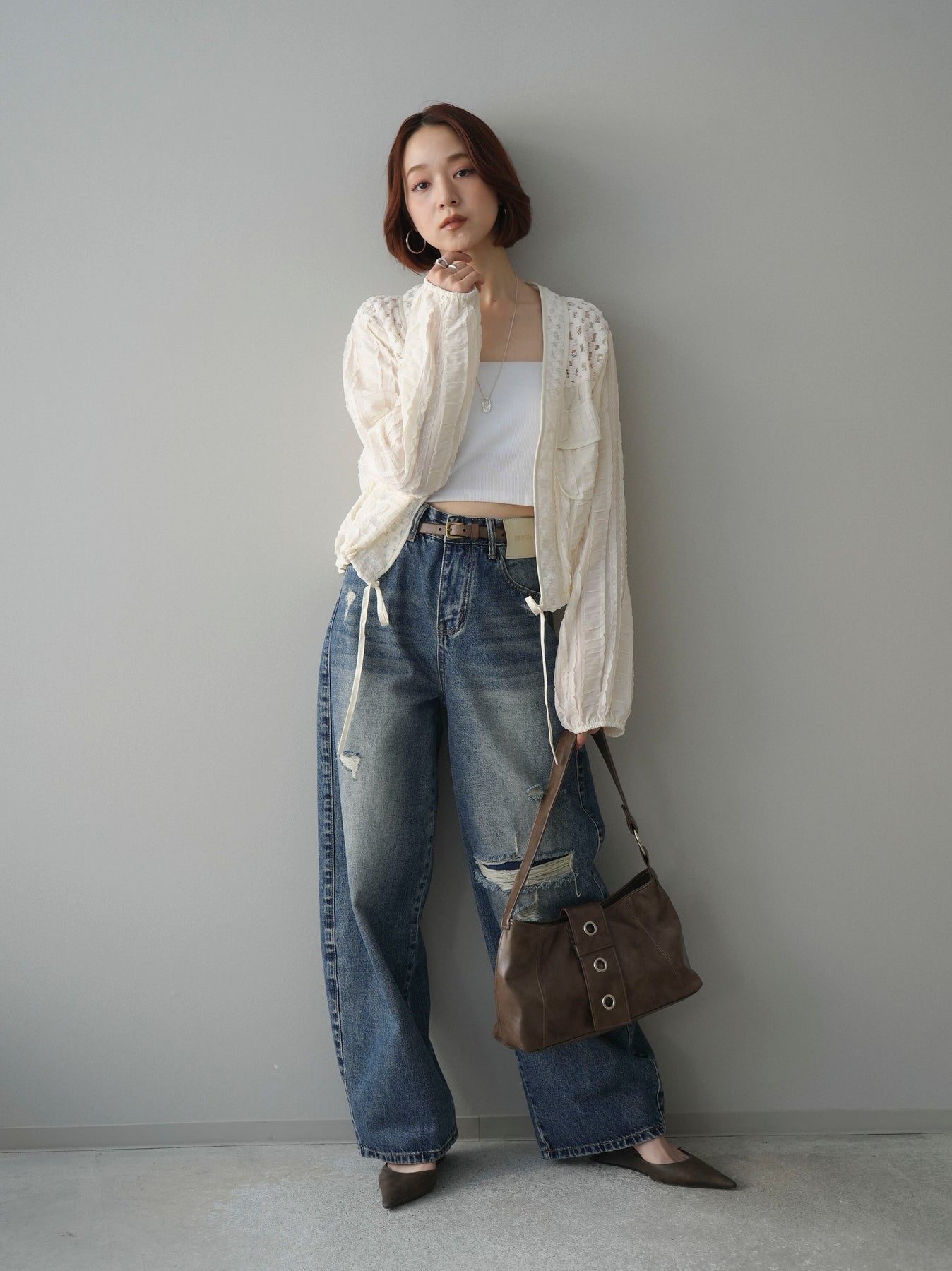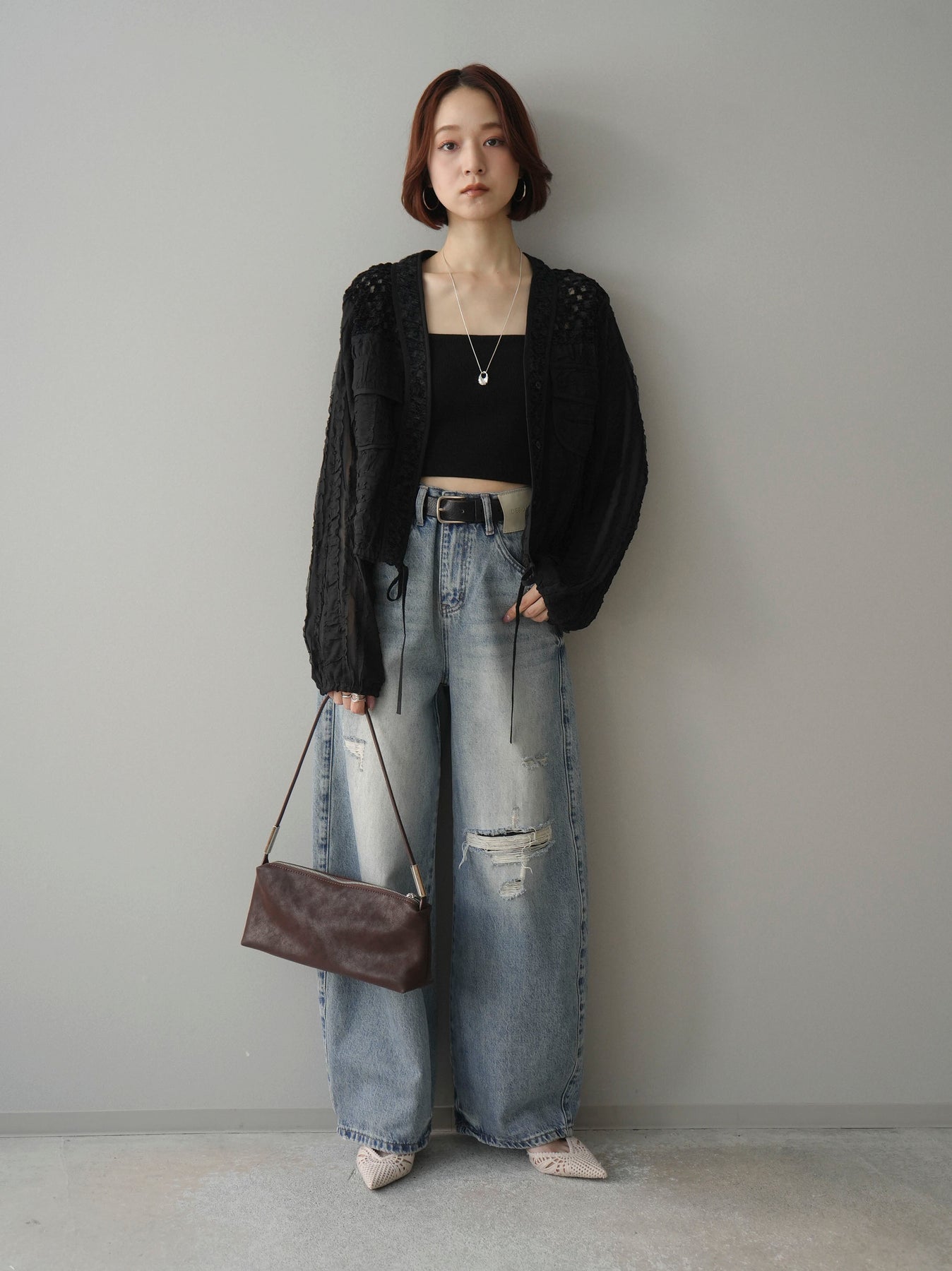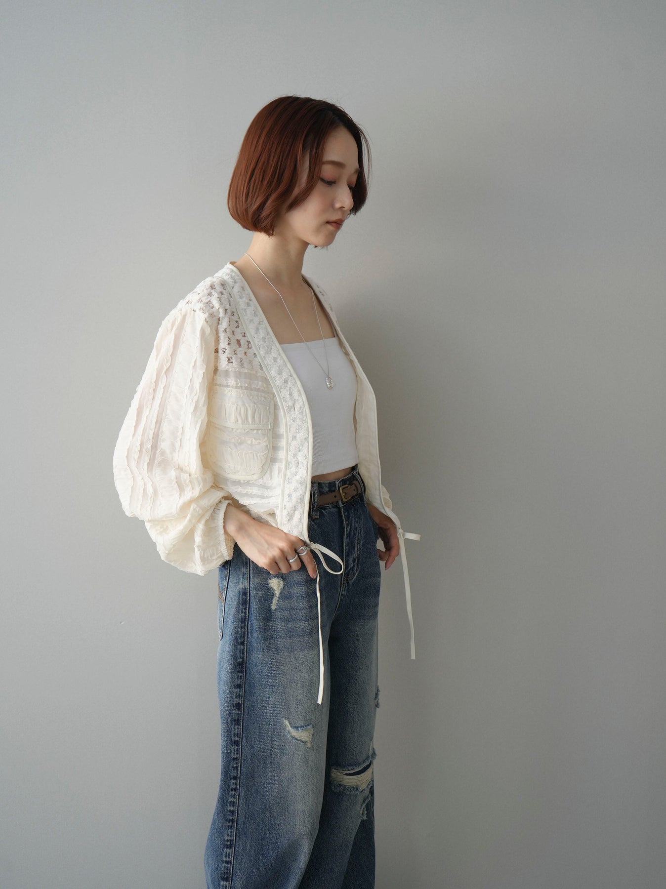 [SET]パッチワークシアーフリルブルゾン+ダメージデニムセミワイドパンツ(2set)
