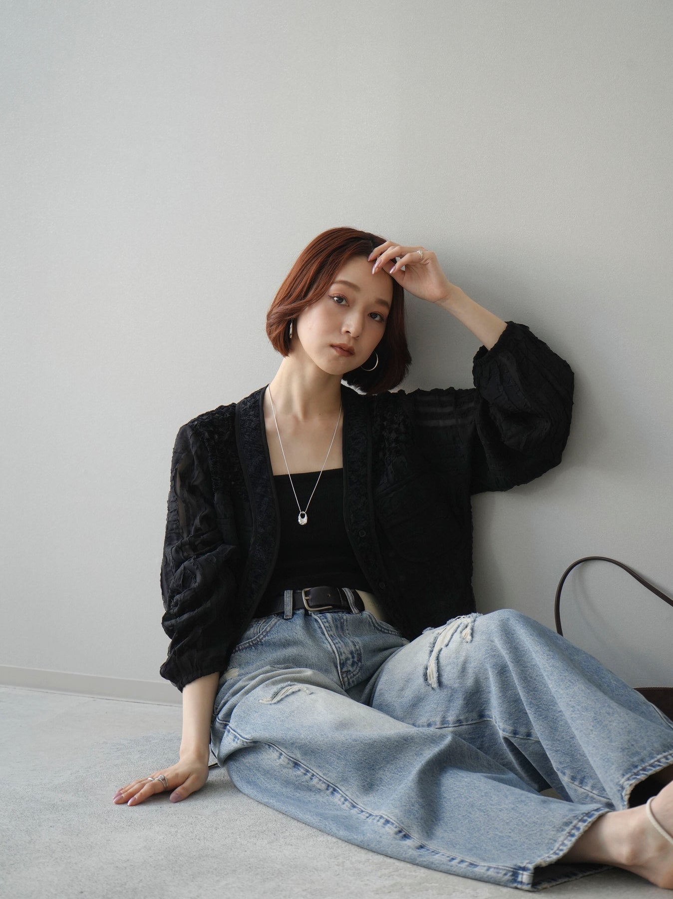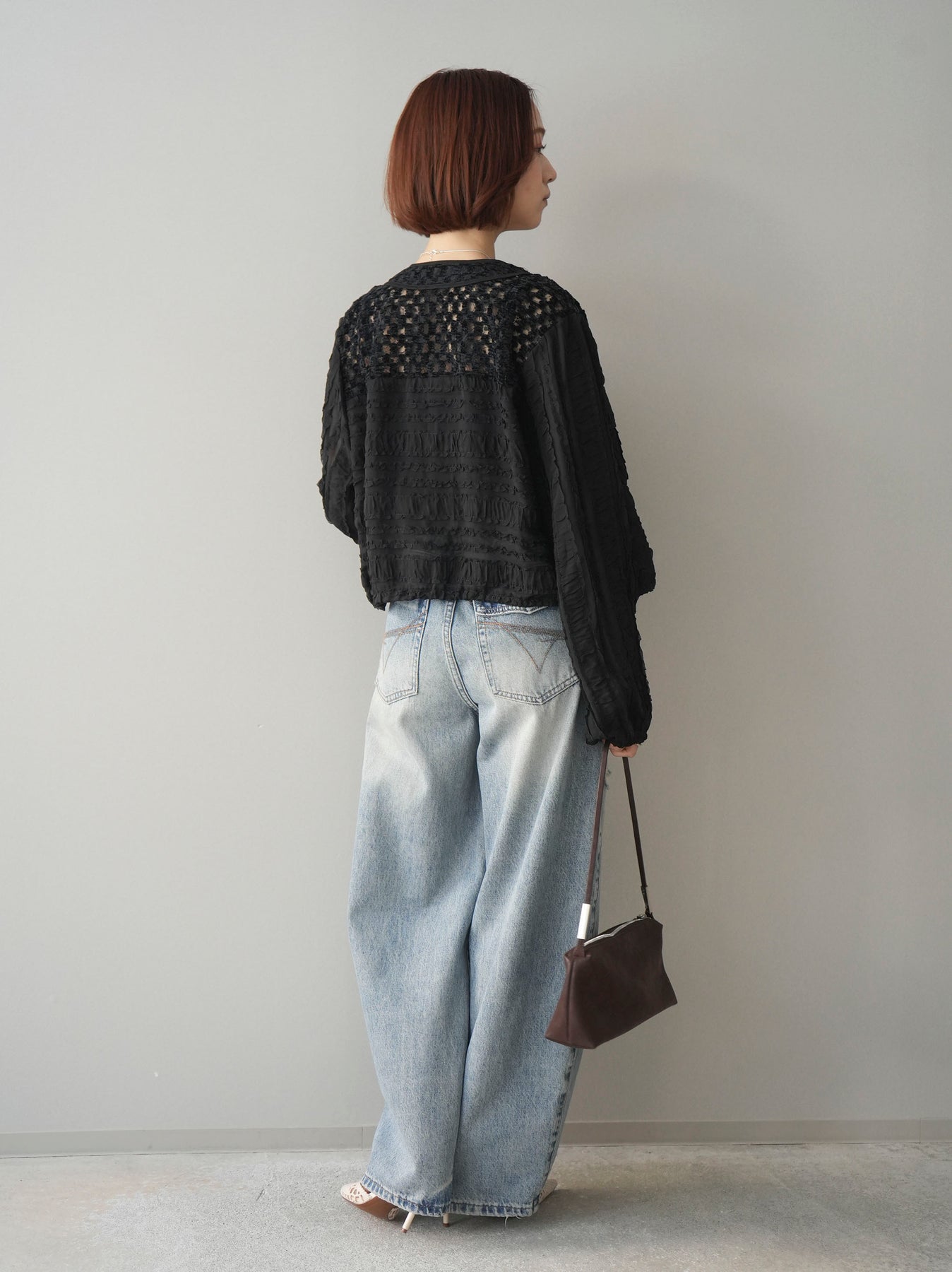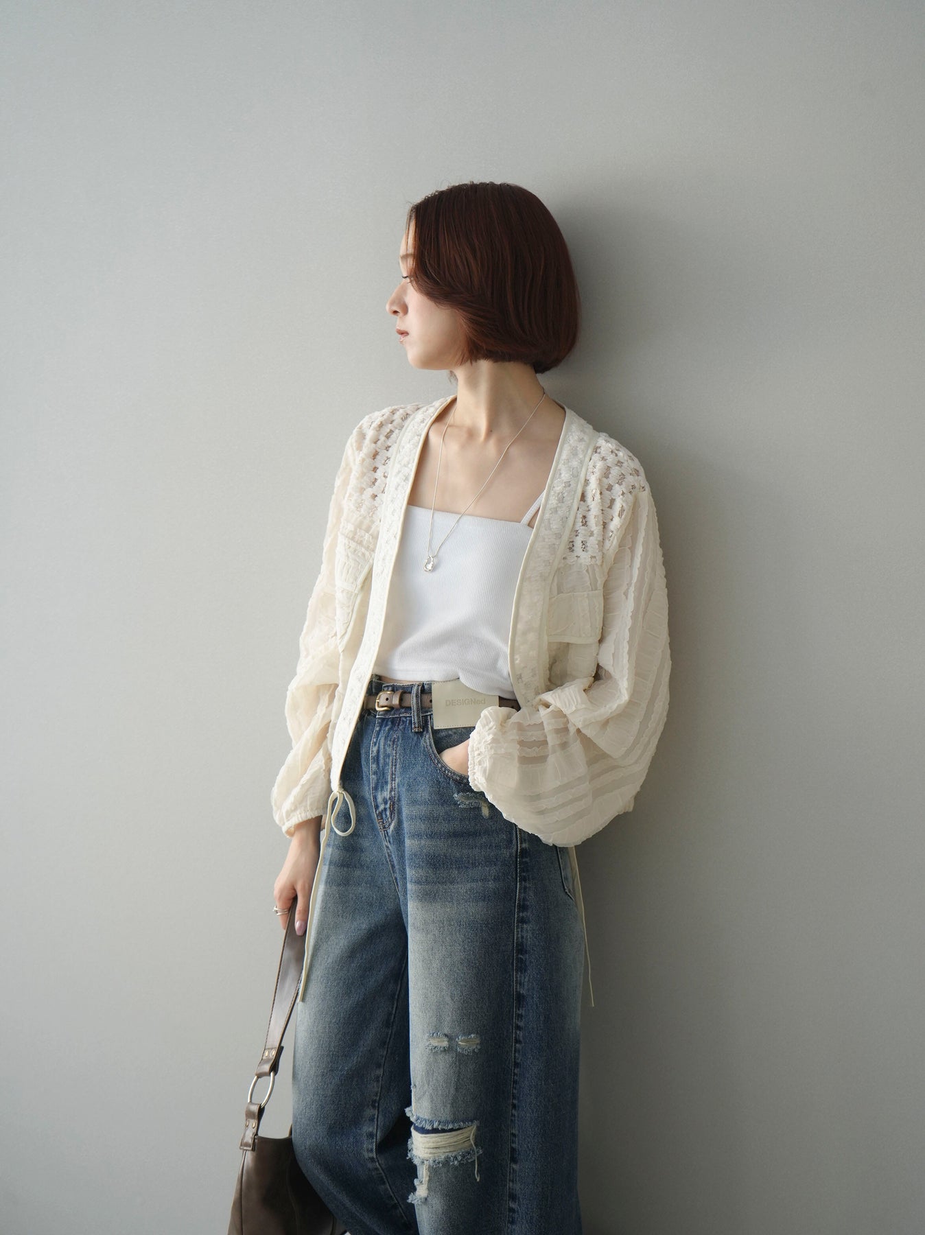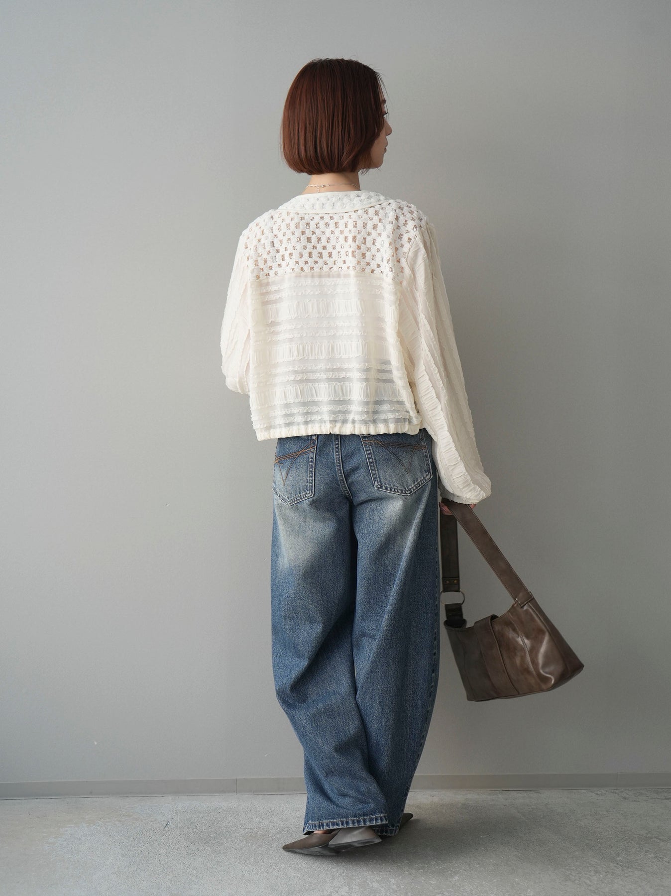 [SET]パッチワークシアーフリルブルゾン+ダメージデニムセミワイドパンツ(2set)
