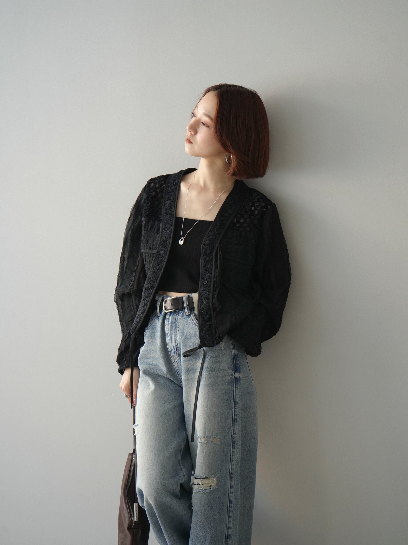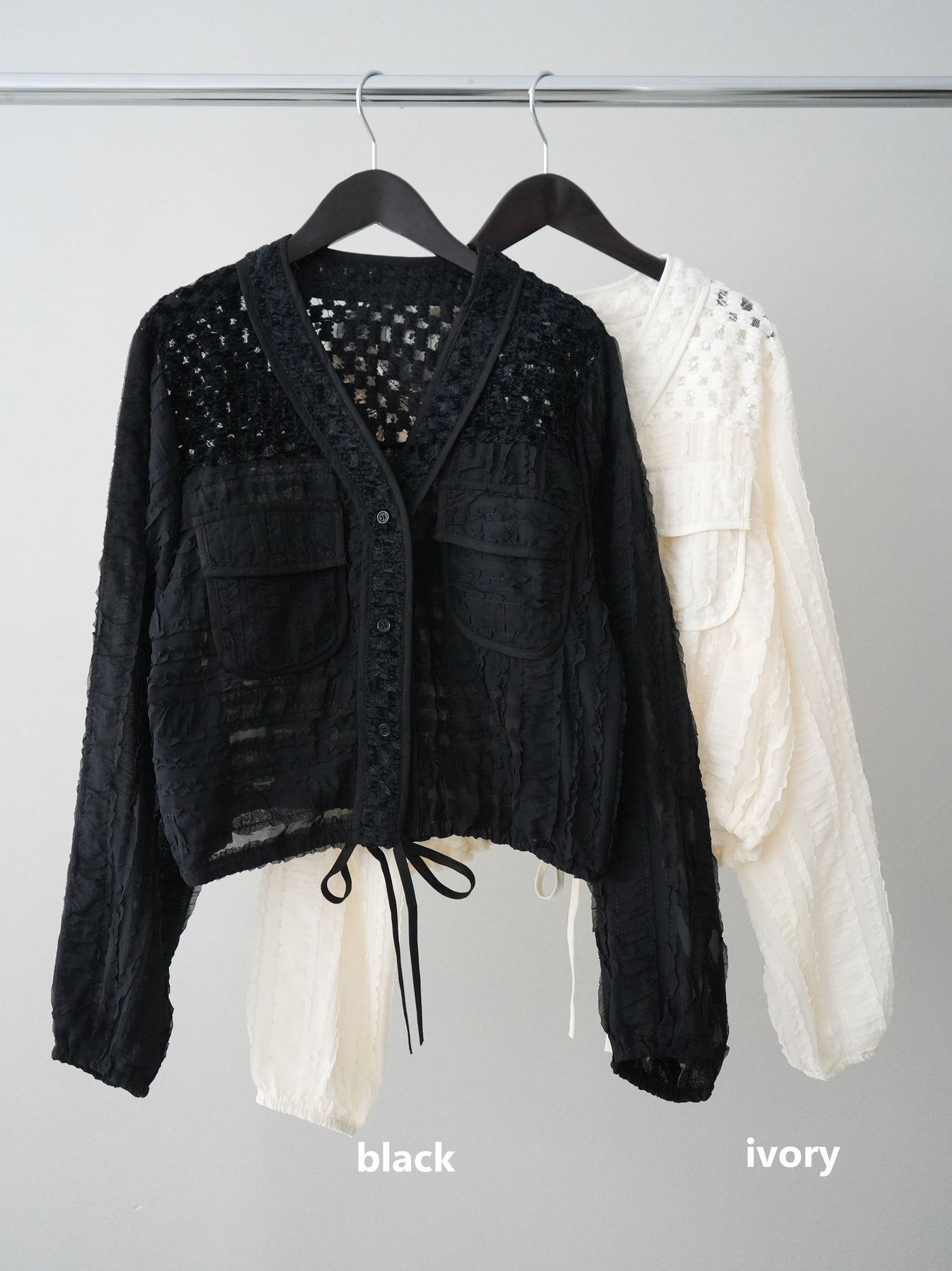 立体感のある表情豊かな素材が目を惹くシアーシャツブルゾン。ほんのり透ける軽やかな生地に、胸元のフラップポケットやリブ仕様の裾デザインを組み合わせることで、シャツのきちんと感とブルゾンのラフさをバランスよく両立。裾のドロストでシルエットの調整ができ、コンパクトにもボリューム感のある着こなしにもアレンジ可能。羽織りとしてはもちろん、ボタンを留めてトップス風に着用するのもおすすめです。 ※ボトムス、キャミソール(インナー)以外の商品は一律でインナーは付属していません