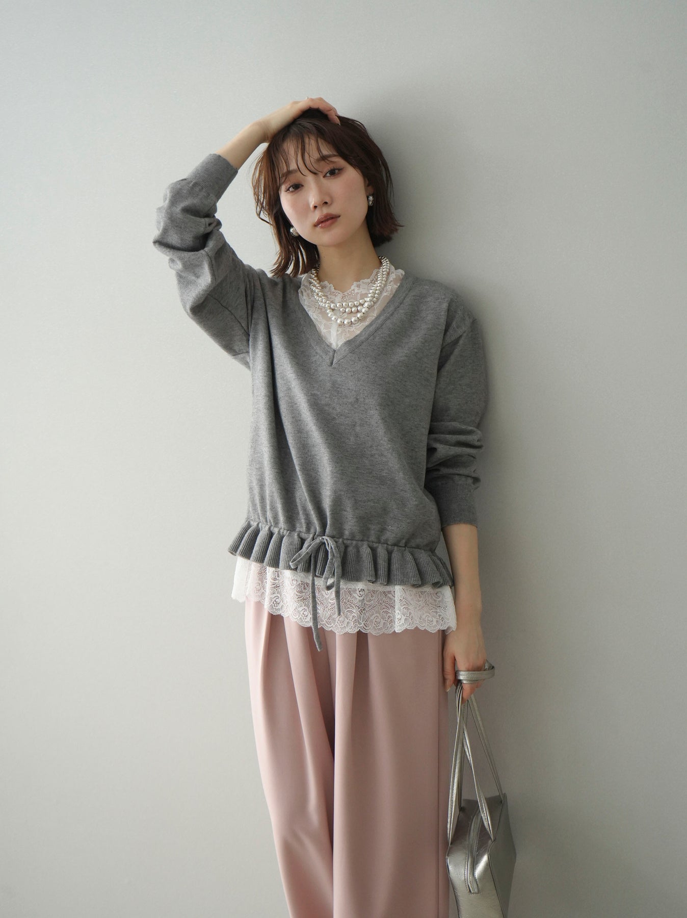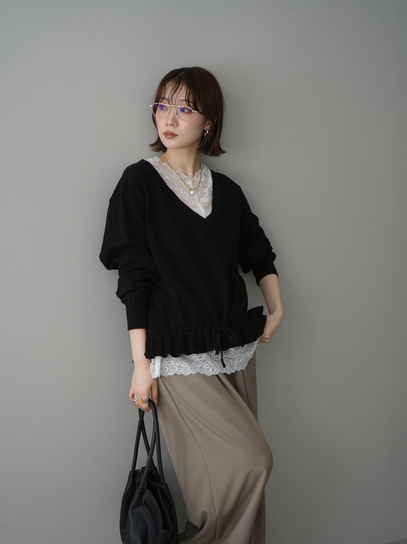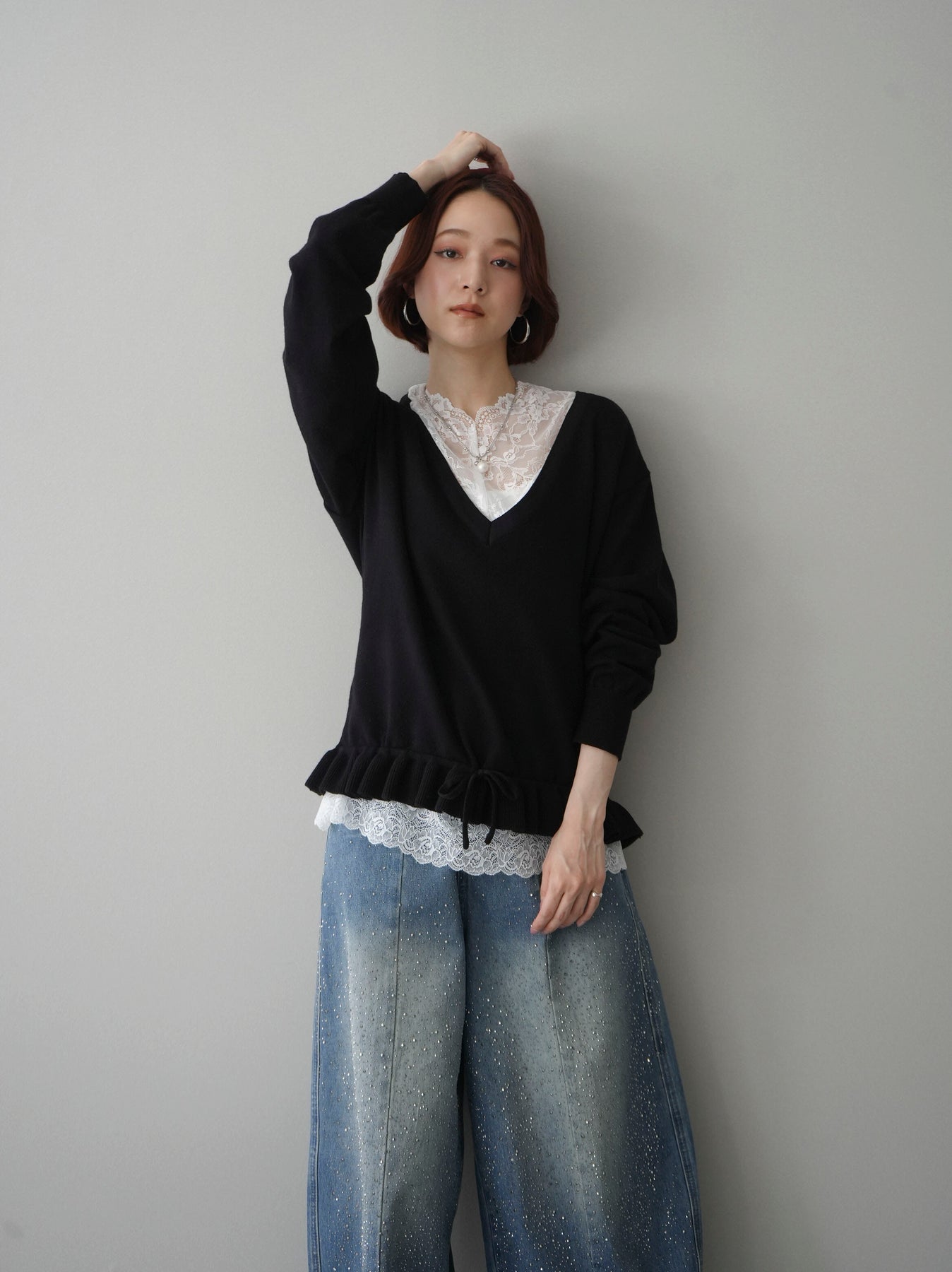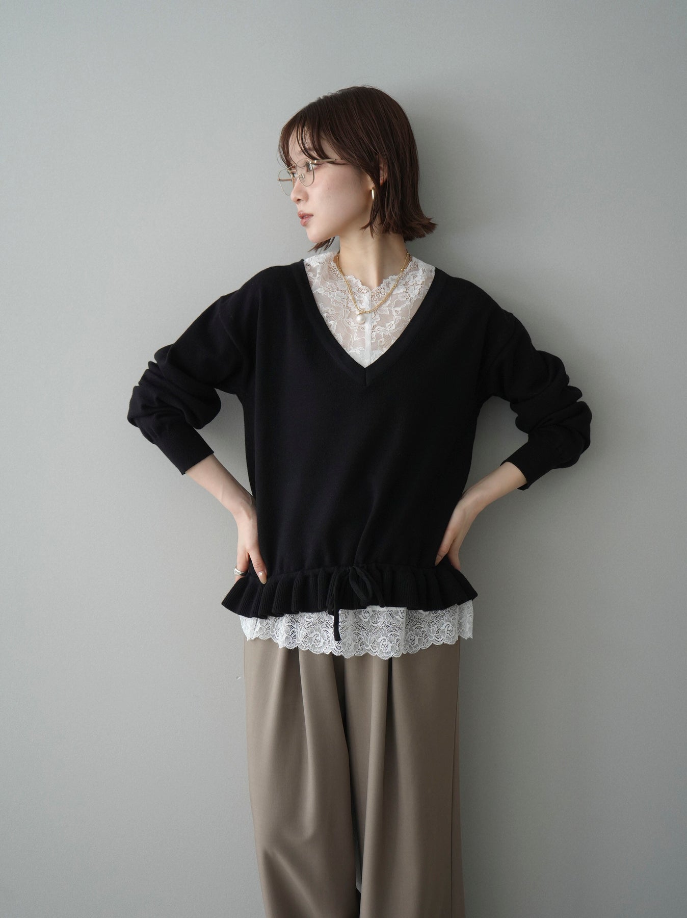 繊細なレースインナーとニットをレイヤードした、女性らしさが引き立つアンサンブル。深めのVネックから覗くレースが顔まわりを華やかに演出し、裾からさりげなく見えるレースデザインがスタイリングに奥行きをプラスします。ニットは程よくゆとりのあるシルエットで抜け感があり、単品使いでも着回しやすい一着。デニムでカジュアルに、スラックスやスカートで上品にと幅広いコーディネートが楽しめます。
