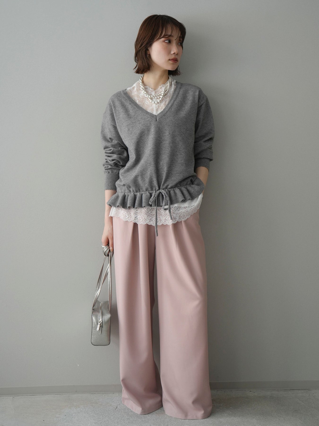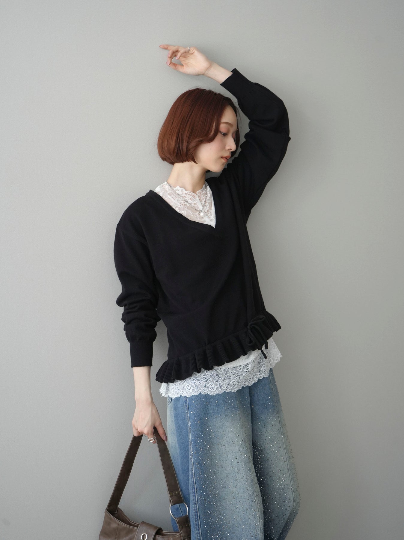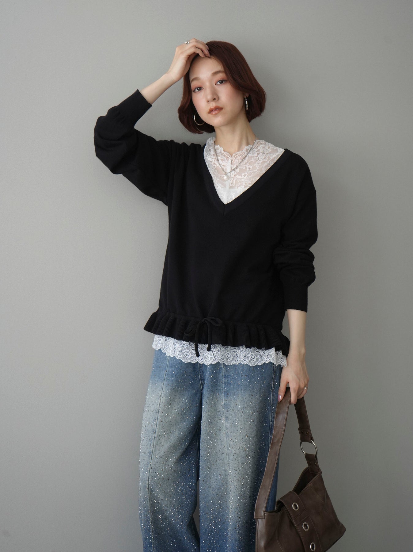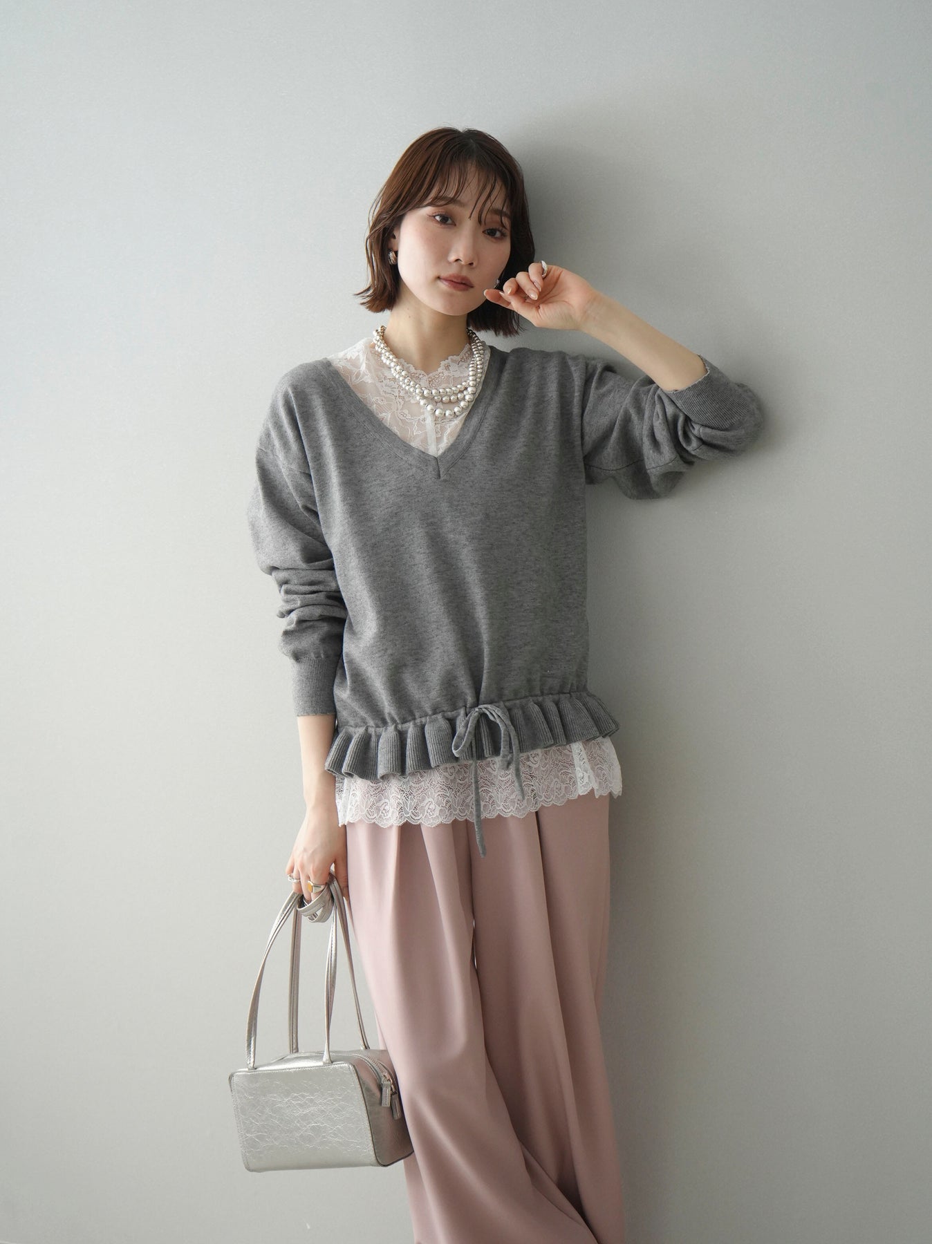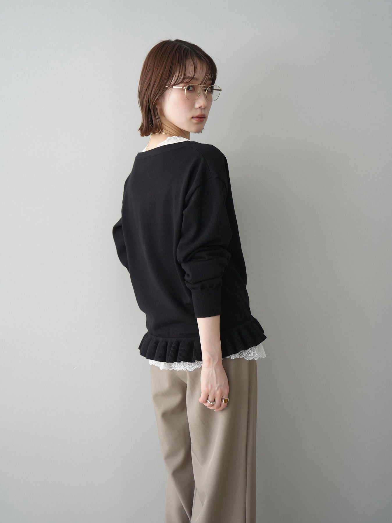 繊細なレースインナーとニットをレイヤードした、女性らしさが引き立つアンサンブル。深めのVネックから覗くレースが顔まわりを華やかに演出し、裾からさりげなく見えるレースデザインがスタイリングに奥行きをプラスします。ニットは程よくゆとりのあるシルエットで抜け感があり、単品使いでも着回しやすい一着。デニムでカジュアルに、スラックスやスカートで上品にと幅広いコーディネートが楽しめます。