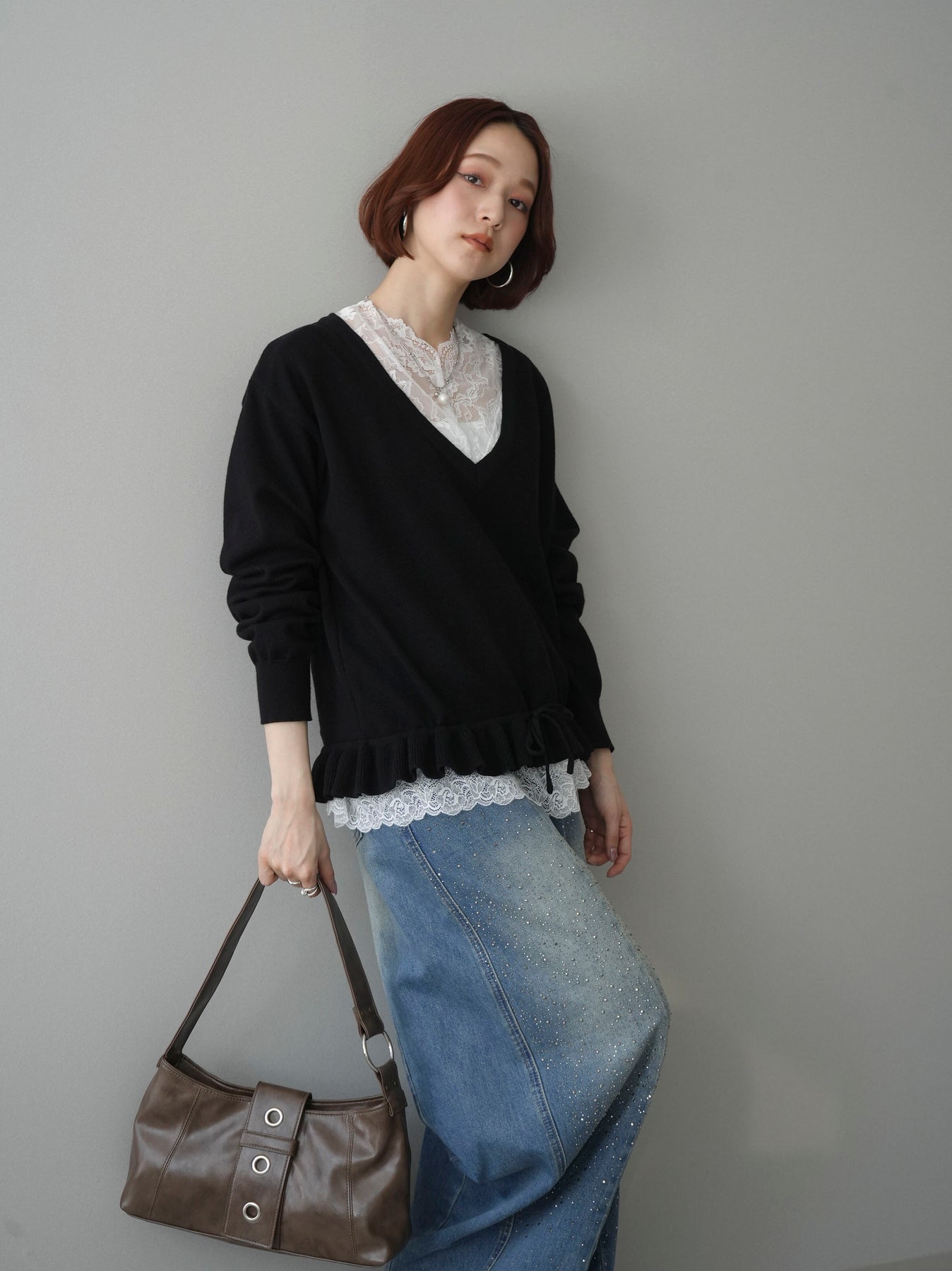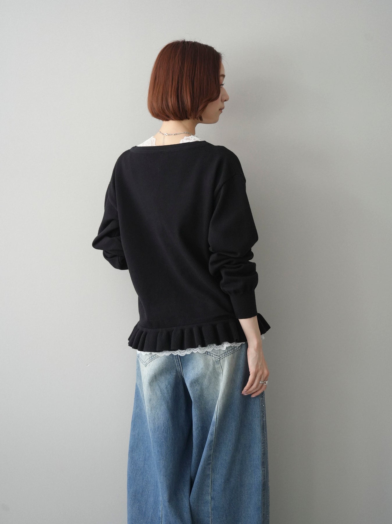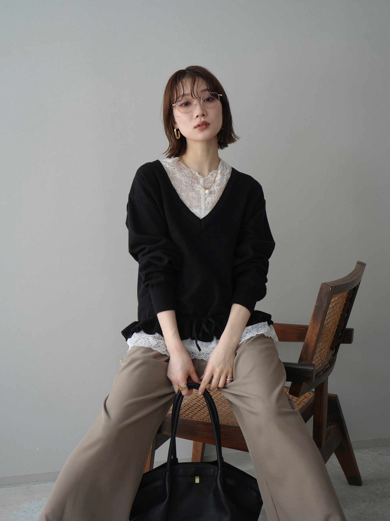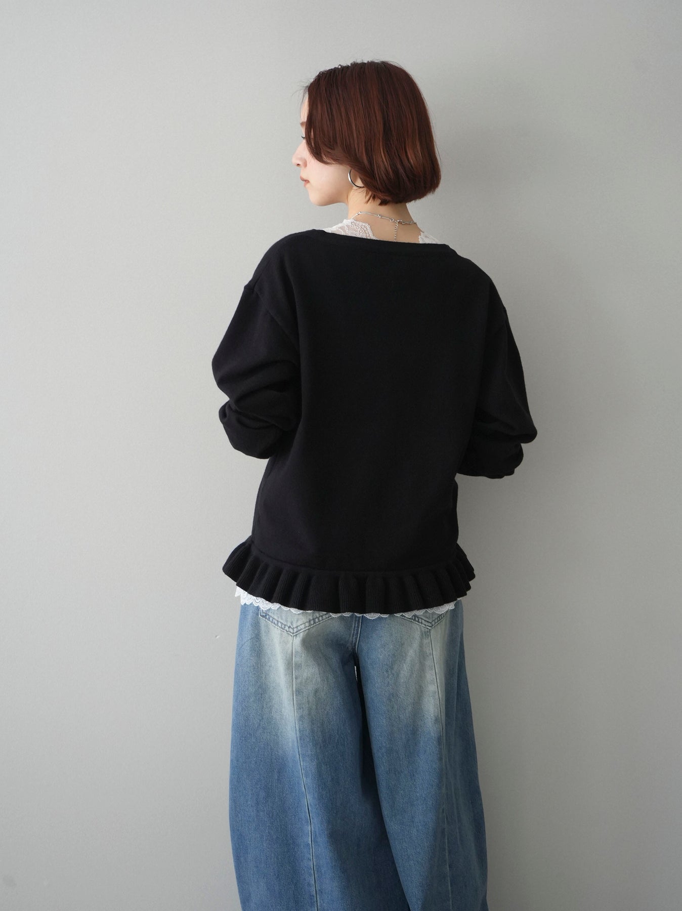 繊細なレースインナーとニットをレイヤードした、女性らしさが引き立つアンサンブル。深めのVネックから覗くレースが顔まわりを華やかに演出し、裾からさりげなく見えるレースデザインがスタイリングに奥行きをプラスします。ニットは程よくゆとりのあるシルエットで抜け感があり、単品使いでも着回しやすい一着。デニムでカジュアルに、スラックスやスカートで上品にと幅広いコーディネートが楽しめます。