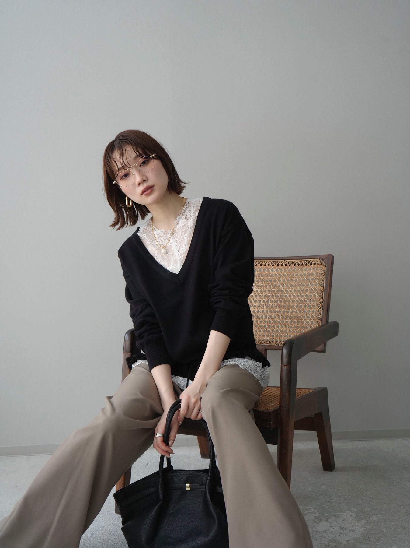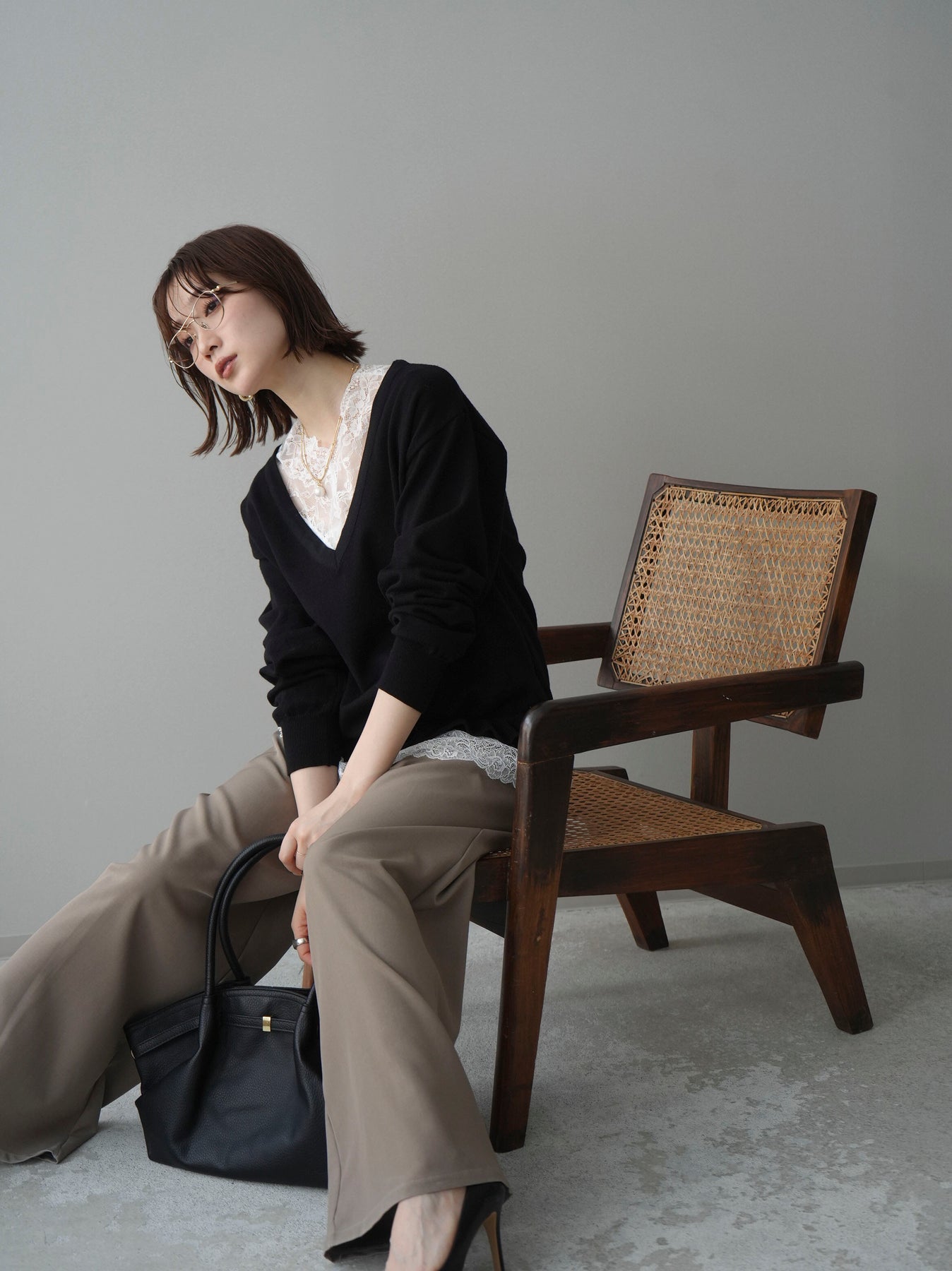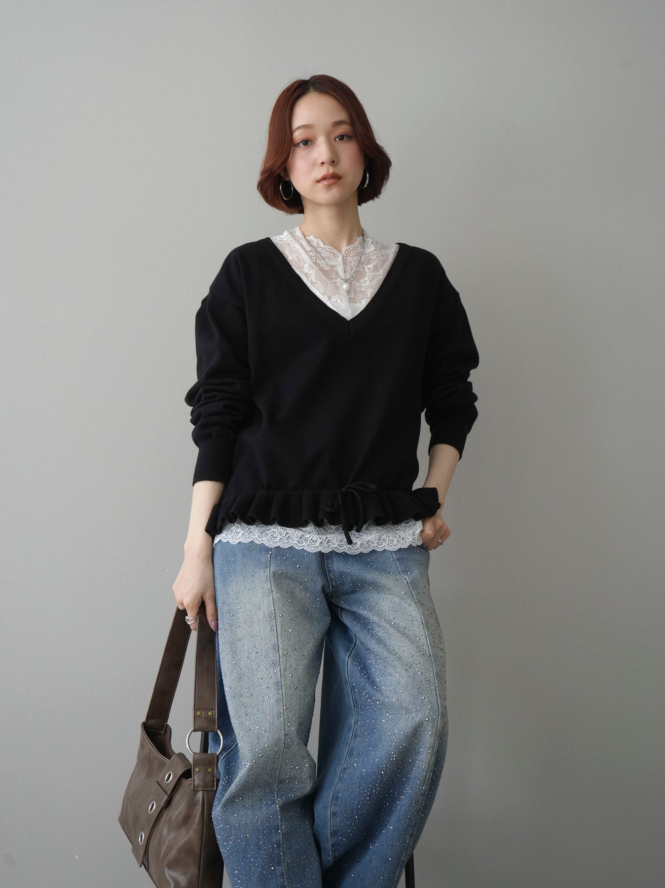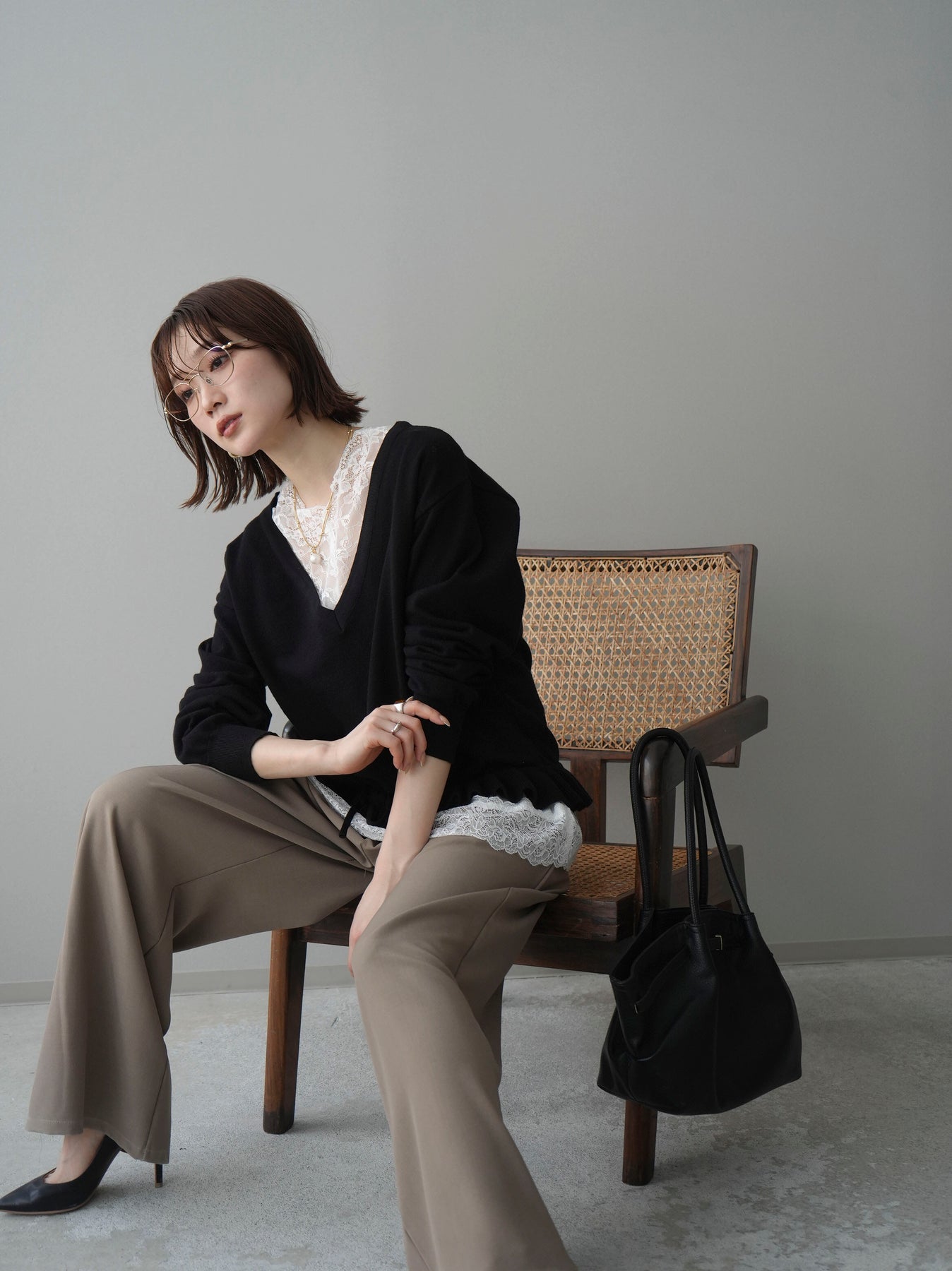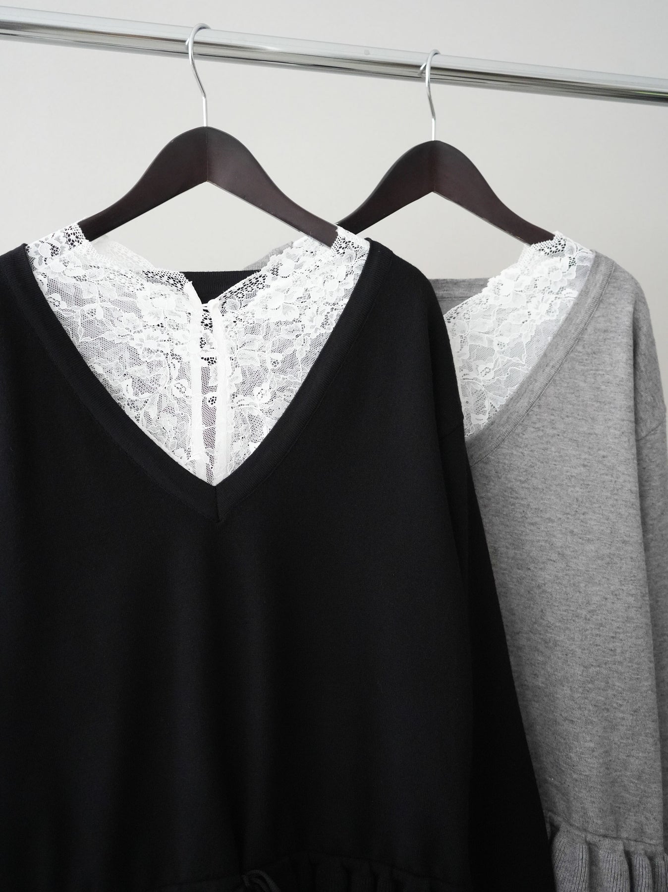 繊細なレースインナーとニットをレイヤードした、女性らしさが引き立つアンサンブル。深めのVネックから覗くレースが顔まわりを華やかに演出し、裾からさりげなく見えるレースデザインがスタイリングに奥行きをプラスします。ニットは程よくゆとりのあるシルエットで抜け感があり、単品使いでも着回しやすい一着。デニムでカジュアルに、スラックスやスカートで上品にと幅広いコーディネートが楽しめます。