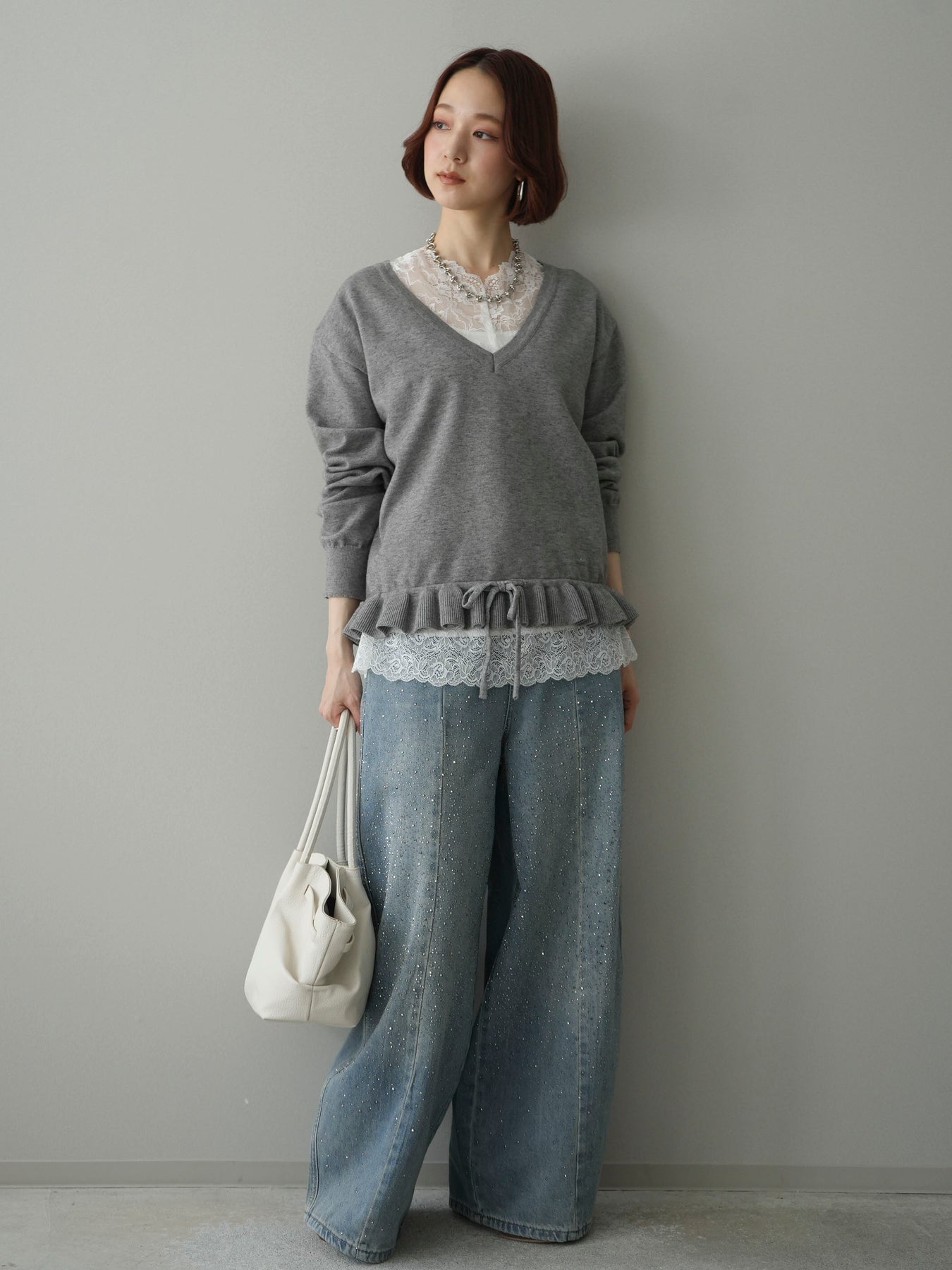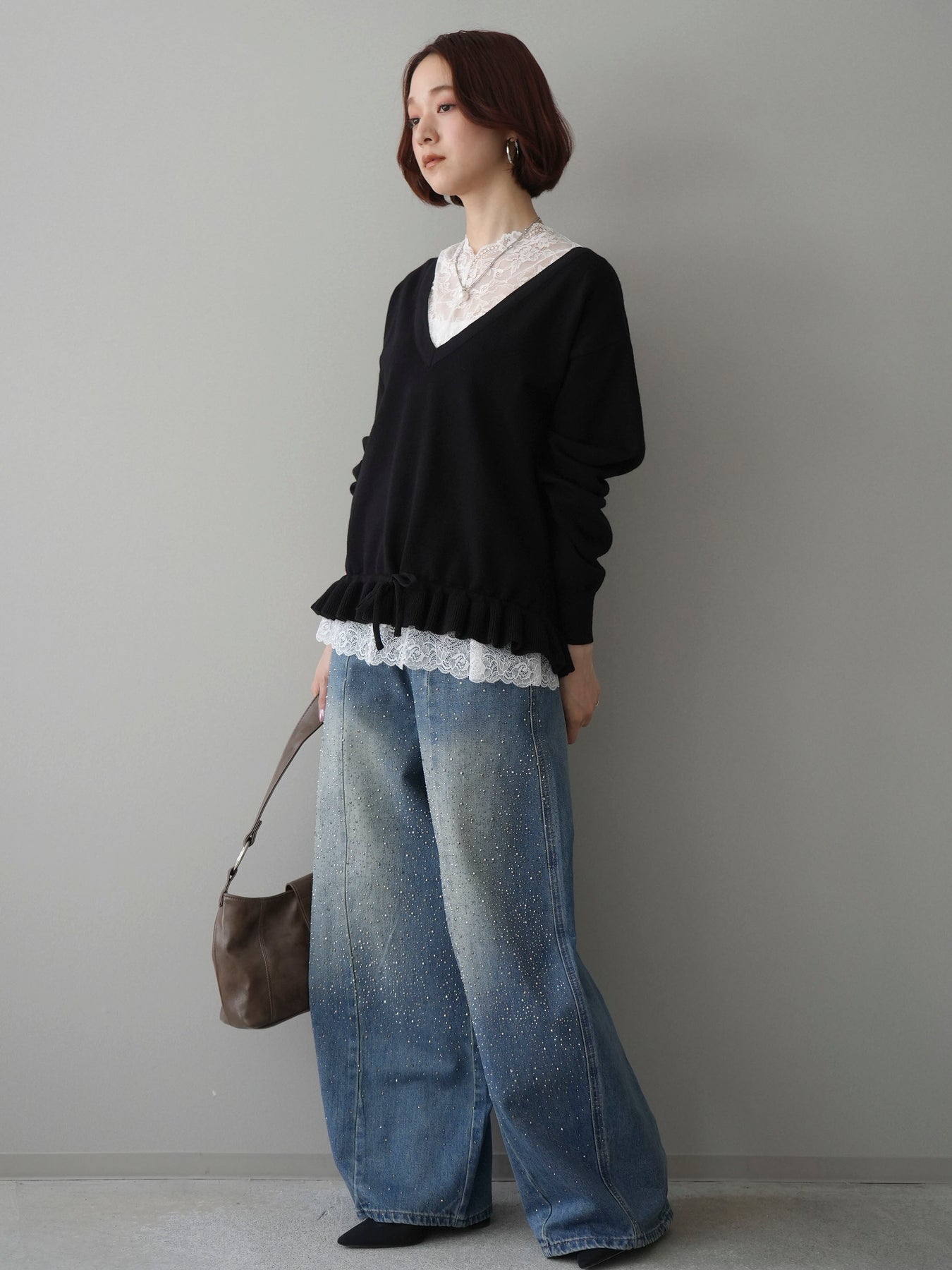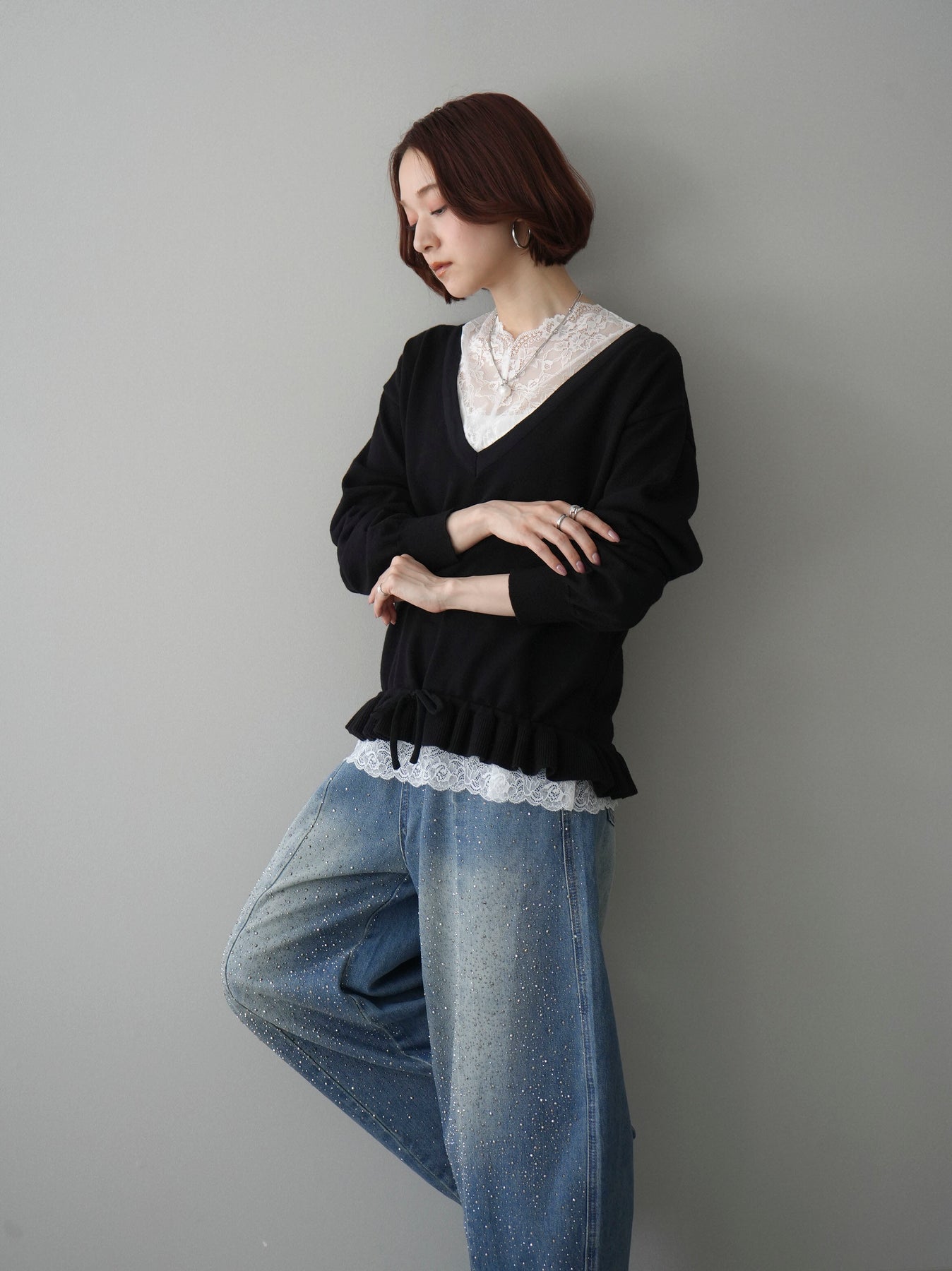 [SET]レーストップ&フリルニットアンサンブル+フロントビジューカーブデニムパンツ(2set)