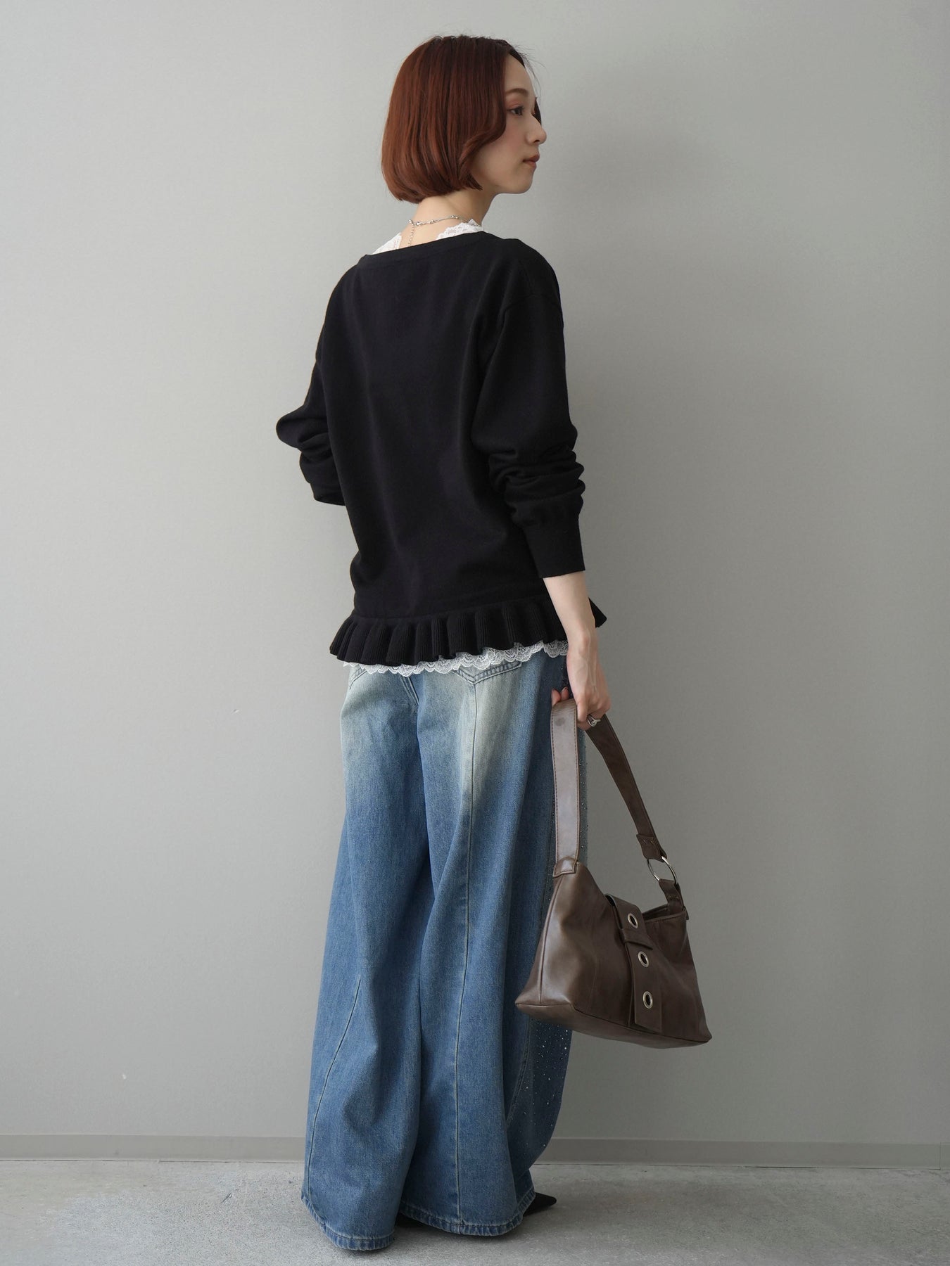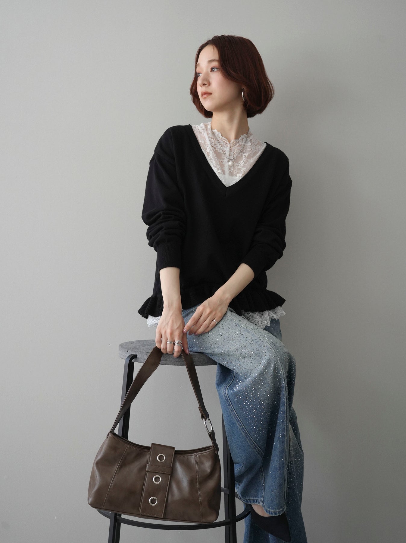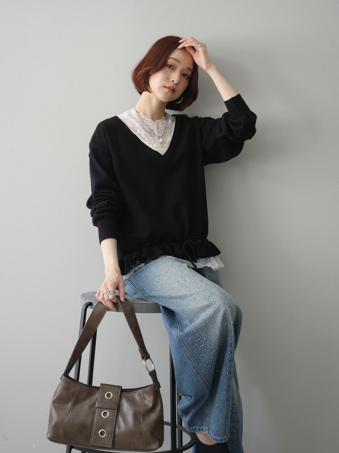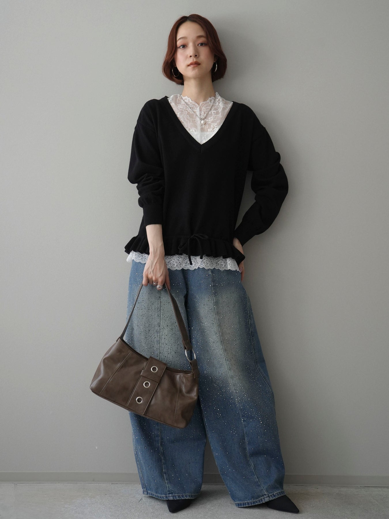 [SET]レーストップ&フリルニットアンサンブル+フロントビジューカーブデニムパンツ(2set)