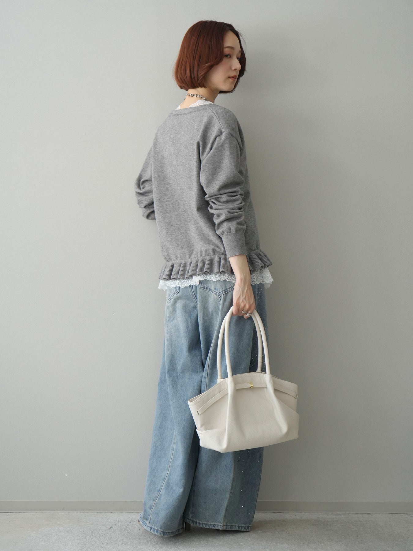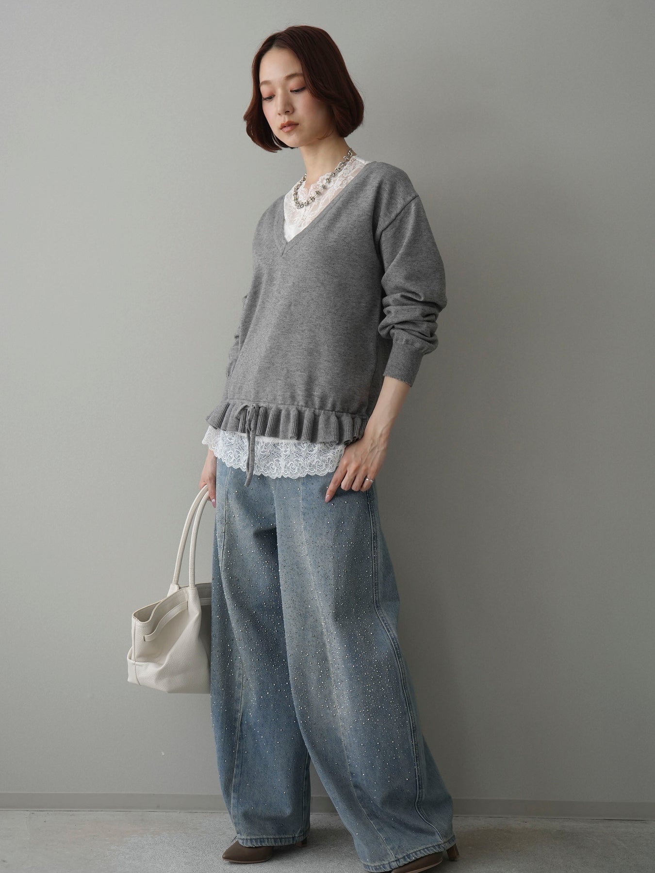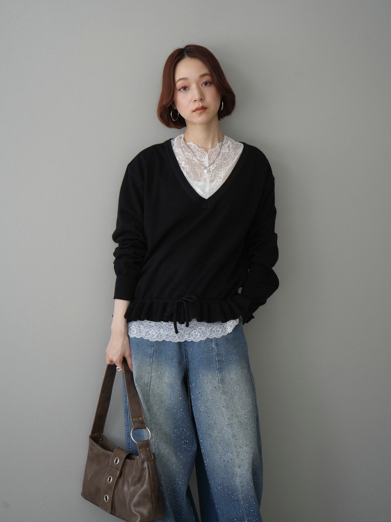 繊細なレースインナーとニットをレイヤードした、女性らしさが引き立つアンサンブル。深めのVネックから覗くレースが顔まわりを華やかに演出し、裾からさりげなく見えるレースデザインがスタイリングに奥行きをプラスします。ニットは程よくゆとりのあるシルエットで抜け感があり、単品使いでも着回しやすい一着。デニムでカジュアルに、スラックスやスカートで上品にと幅広いコーディネートが楽しめます。