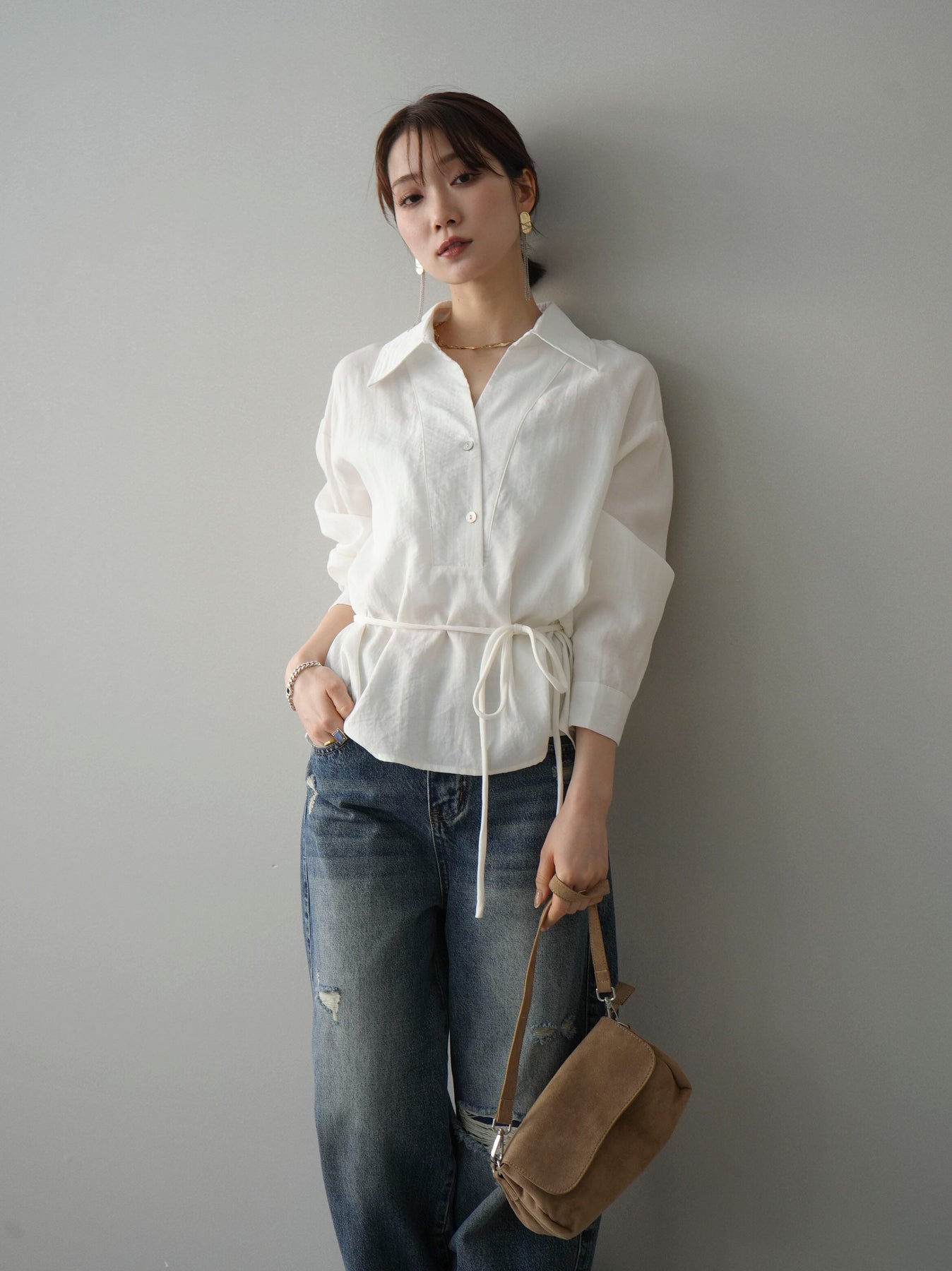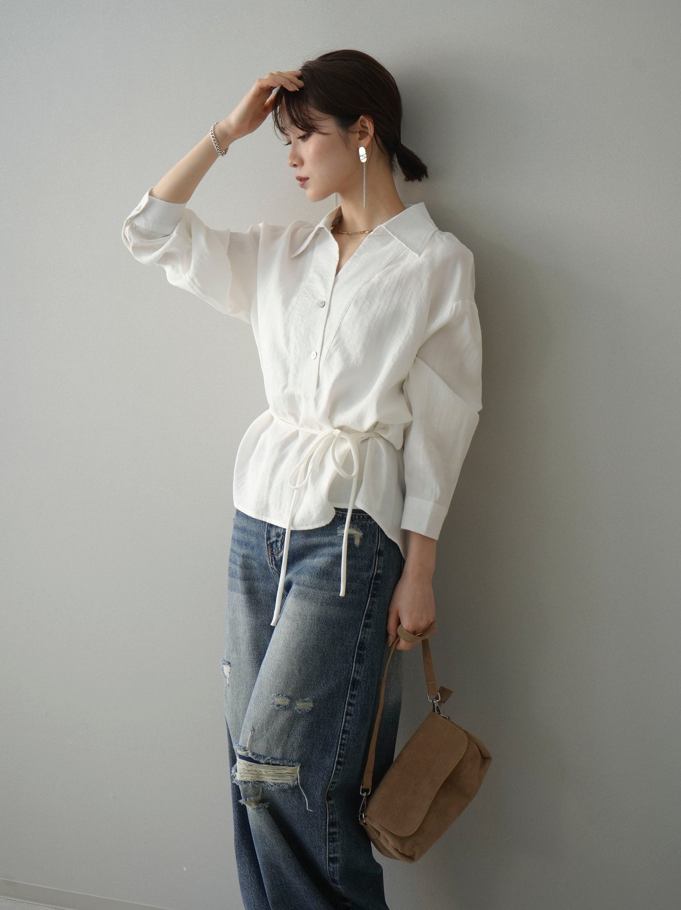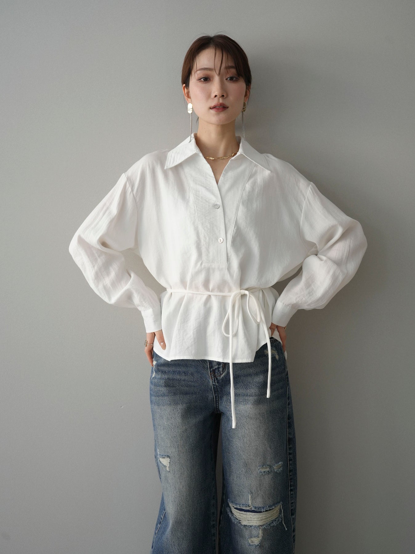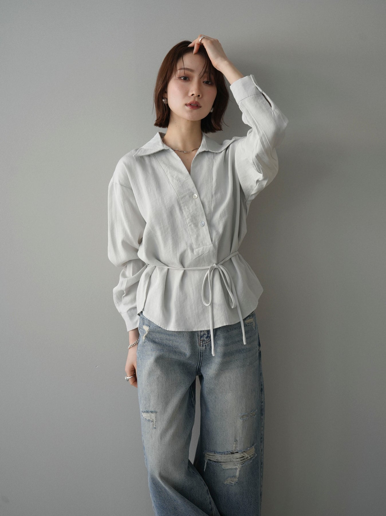 抜け感のあるスキッパーデザインが顔まわりをすっきりと見せてくれるシャツ。程よく落ち感のある素材で、さらりと軽やかな着心地に仕上げました。ウエストリボンでシルエットのアレンジができ、前を開けて羽織としても活躍。きれいめからカジュアルまで幅広いスタイリングに馴染む、着回し力の高い一枚です。 ※ボトムス、キャミソール(インナー)以外の商品は一律でインナーは付属していません