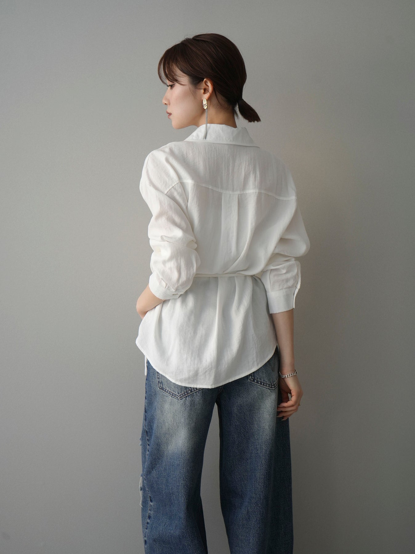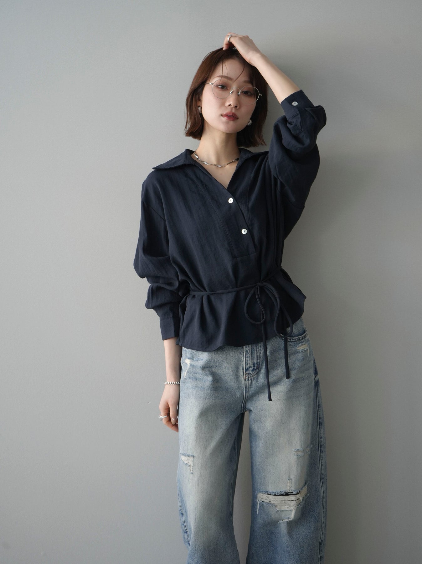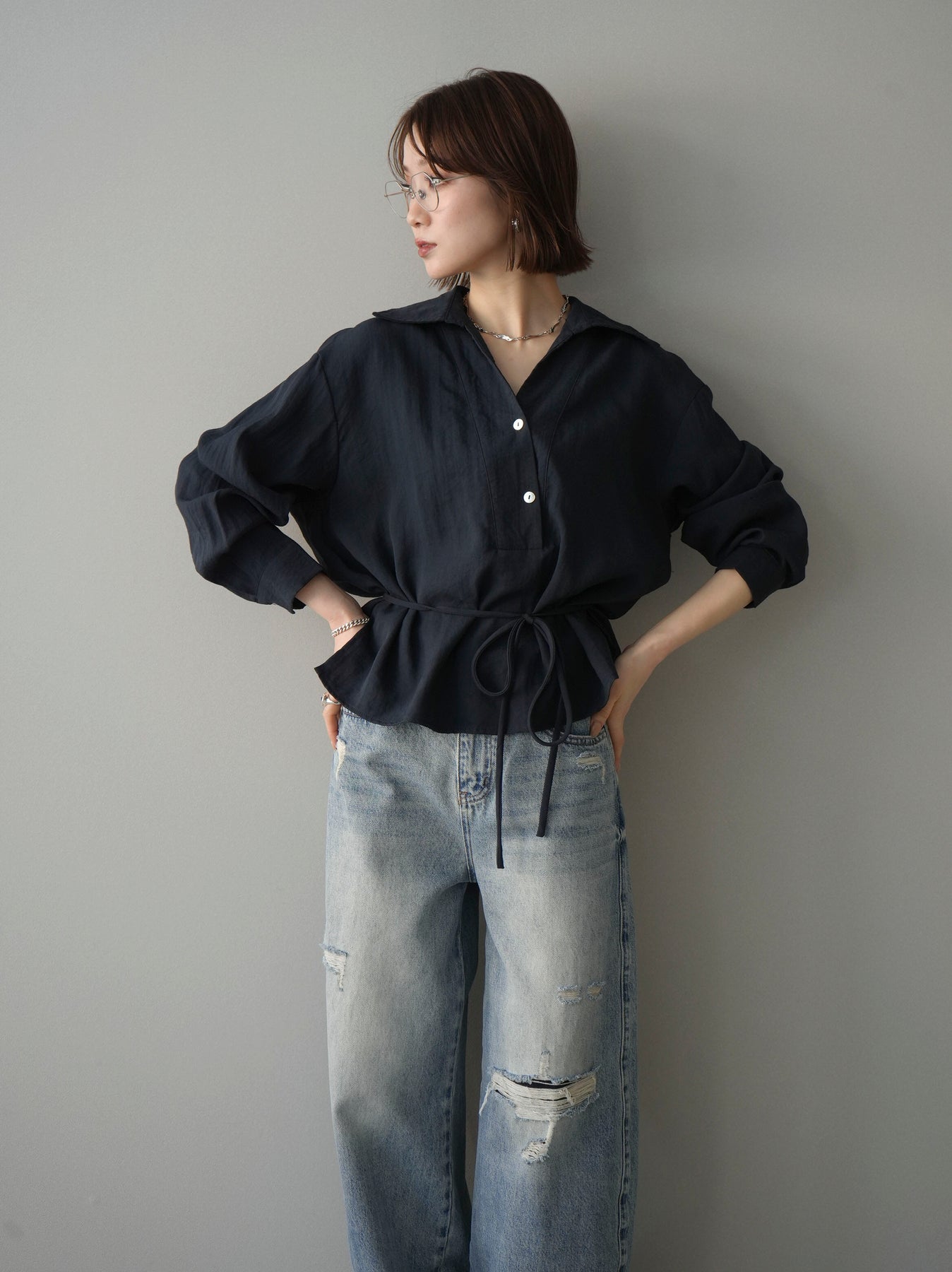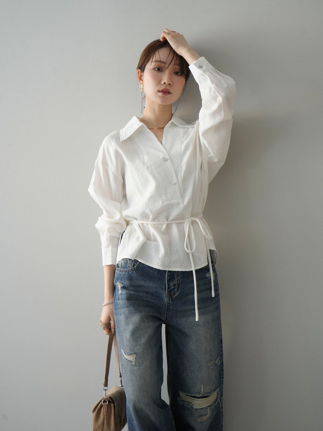 抜け感のあるスキッパーデザインが顔まわりをすっきりと見せてくれるシャツ。程よく落ち感のある素材で、さらりと軽やかな着心地に仕上げました。ウエストリボンでシルエットのアレンジができ、前を開けて羽織としても活躍。きれいめからカジュアルまで幅広いスタイリングに馴染む、着回し力の高い一枚です。 ※ボトムス、キャミソール(インナー)以外の商品は一律でインナーは付属していません