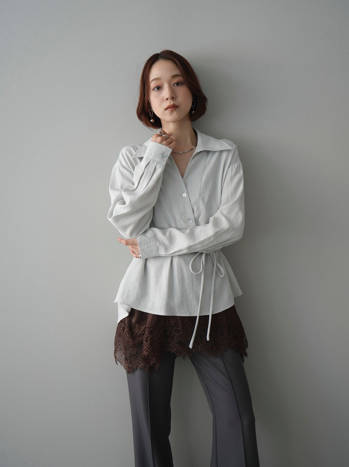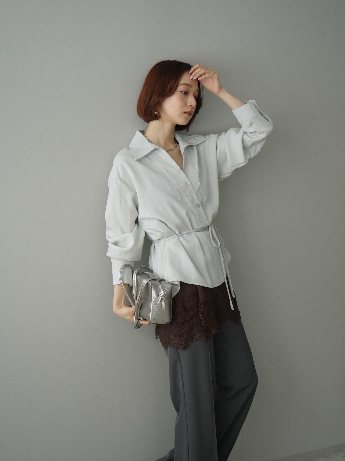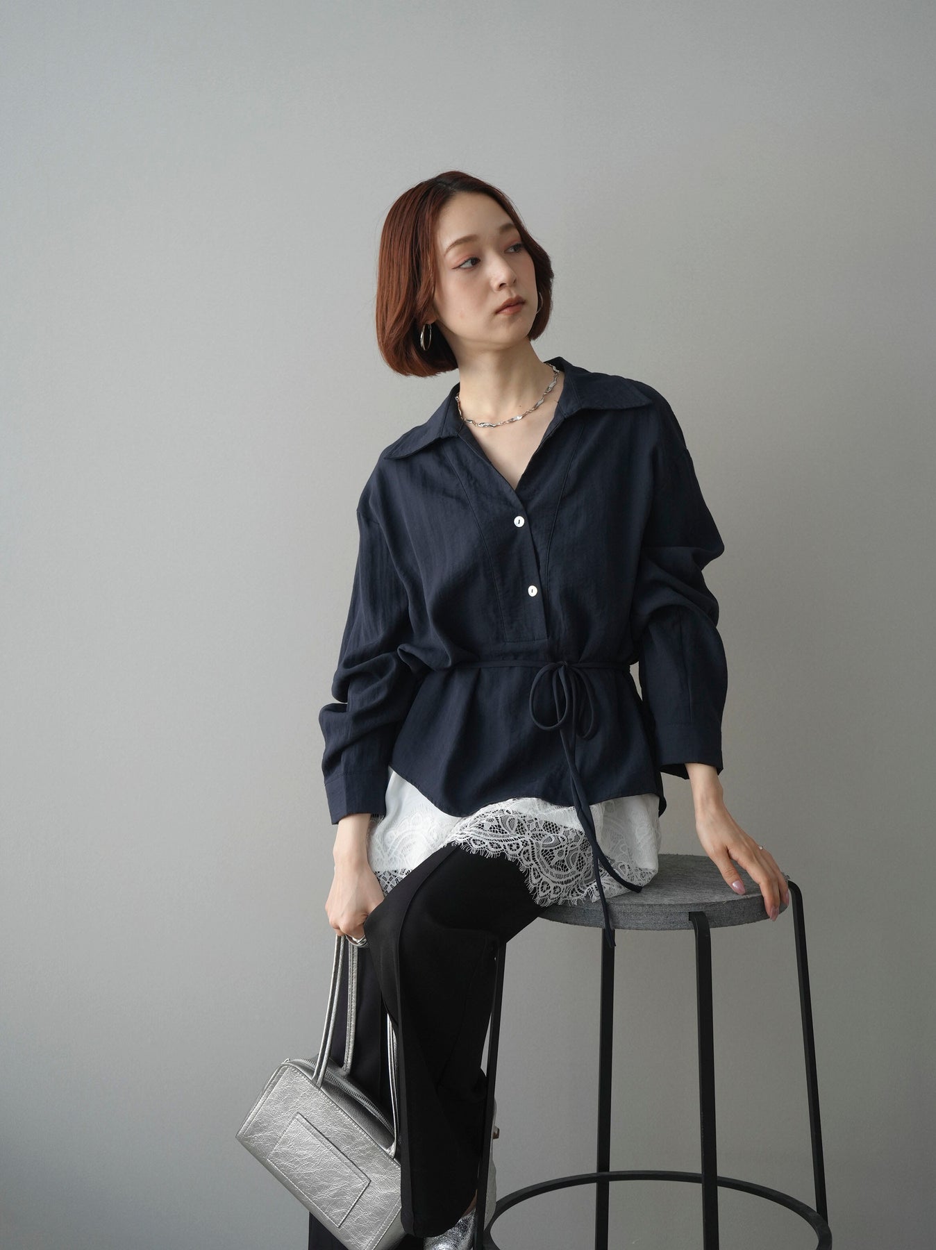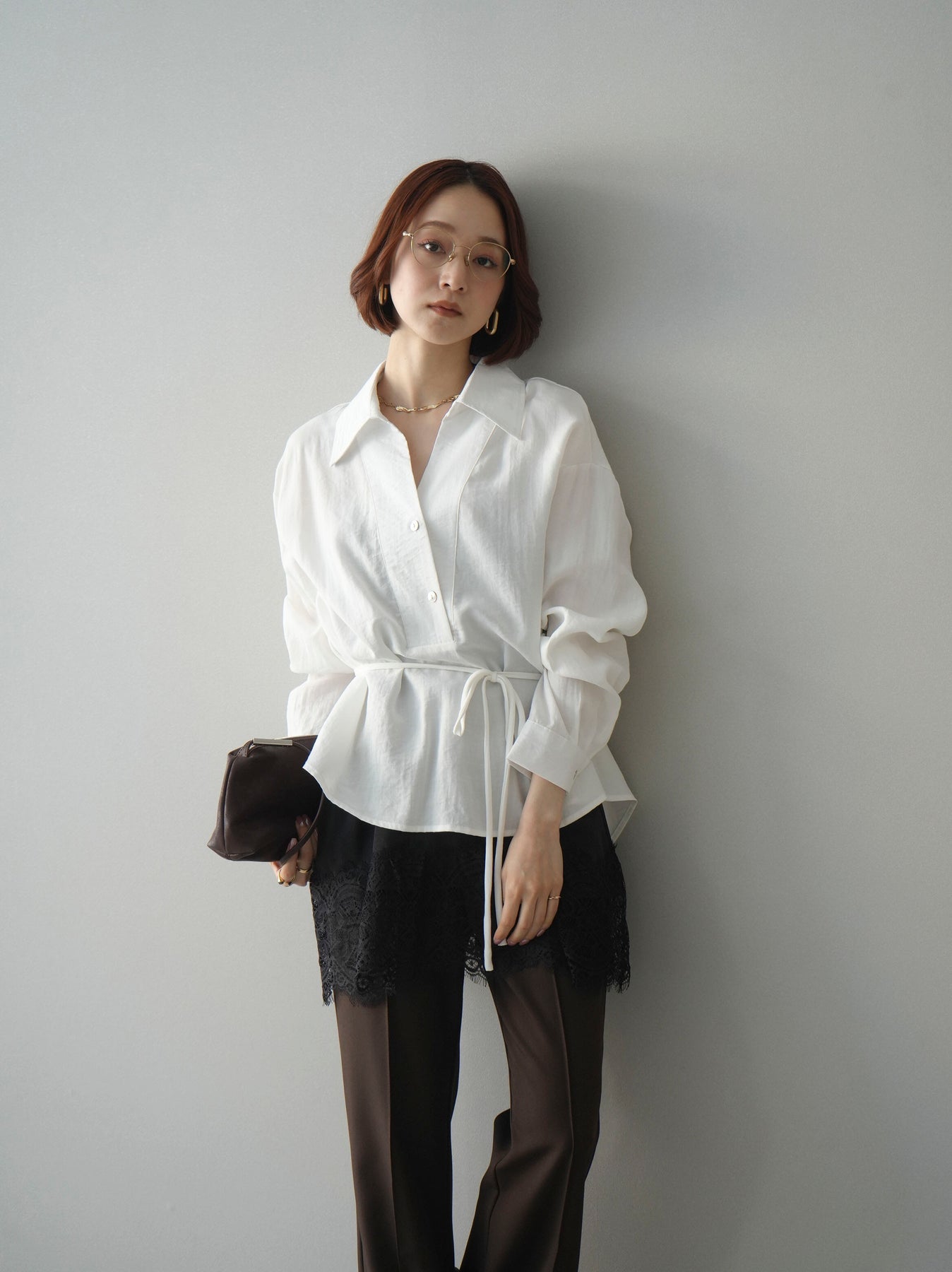 抜け感のあるスキッパーデザインが顔まわりをすっきりと見せてくれるシャツ。程よく落ち感のある素材で、さらりと軽やかな着心地に仕上げました。ウエストリボンでシルエットのアレンジができ、前を開けて羽織としても活躍。きれいめからカジュアルまで幅広いスタイリングに馴染む、着回し力の高い一枚です。 ※ボトムス、キャミソール(インナー)以外の商品は一律でインナーは付属していません