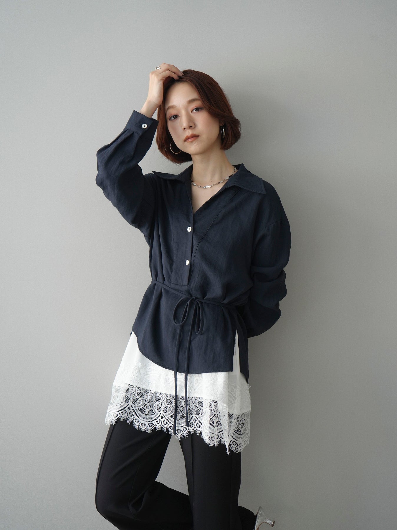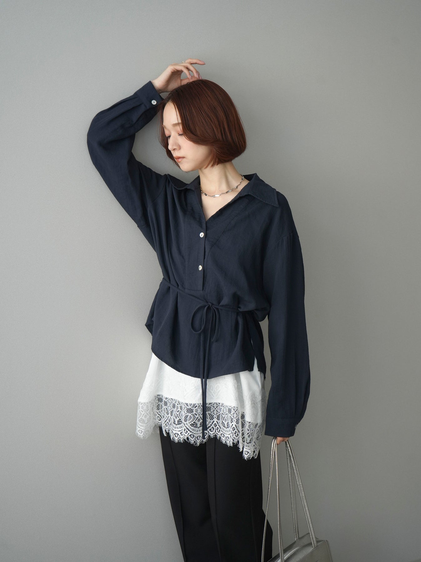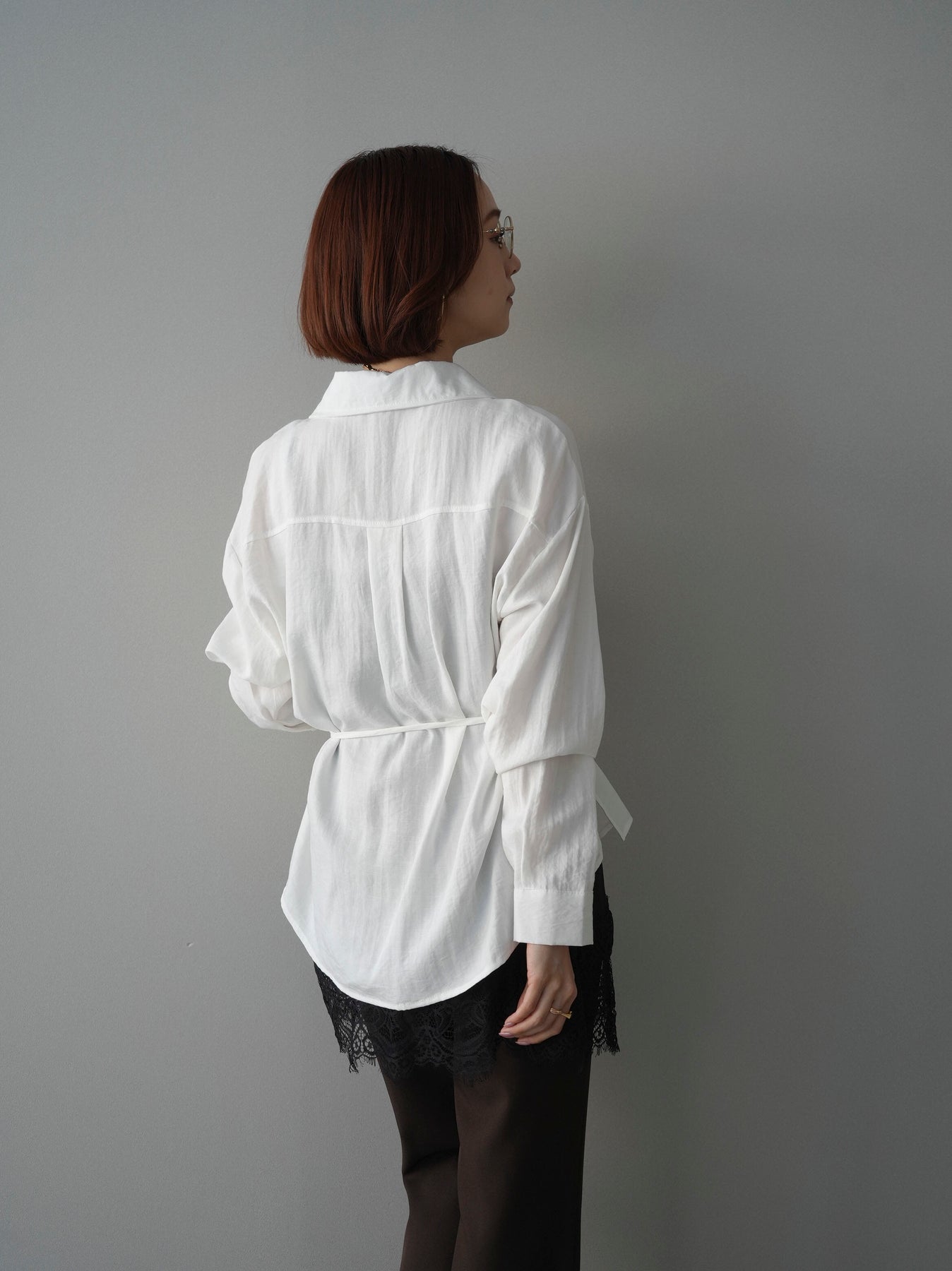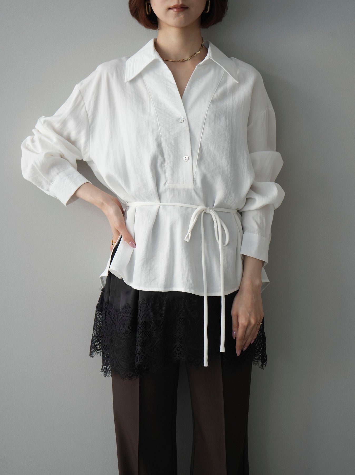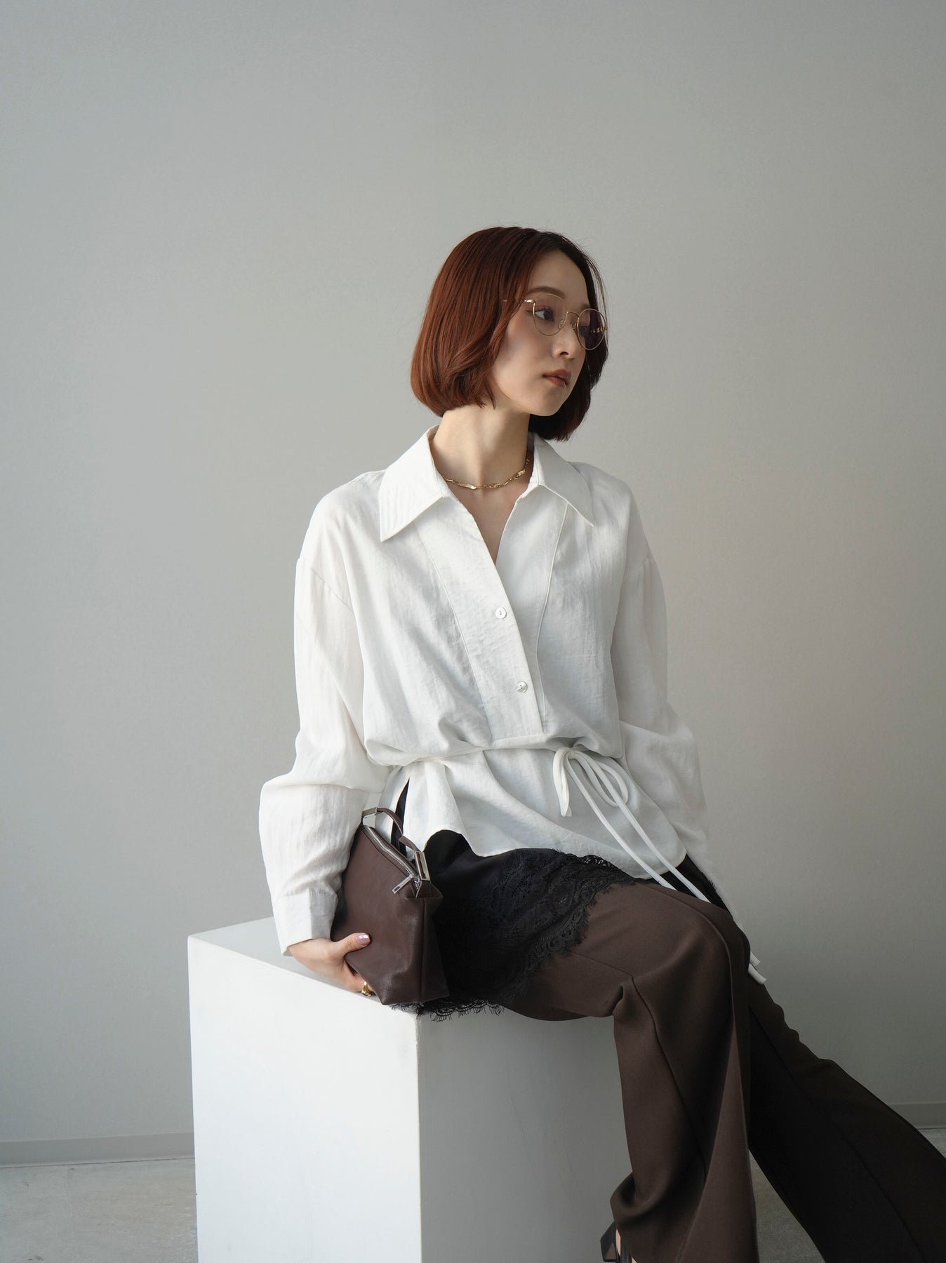 抜け感のあるスキッパーデザインが顔まわりをすっきりと見せてくれるシャツ。程よく落ち感のある素材で、さらりと軽やかな着心地に仕上げました。ウエストリボンでシルエットのアレンジができ、前を開けて羽織としても活躍。きれいめからカジュアルまで幅広いスタイリングに馴染む、着回し力の高い一枚です。 ※ボトムス、キャミソール(インナー)以外の商品は一律でインナーは付属していません