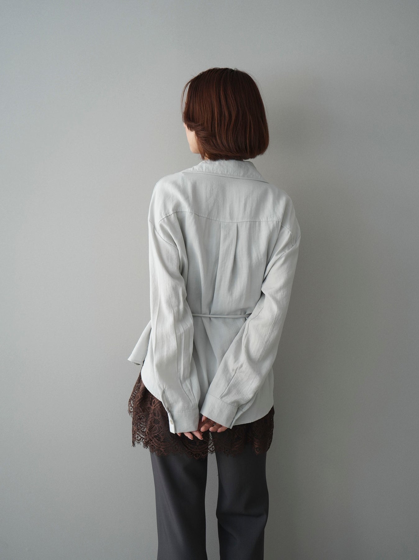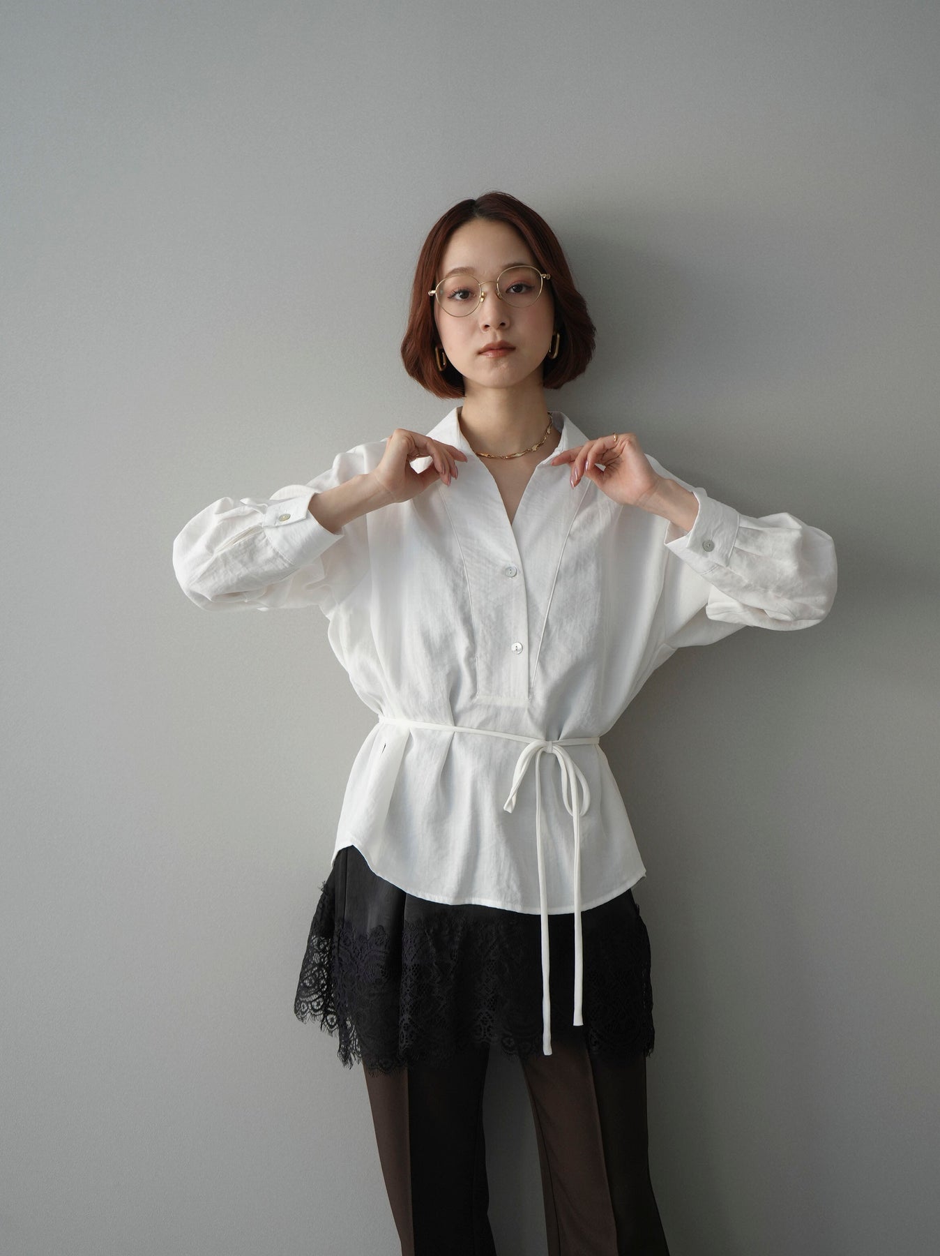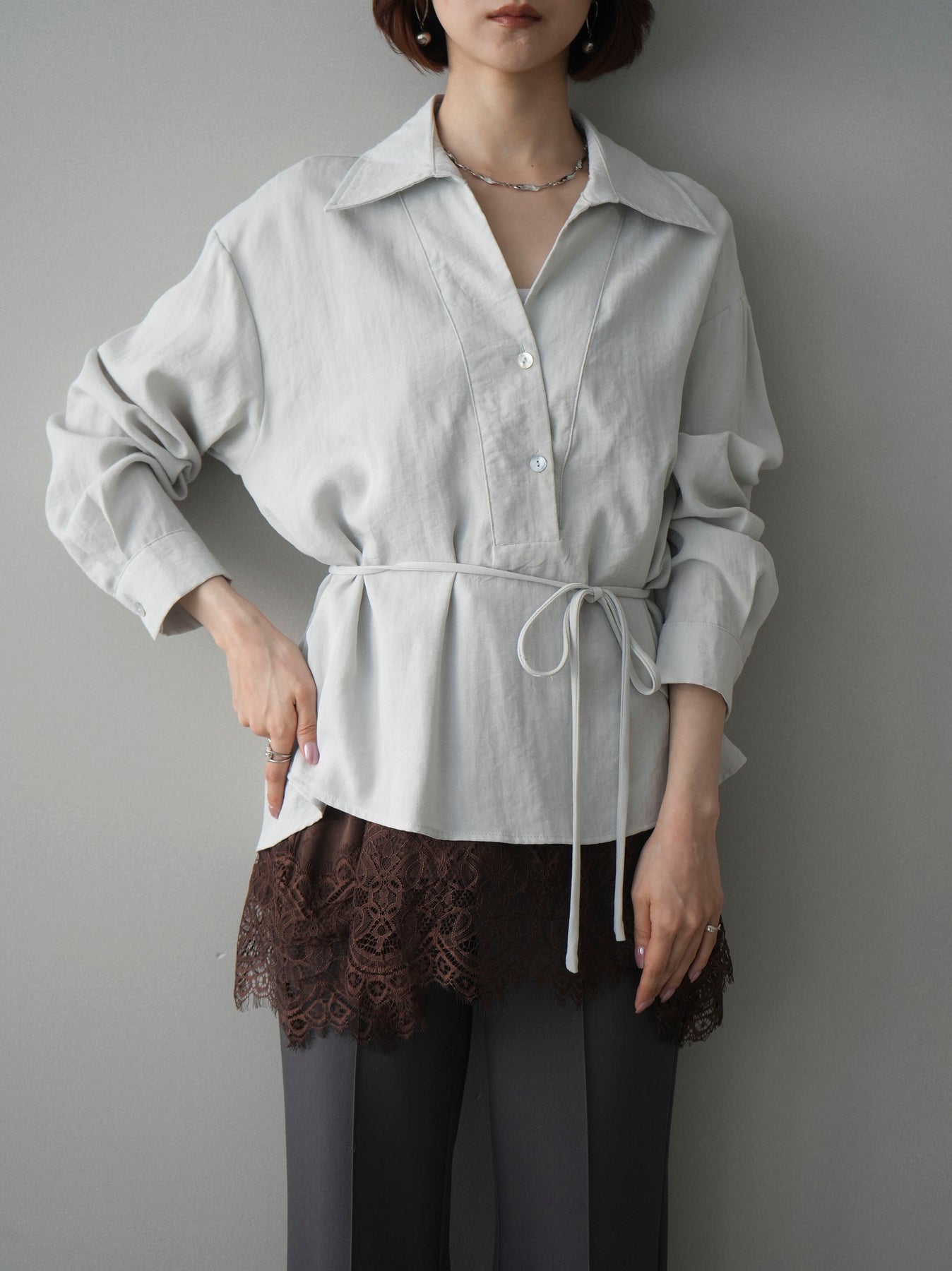 抜け感のあるスキッパーデザインが顔まわりをすっきりと見せてくれるシャツ。程よく落ち感のある素材で、さらりと軽やかな着心地に仕上げました。ウエストリボンでシルエットのアレンジができ、前を開けて羽織としても活躍。きれいめからカジュアルまで幅広いスタイリングに馴染む、着回し力の高い一枚です。 ※ボトムス、キャミソール(インナー)以外の商品は一律でインナーは付属していません