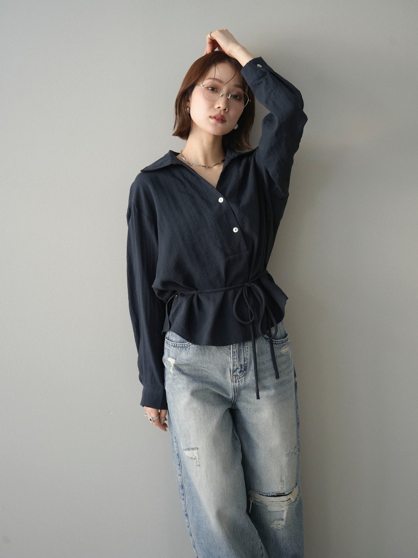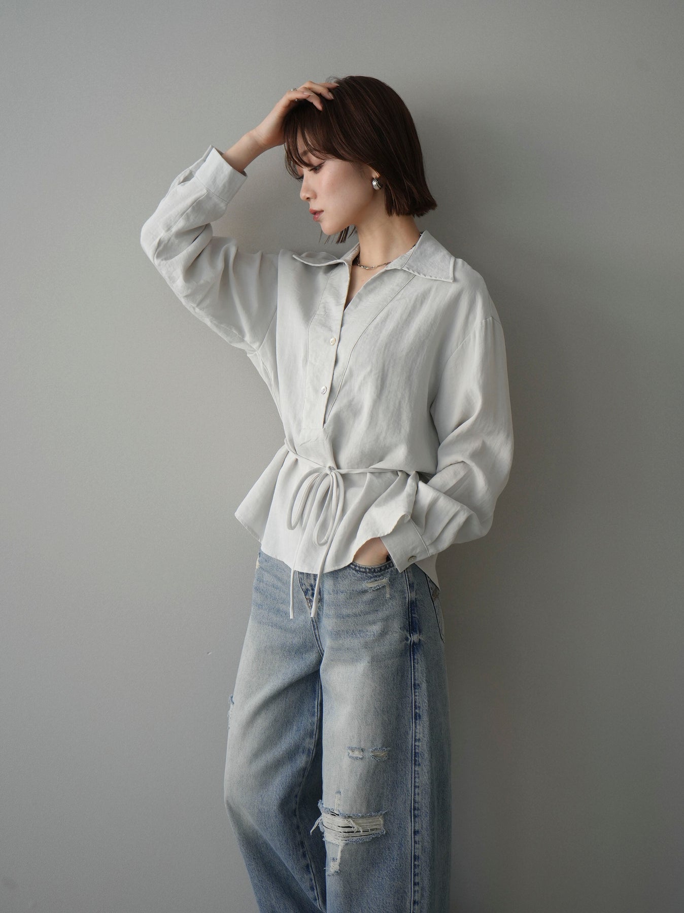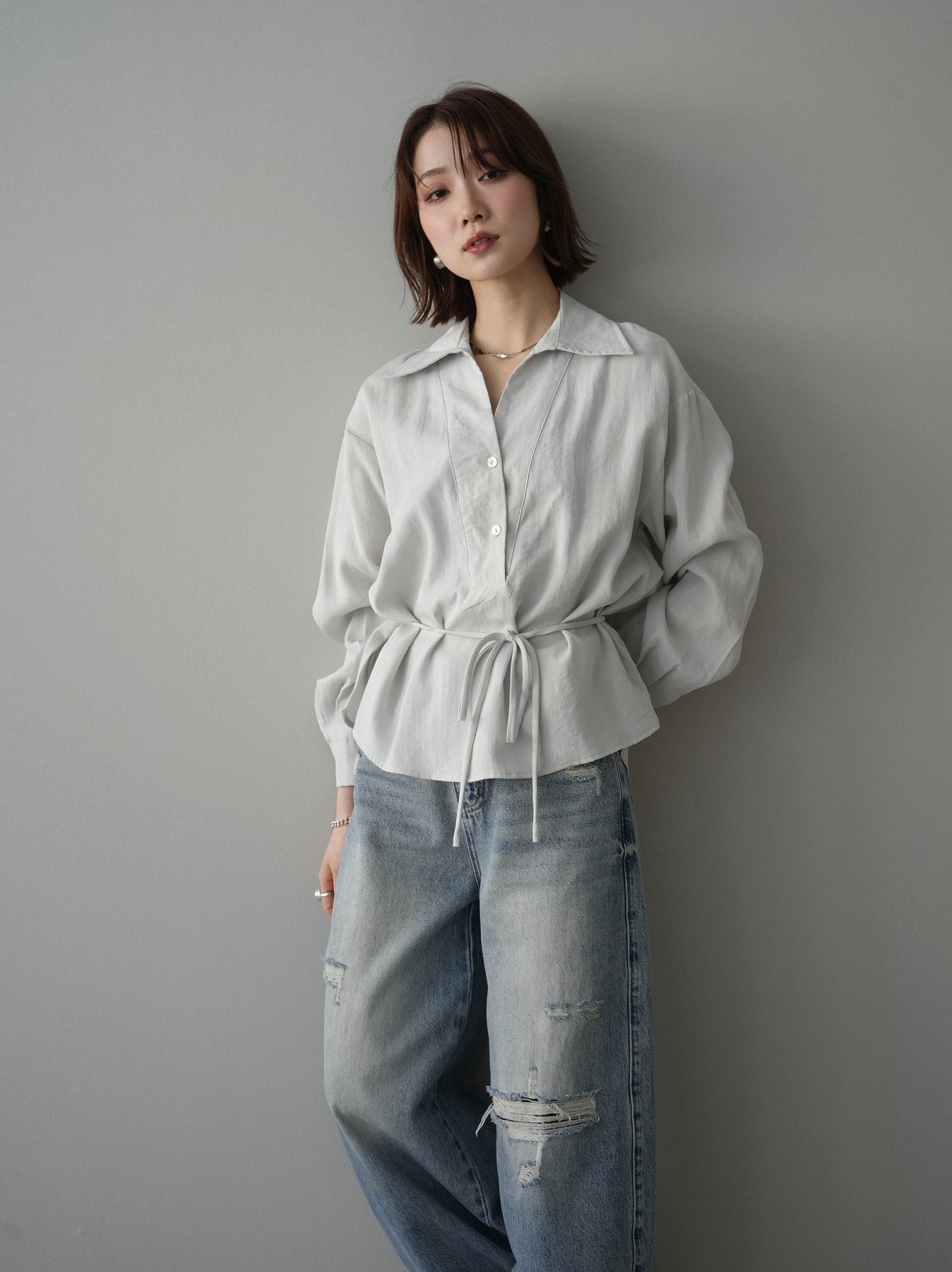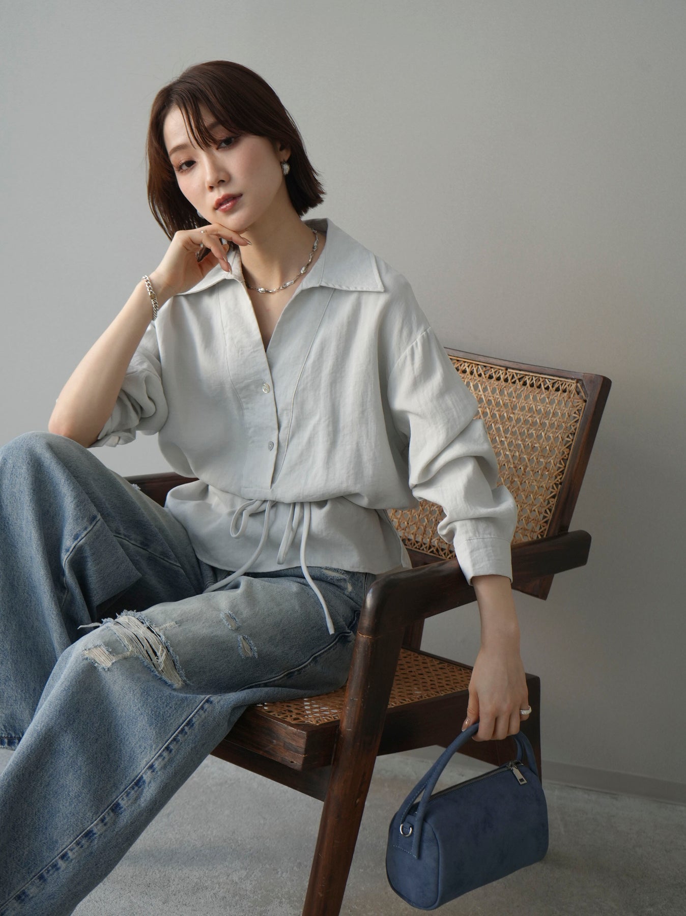 抜け感のあるスキッパーデザインが顔まわりをすっきりと見せてくれるシャツ。程よく落ち感のある素材で、さらりと軽やかな着心地に仕上げました。ウエストリボンでシルエットのアレンジができ、前を開けて羽織としても活躍。きれいめからカジュアルまで幅広いスタイリングに馴染む、着回し力の高い一枚です。 ※ボトムス、キャミソール(インナー)以外の商品は一律でインナーは付属していません