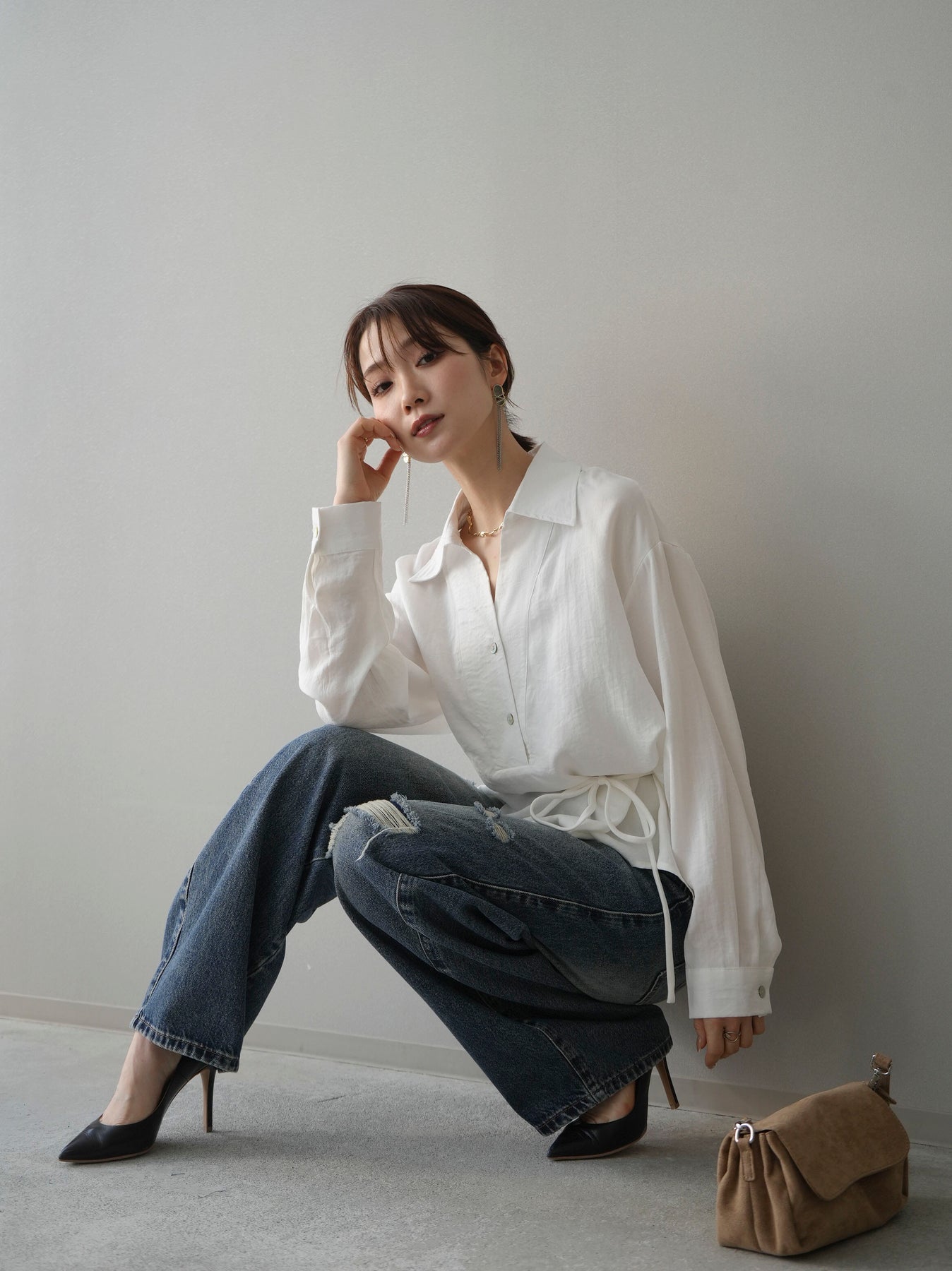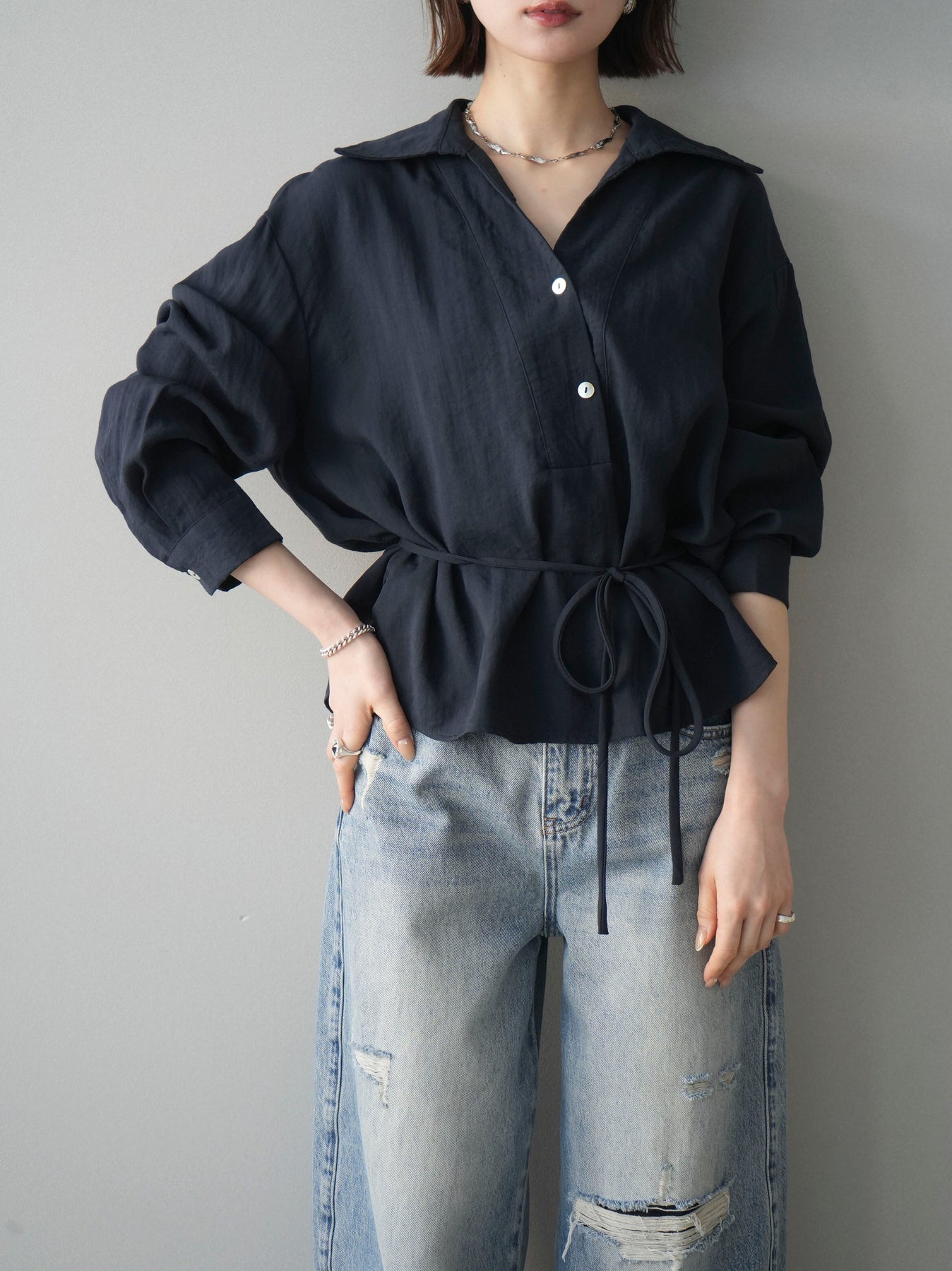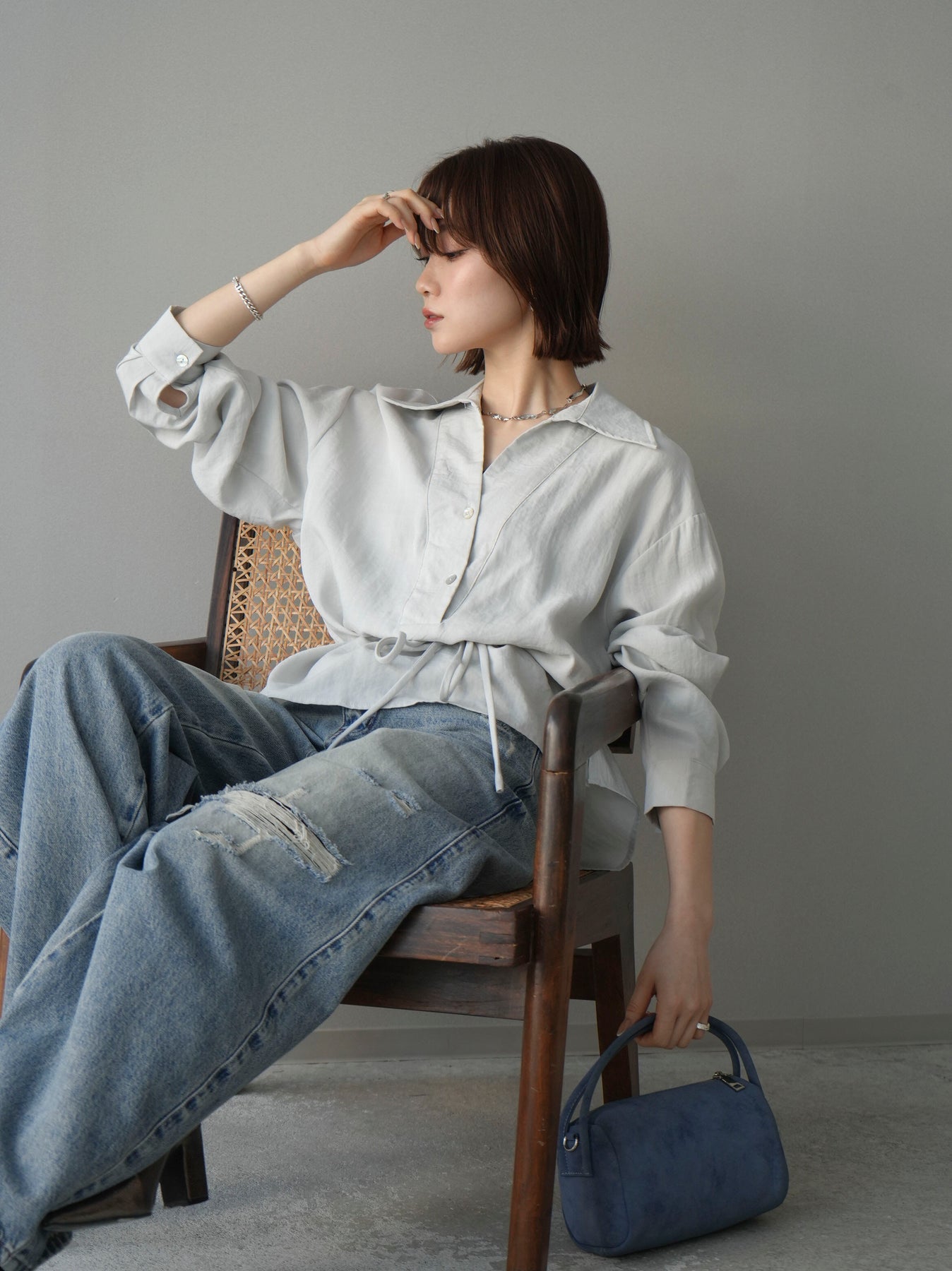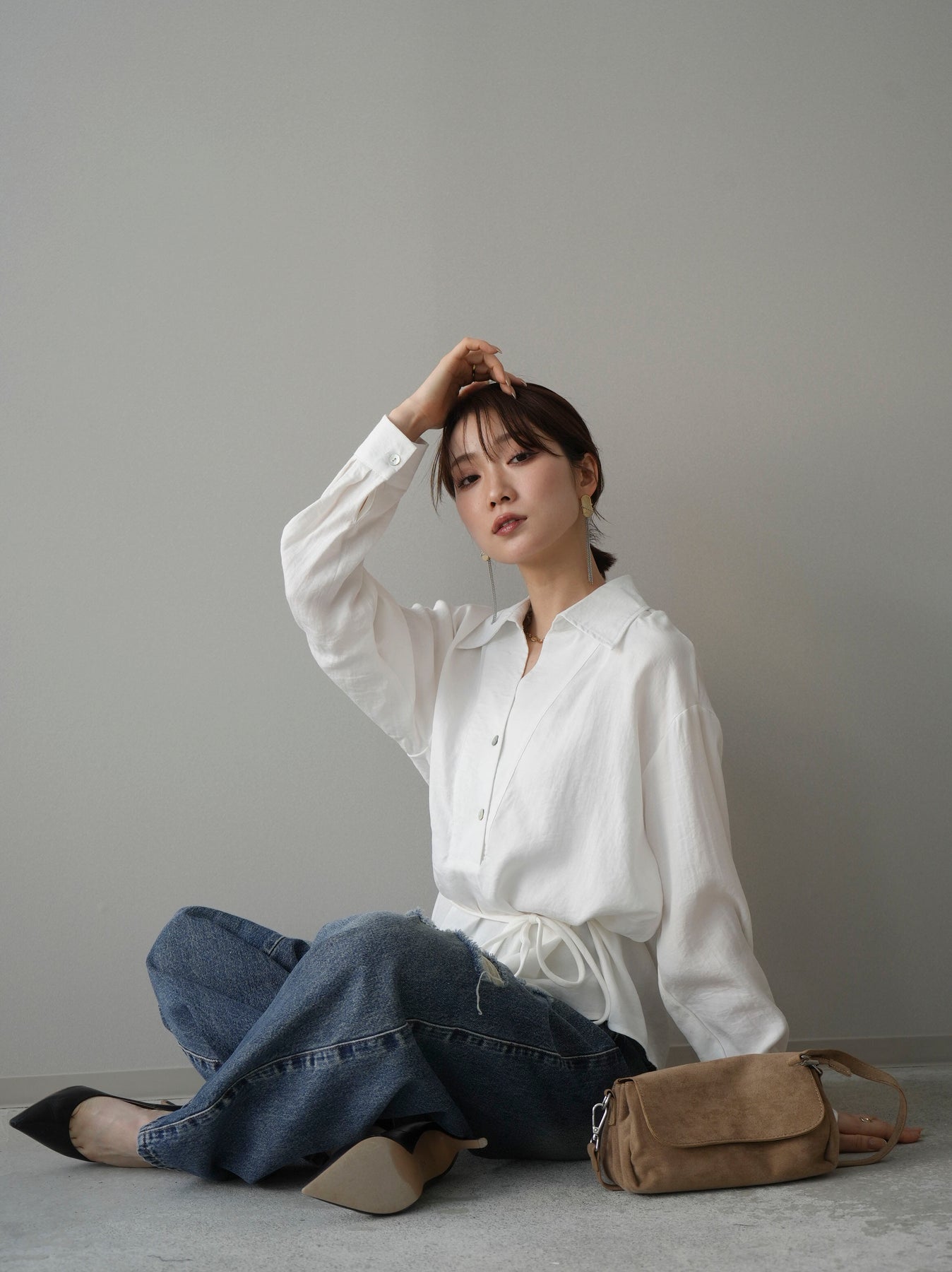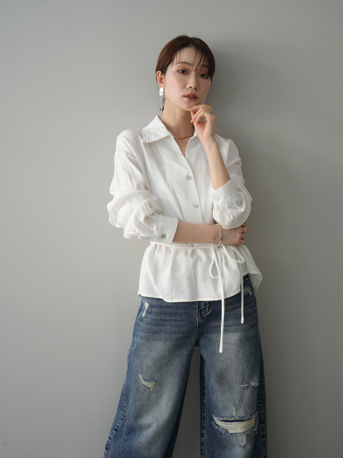 抜け感のあるスキッパーデザインが顔まわりをすっきりと見せてくれるシャツ。程よく落ち感のある素材で、さらりと軽やかな着心地に仕上げました。ウエストリボンでシルエットのアレンジができ、前を開けて羽織としても活躍。きれいめからカジュアルまで幅広いスタイリングに馴染む、着回し力の高い一枚です。 ※ボトムス、キャミソール(インナー)以外の商品は一律でインナーは付属していません