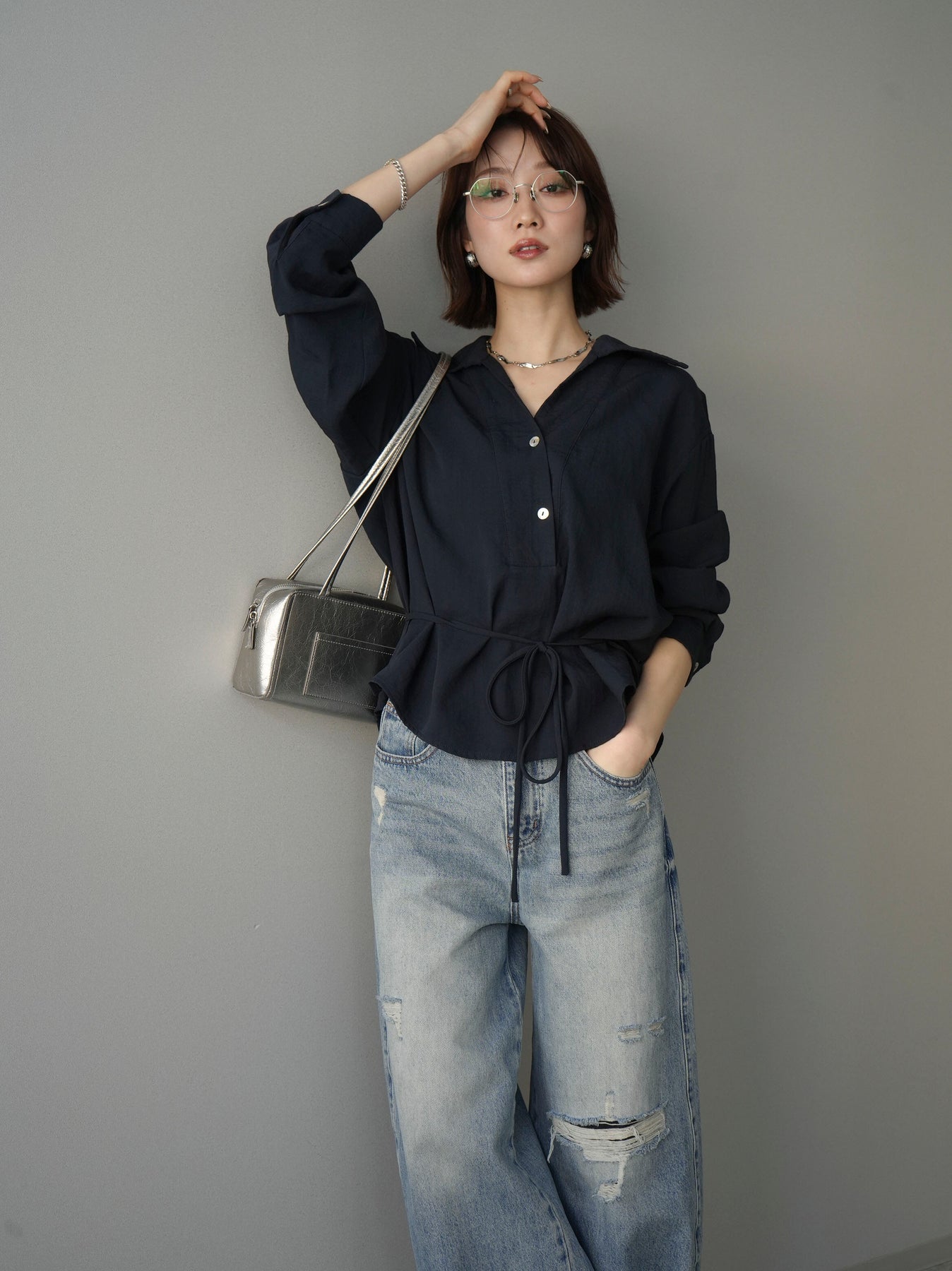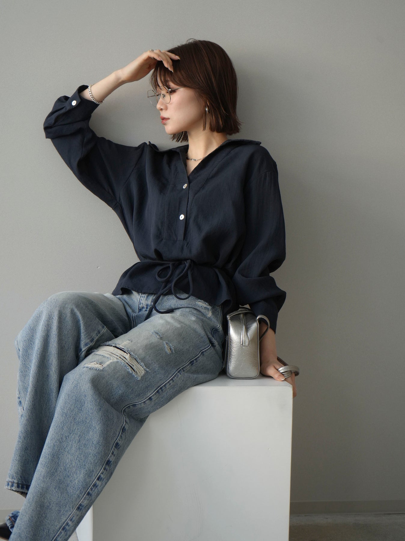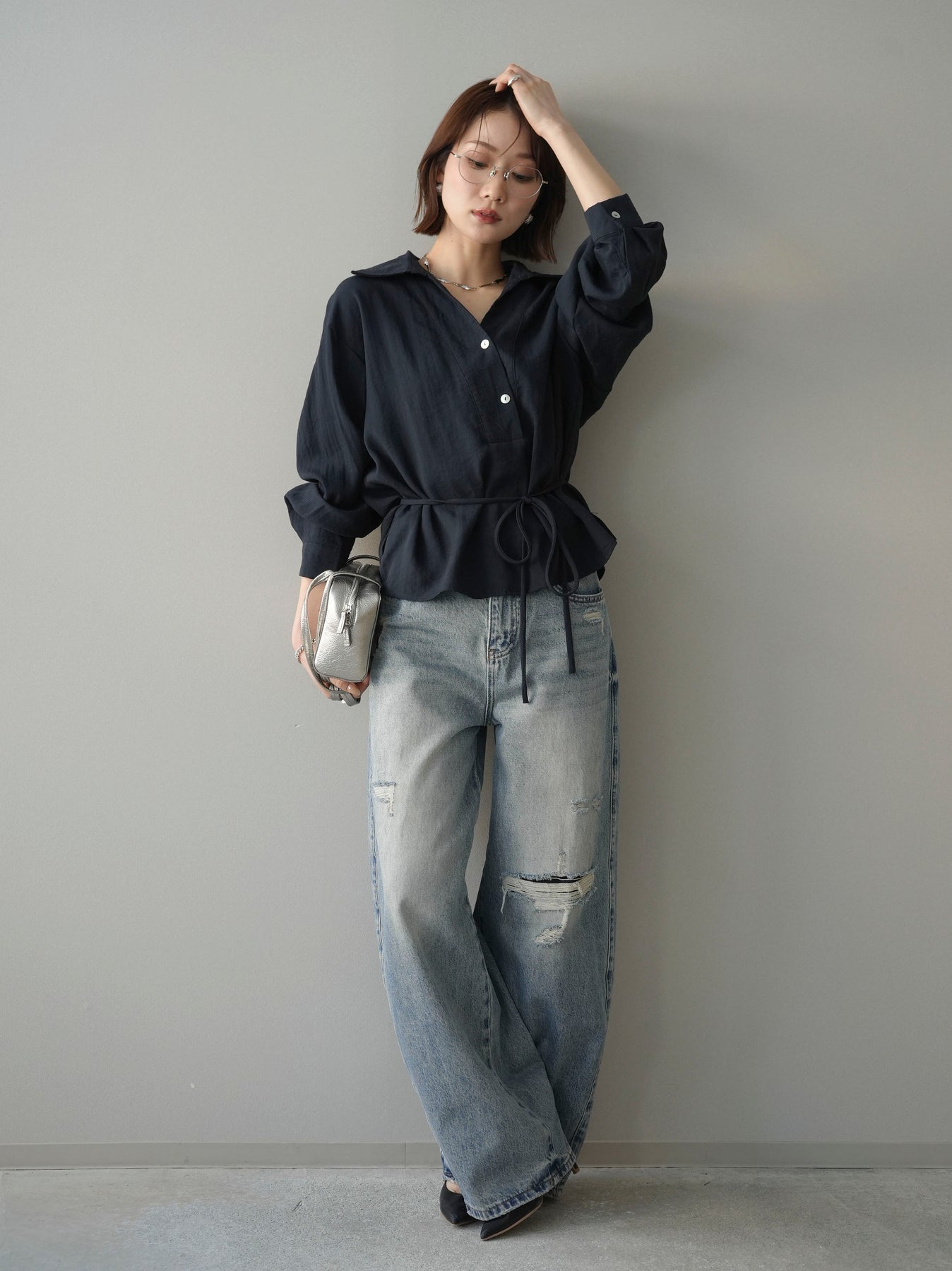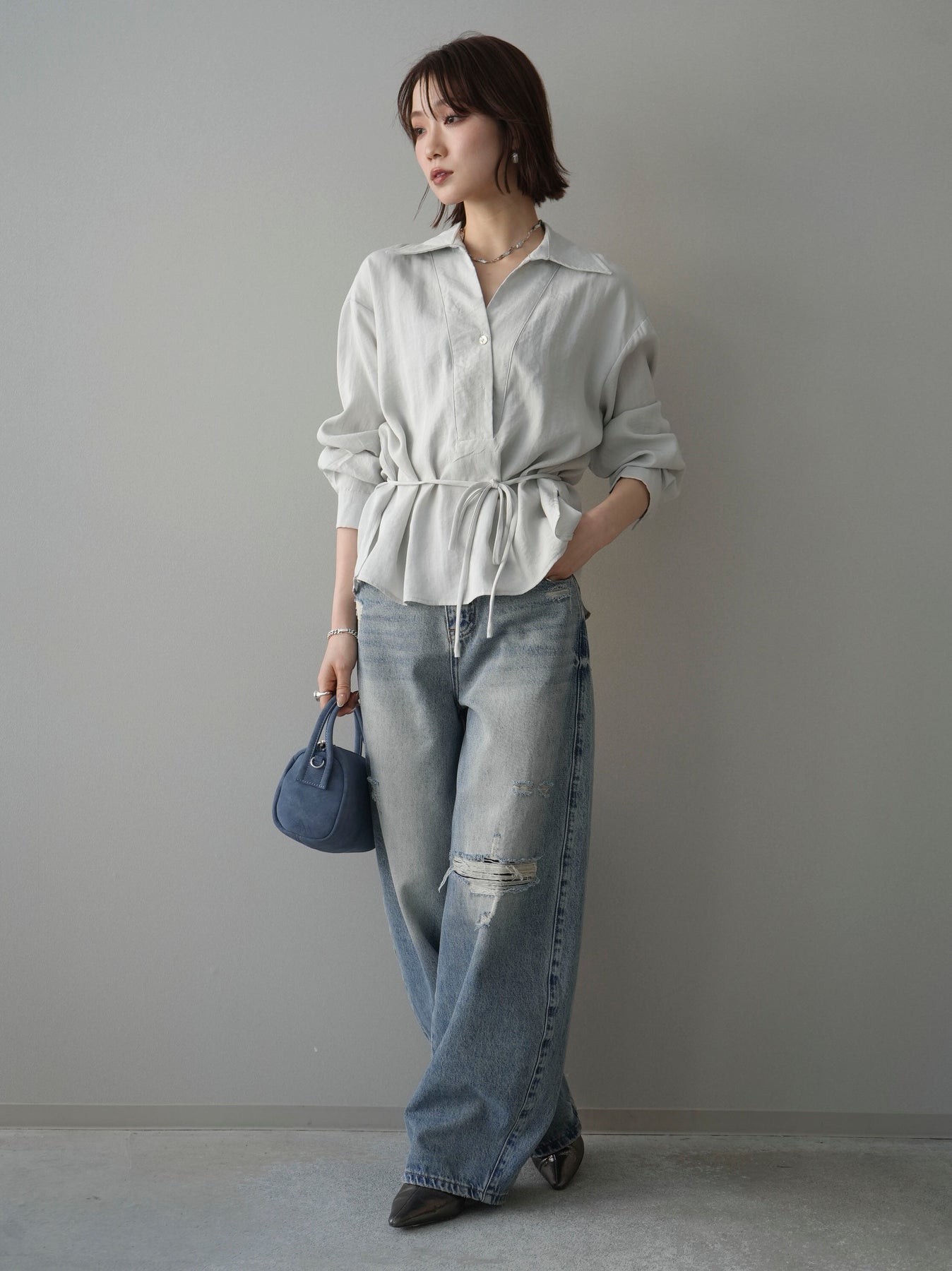 抜け感のあるスキッパーデザインが顔まわりをすっきりと見せてくれるシャツ。程よく落ち感のある素材で、さらりと軽やかな着心地に仕上げました。ウエストリボンでシルエットのアレンジができ、前を開けて羽織としても活躍。きれいめからカジュアルまで幅広いスタイリングに馴染む、着回し力の高い一枚です。 ※ボトムス、キャミソール(インナー)以外の商品は一律でインナーは付属していません