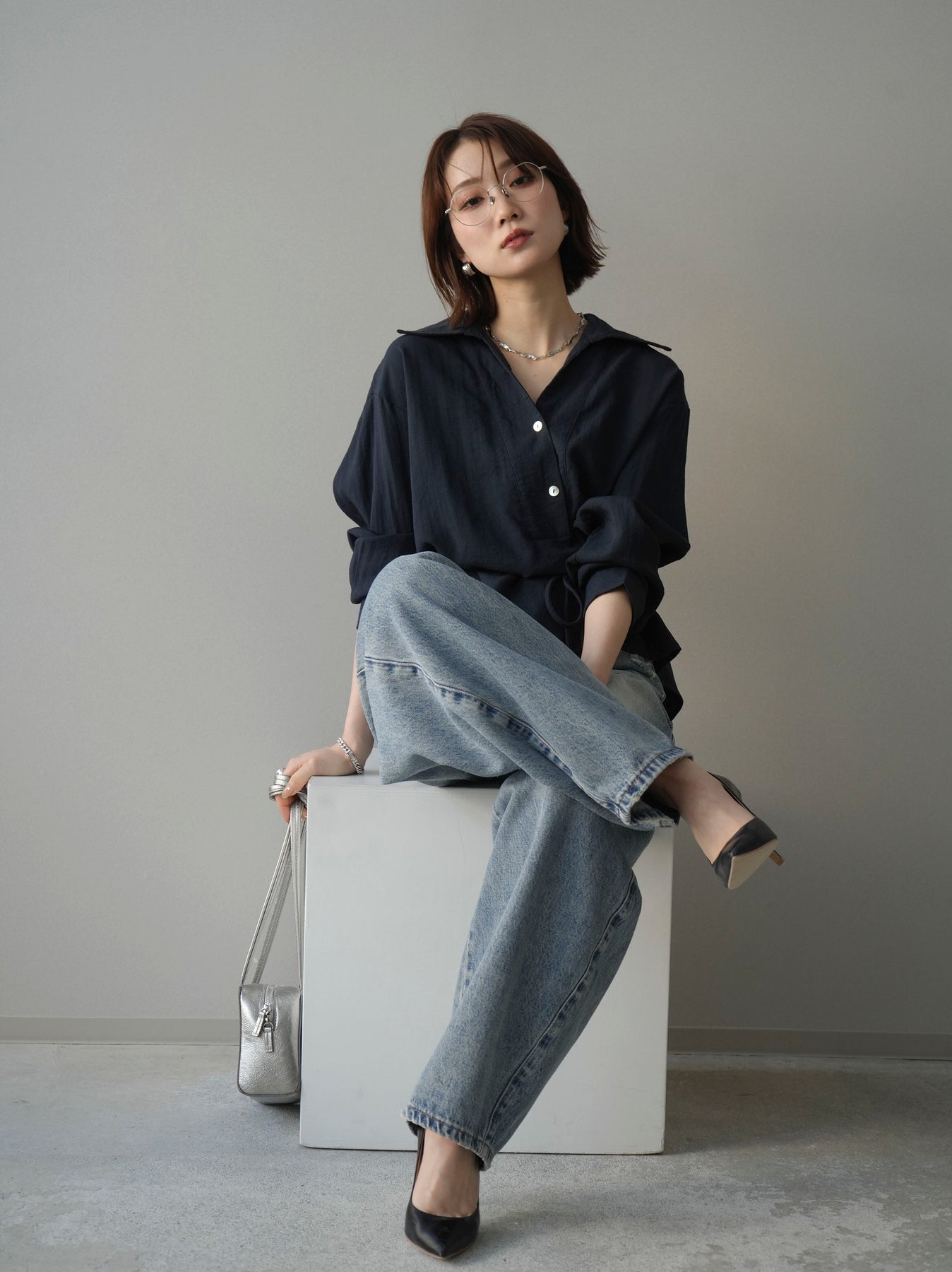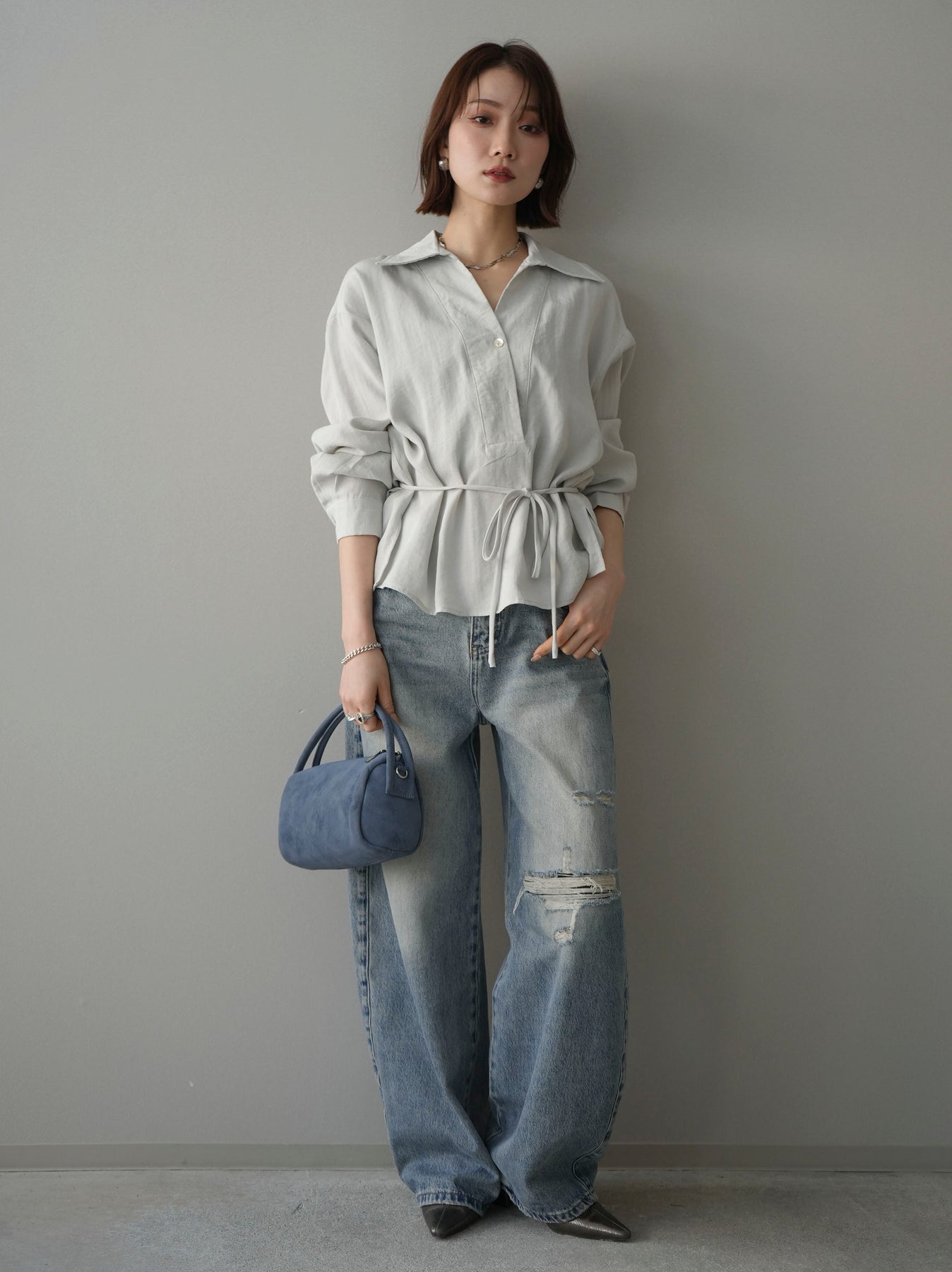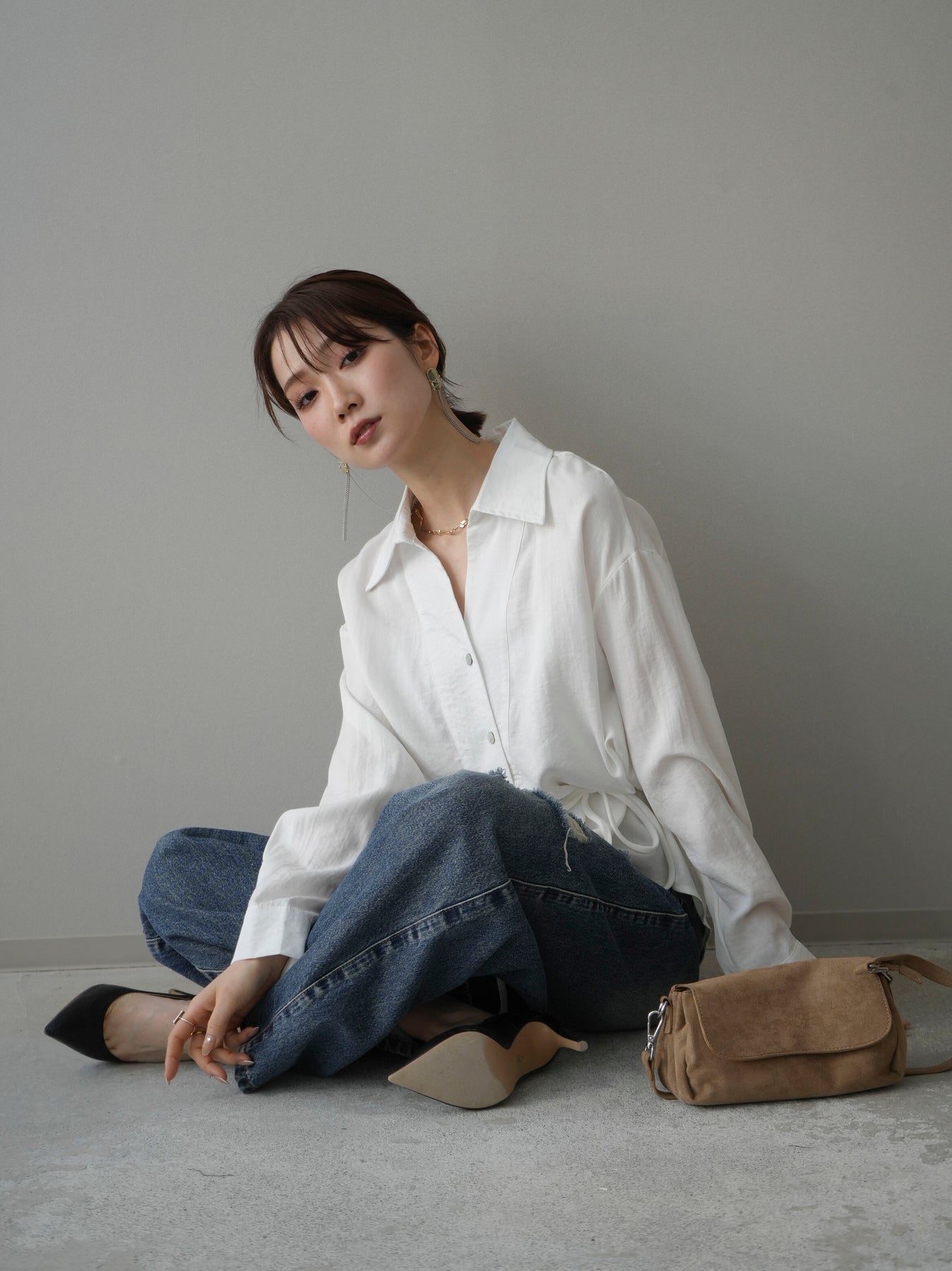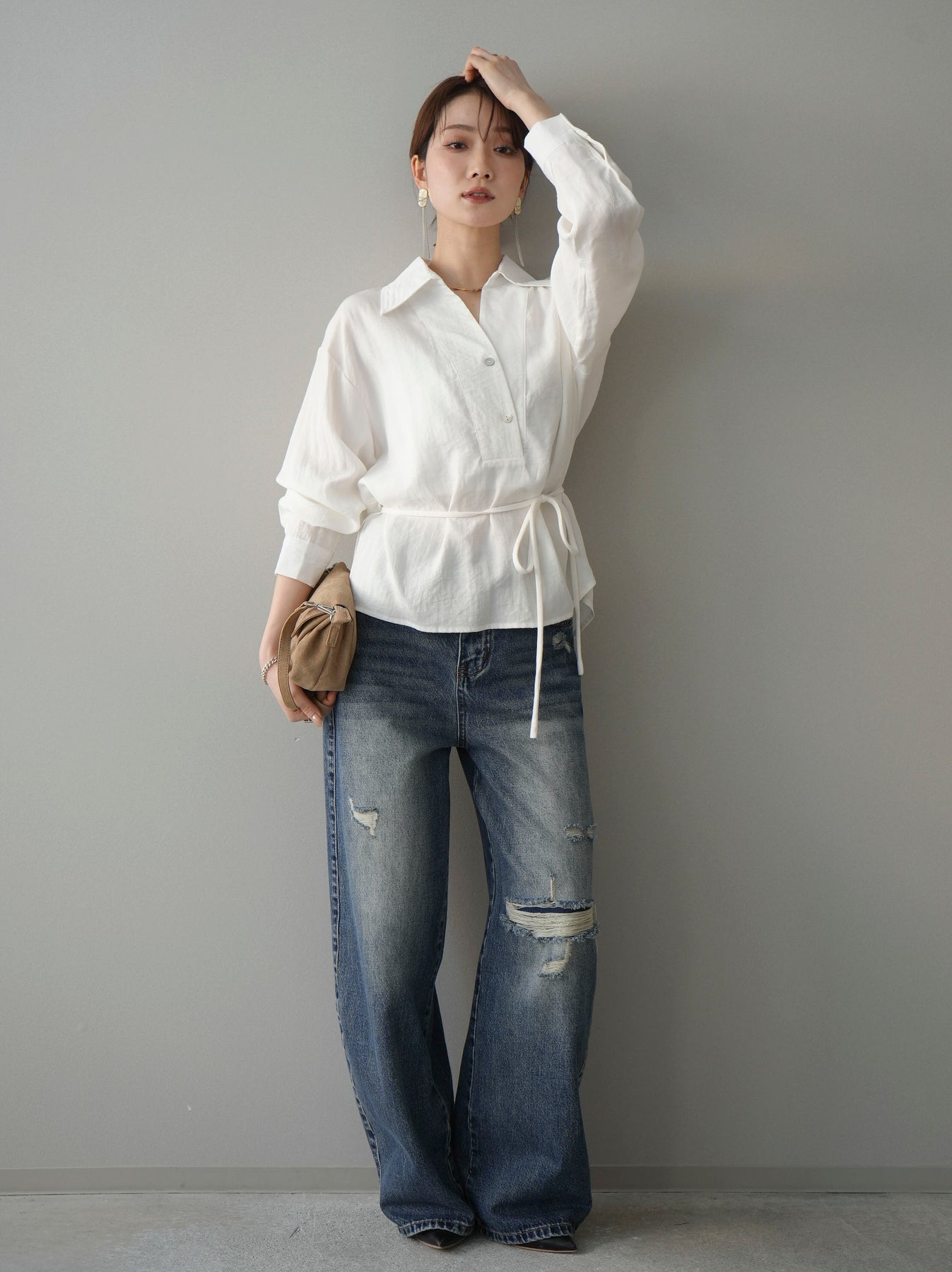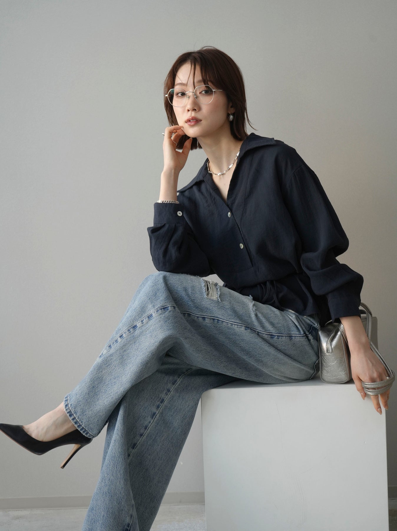 抜け感のあるスキッパーデザインが顔まわりをすっきりと見せてくれるシャツ。程よく落ち感のある素材で、さらりと軽やかな着心地に仕上げました。ウエストリボンでシルエットのアレンジができ、前を開けて羽織としても活躍。きれいめからカジュアルまで幅広いスタイリングに馴染む、着回し力の高い一枚です。 ※ボトムス、キャミソール(インナー)以外の商品は一律でインナーは付属していません