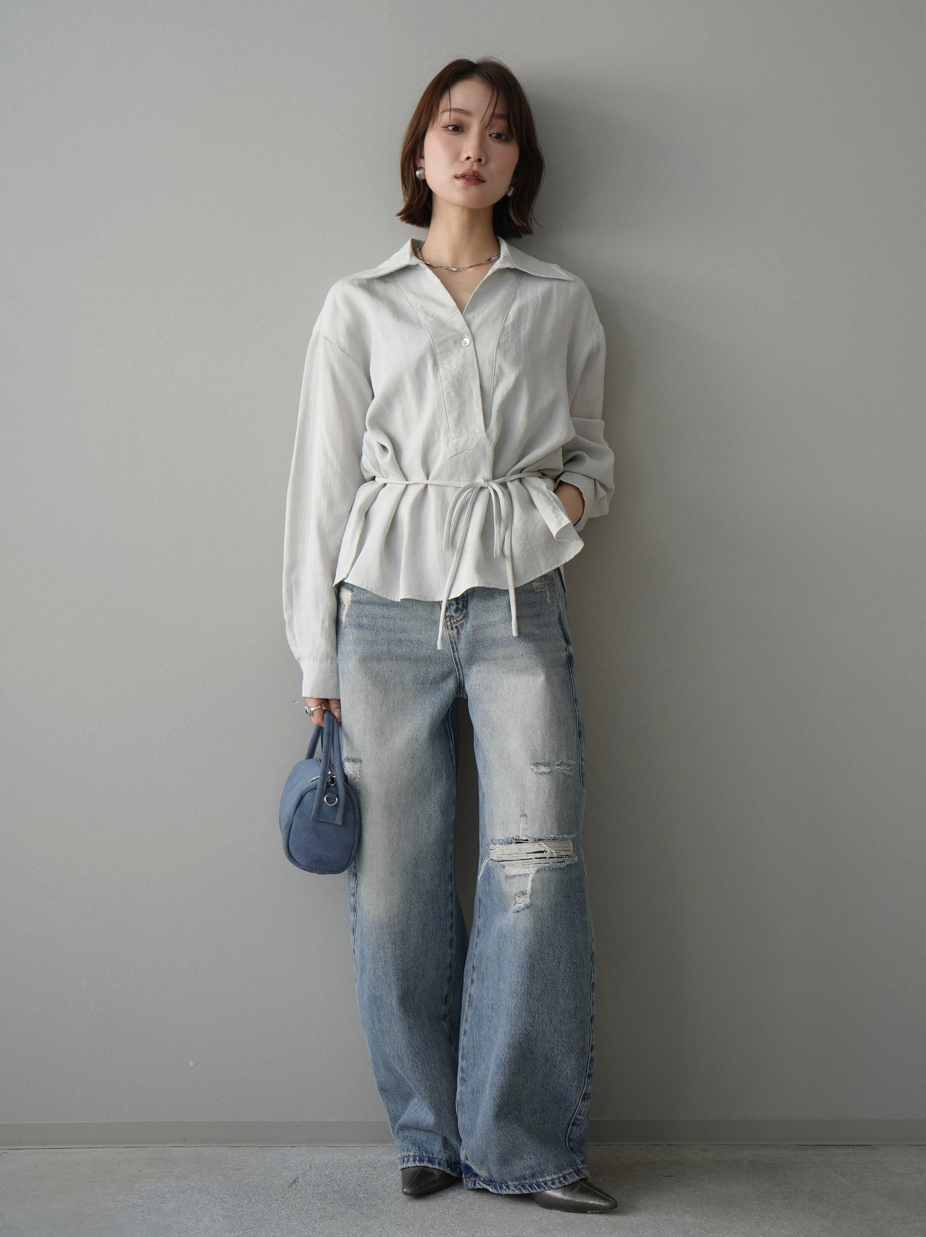 [SET]Vネック変形ラインシャツ+ダメージデニムセミワイドパンツ(2set)