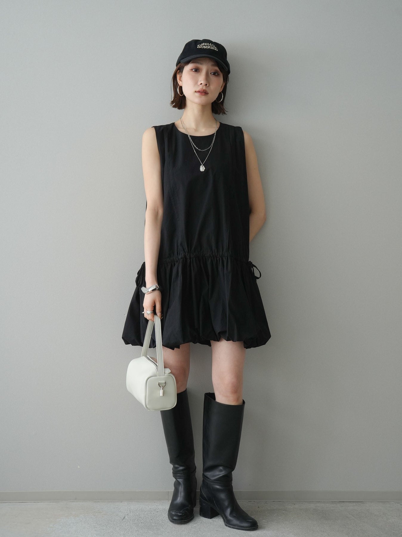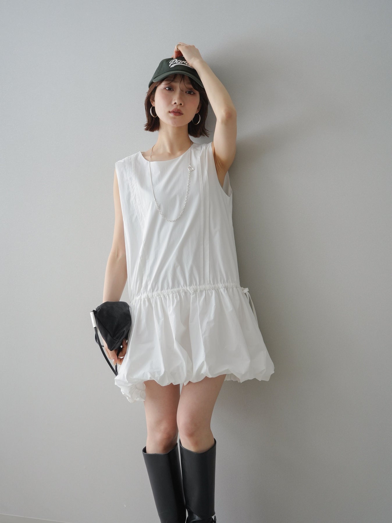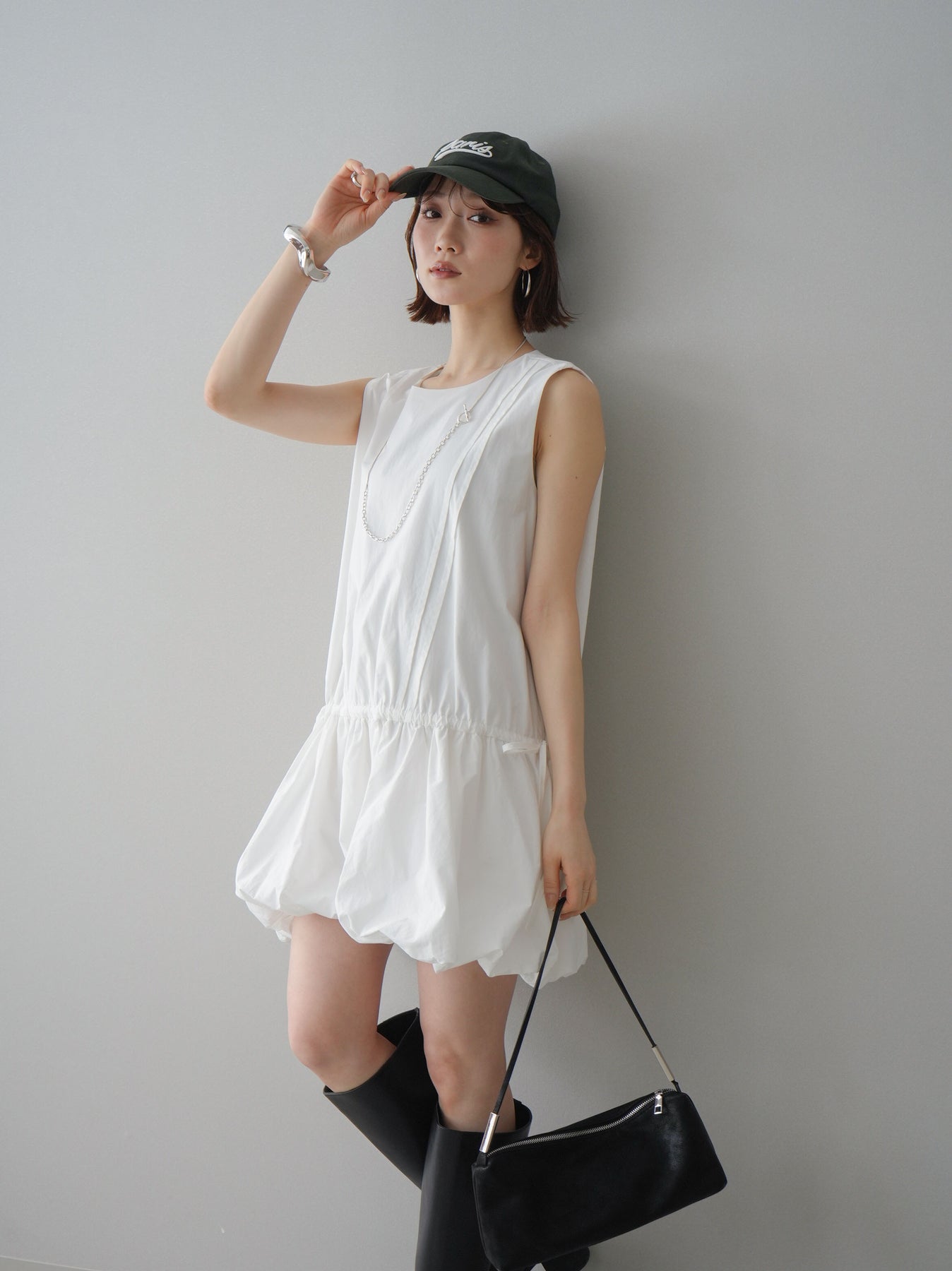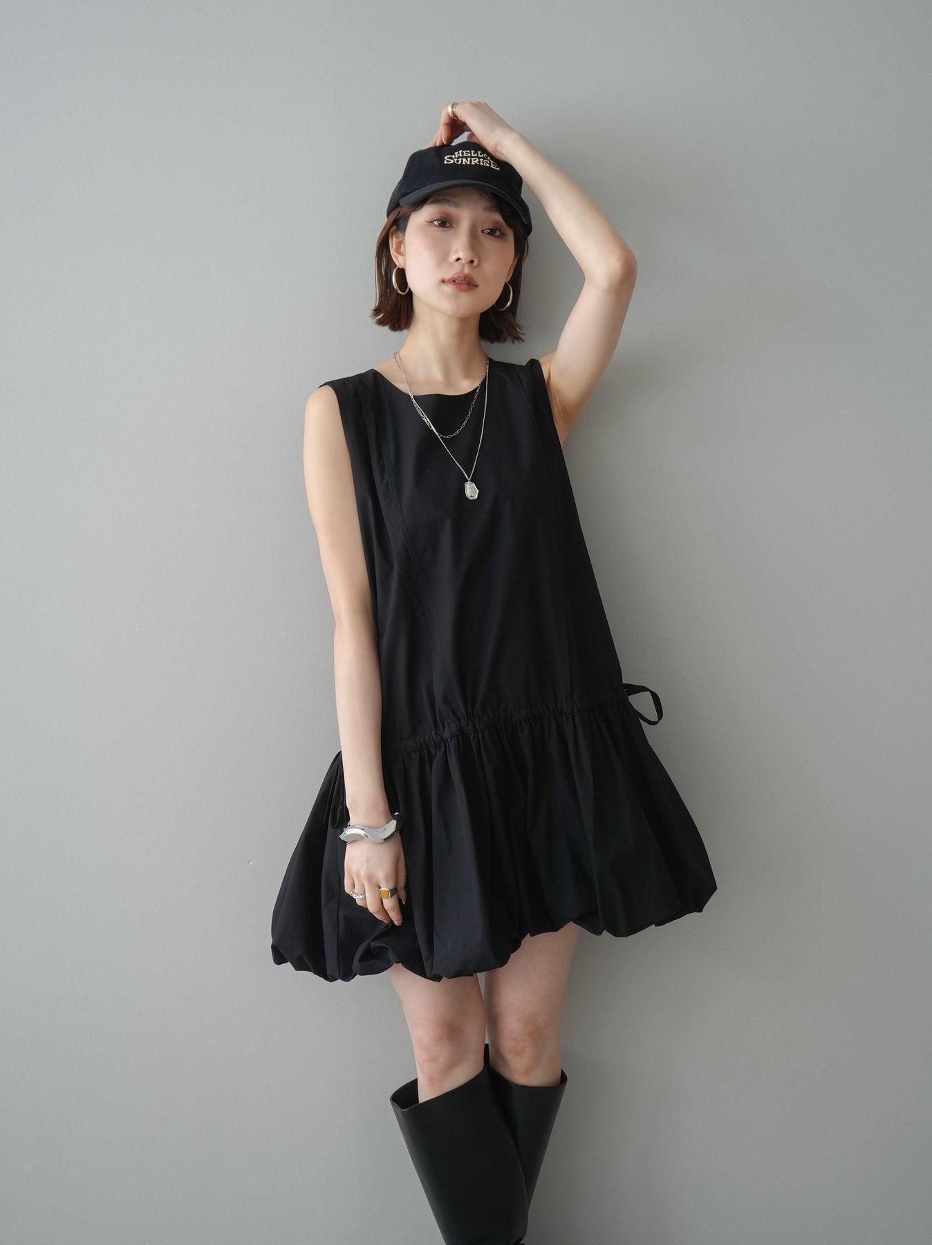 裾にボリュームを持たせたバルーンシルエットが目を惹くノースリーブミニワンピース。すとんと落ちるIラインに切り替えデザインを施し、甘さの中にモードな印象をプラスしました。サイドのリボンディテールがさりげないアクセントになり、シルエットの調整も楽しめる一枚。インナー次第でロングシーズン着回せる、主役級のミニワンピースです。