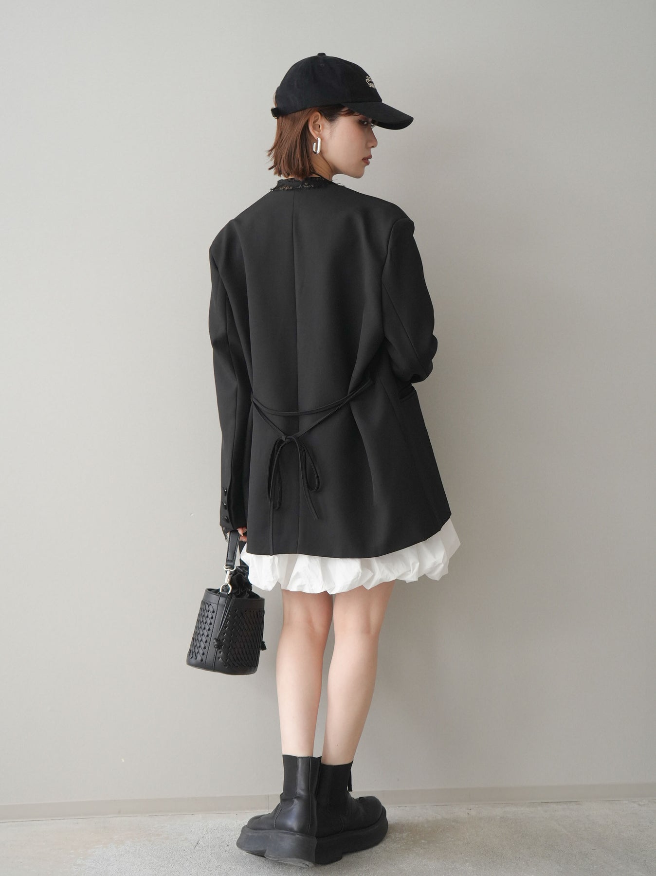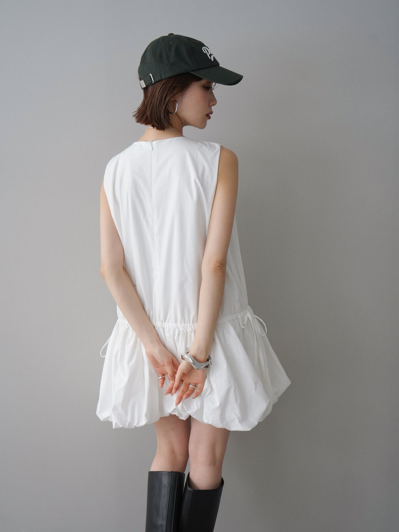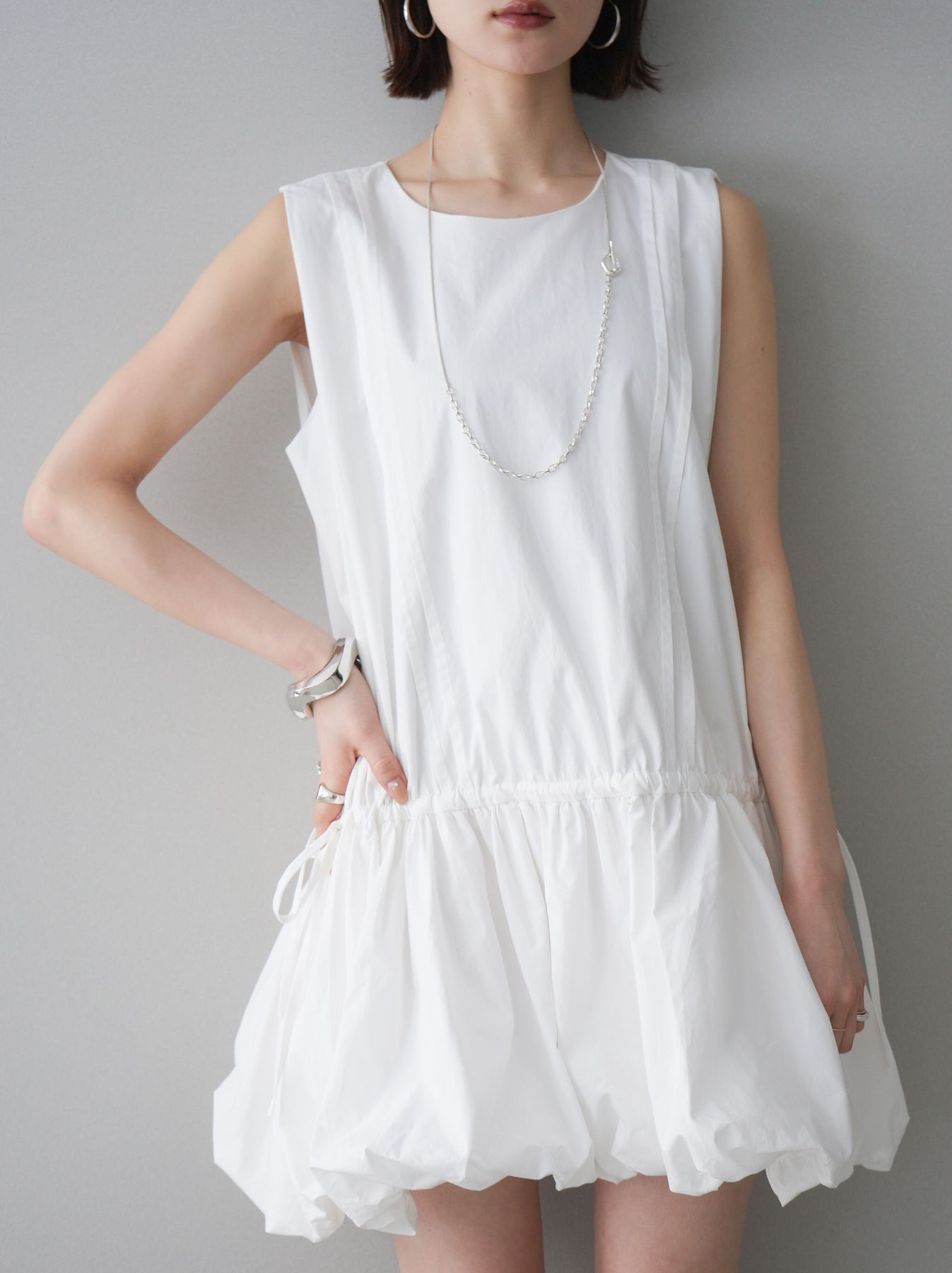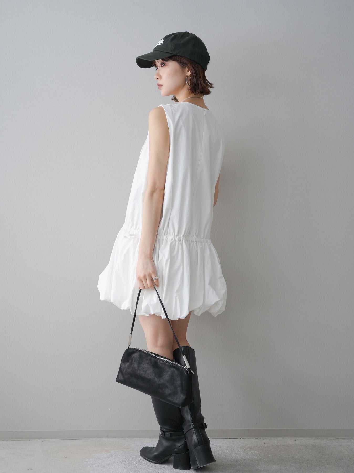 裾にボリュームを持たせたバルーンシルエットが目を惹くノースリーブミニワンピース。すとんと落ちるIラインに切り替えデザインを施し、甘さの中にモードな印象をプラスしました。サイドのリボンディテールがさりげないアクセントになり、シルエットの調整も楽しめる一枚。インナー次第でロングシーズン着回せる、主役級のミニワンピースです。