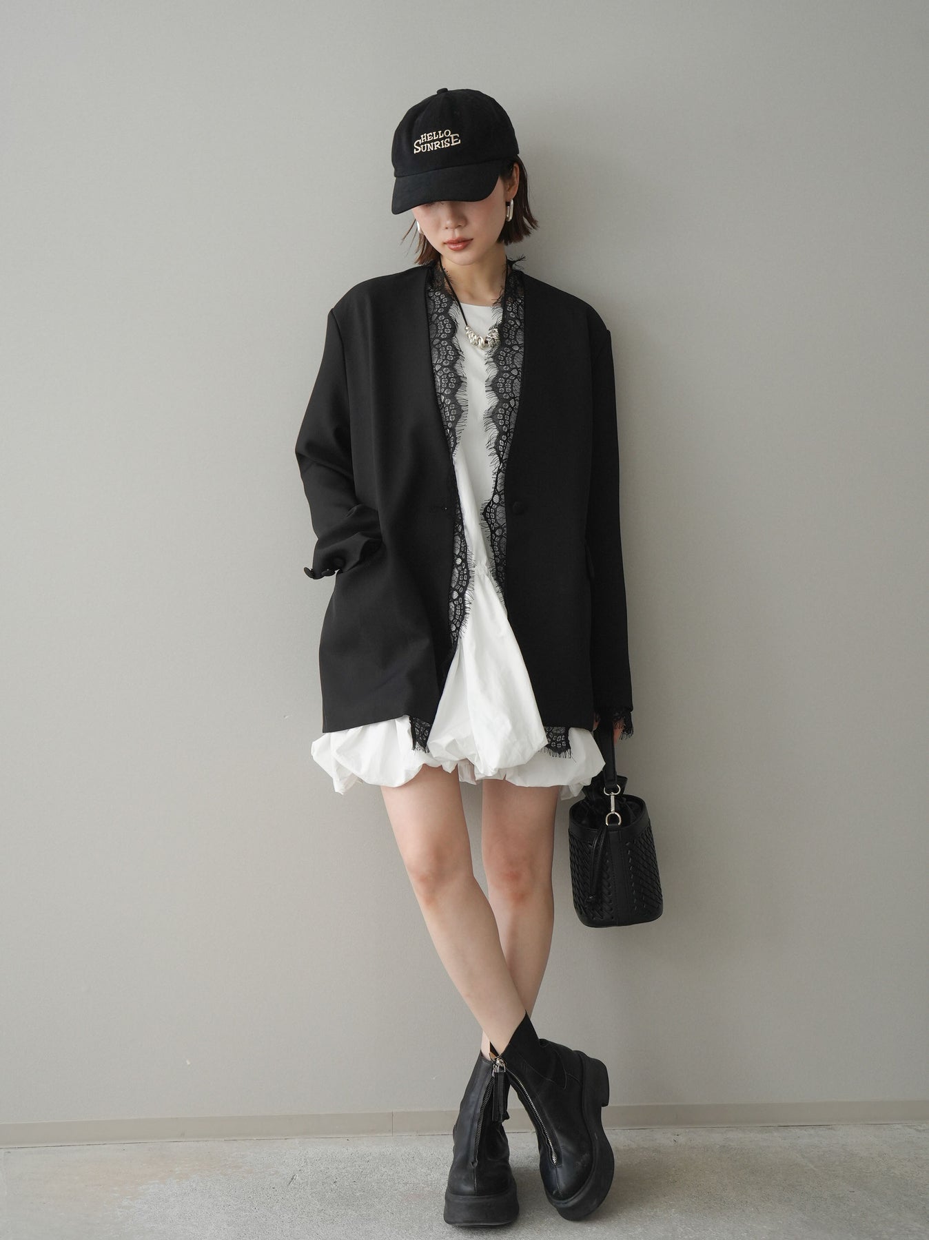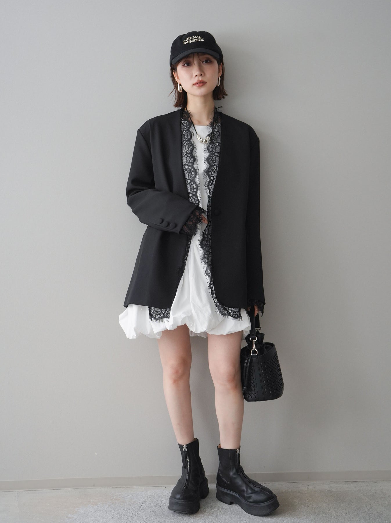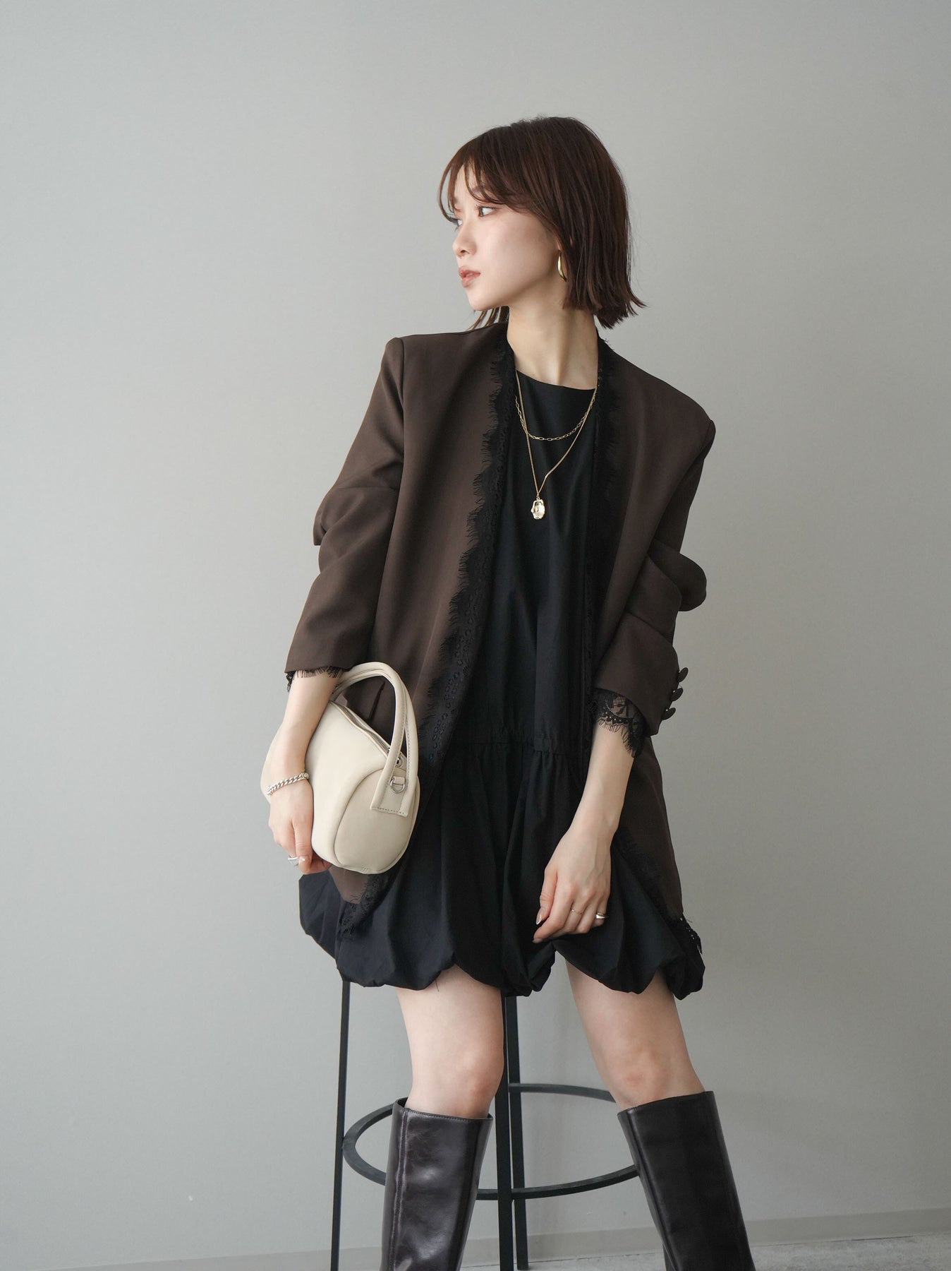 [SET]ノースリバルーンミニワンピース+ノーカラーレースジャケット(2set)
