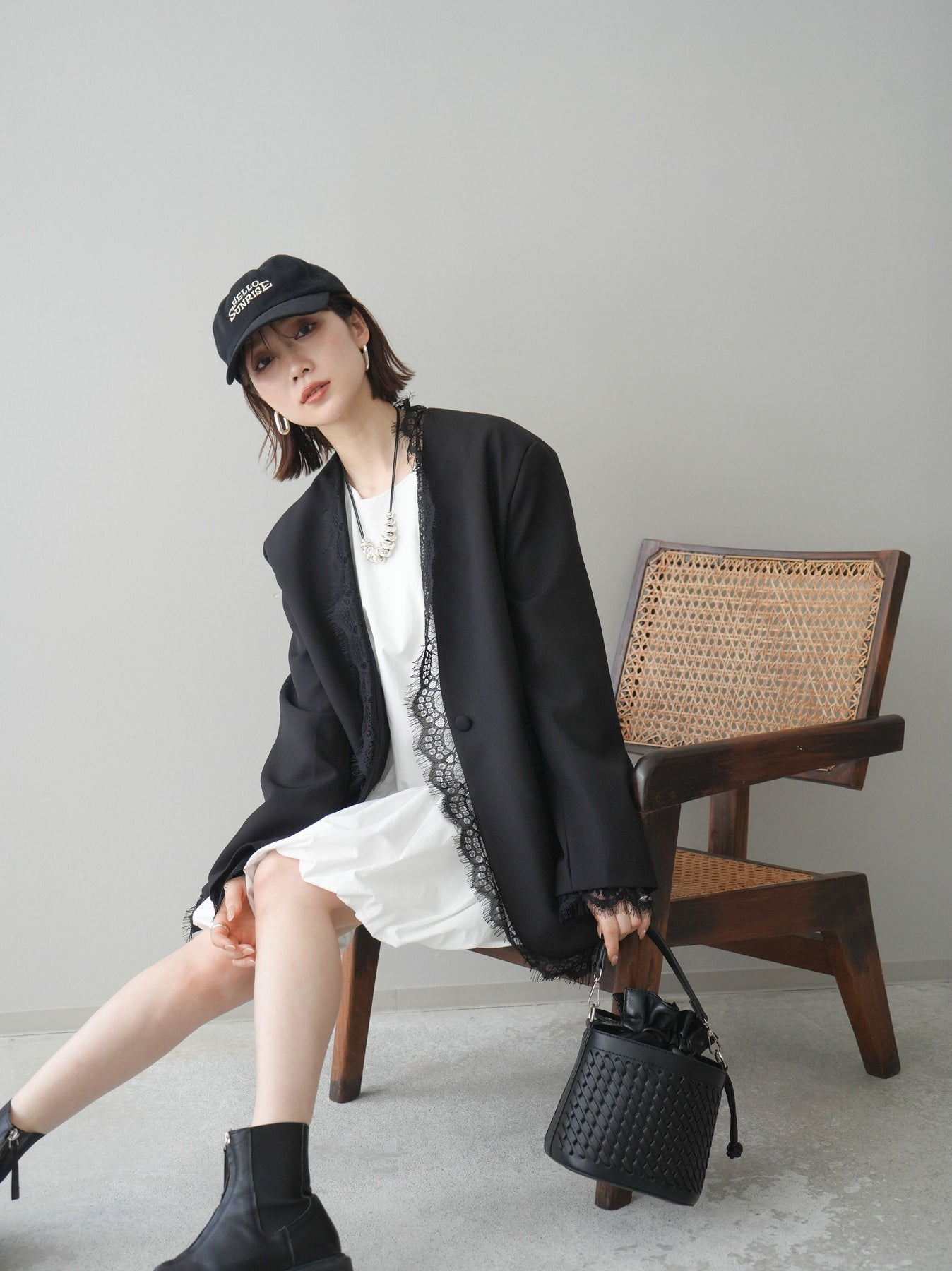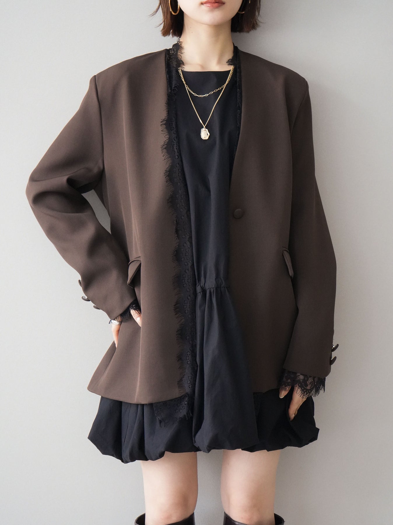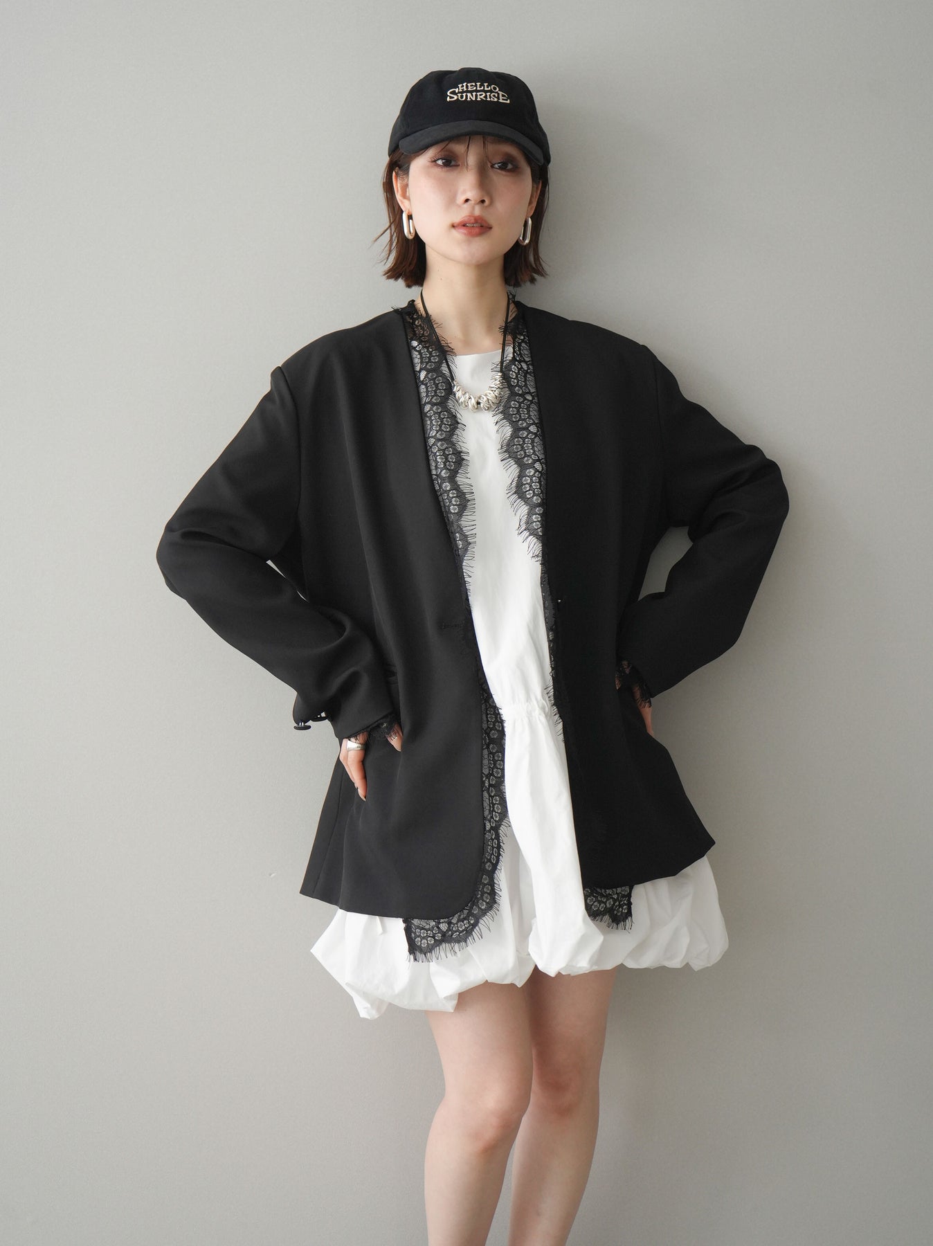 すっきりとしたノーカラーデザインに、繊細なレースをあしらったジャケット。フロントや袖口、裾からさりげなく覗くレースが女性らしさを引き立て、シンプルながらも華やかな印象に仕上げました。程よくゆとりのあるシルエットで、ワンピースやブラウスの上にさらっと羽織るだけで上品なスタイリングが完成します。オケージョンからデイリーまで幅広く活躍する一着です。