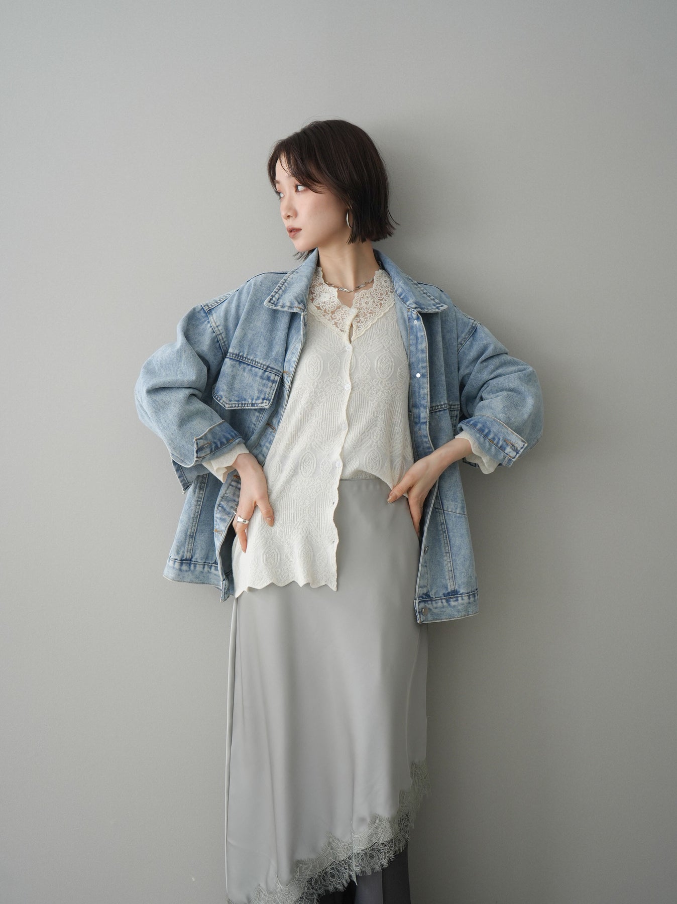 繊細なジャガード編みとレースネックが上品な印象を与えるニットカーディガン。さりげない透け感のある編み地が軽やかさを演出し、Vネックラインにあしらったレースが顔まわりを華やかに彩ります。ほどよくゆとりのあるシルエットで羽織りとしてはもちろん、ボタンを留めてトップス風にも着用可能。デニムからきれいめボトムまで幅広いスタイリングに馴染む一着です。