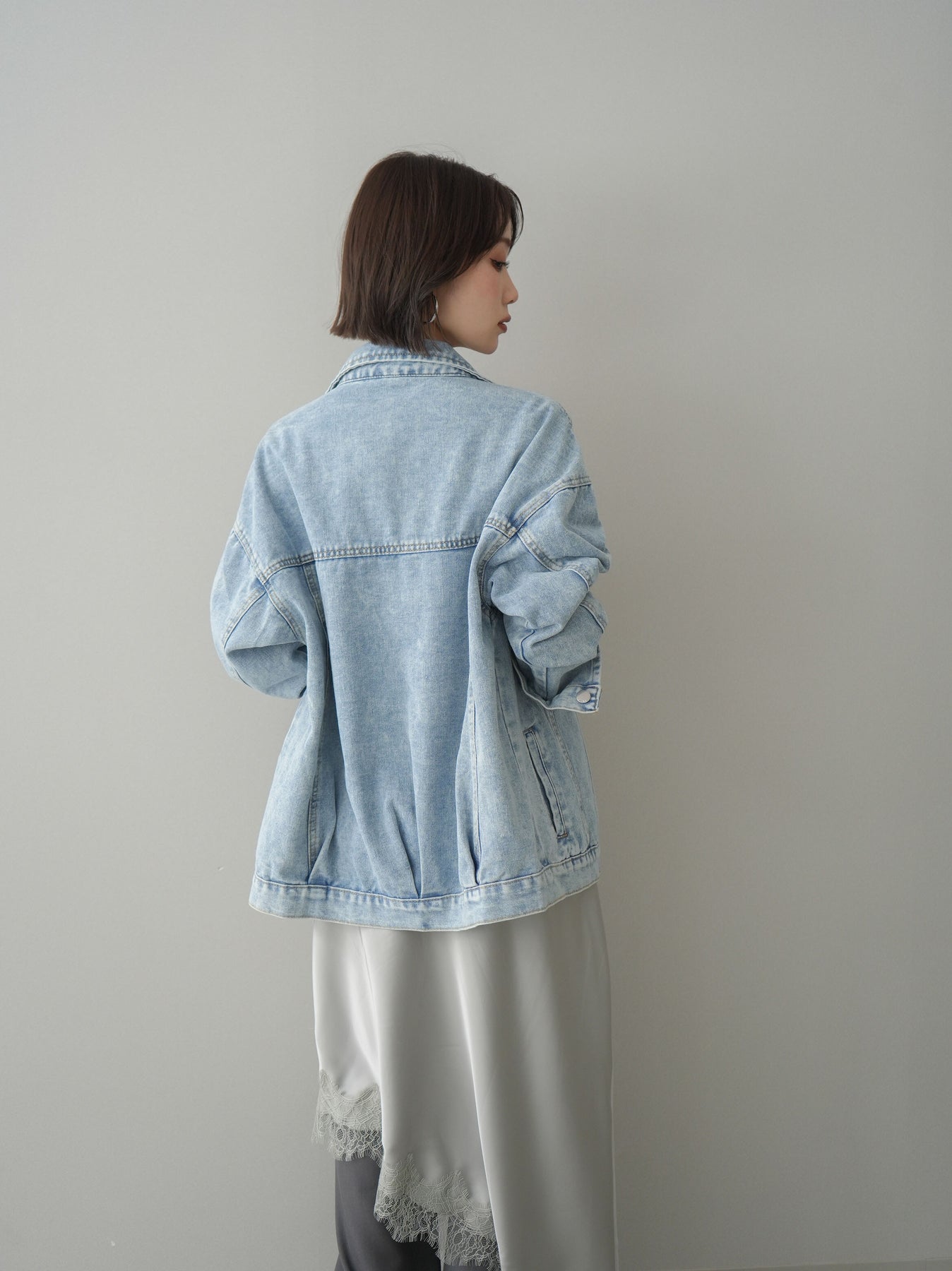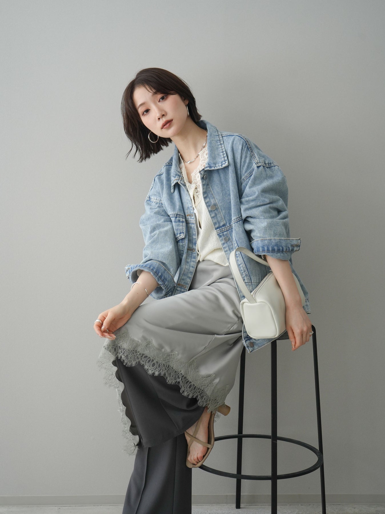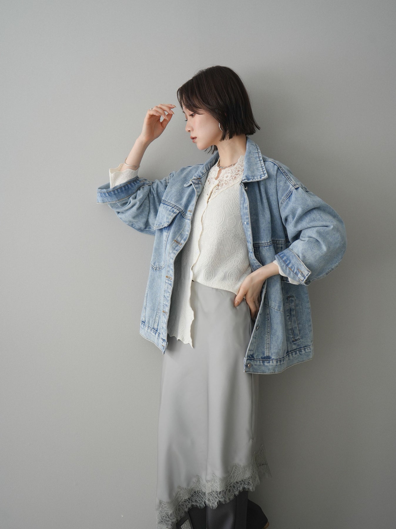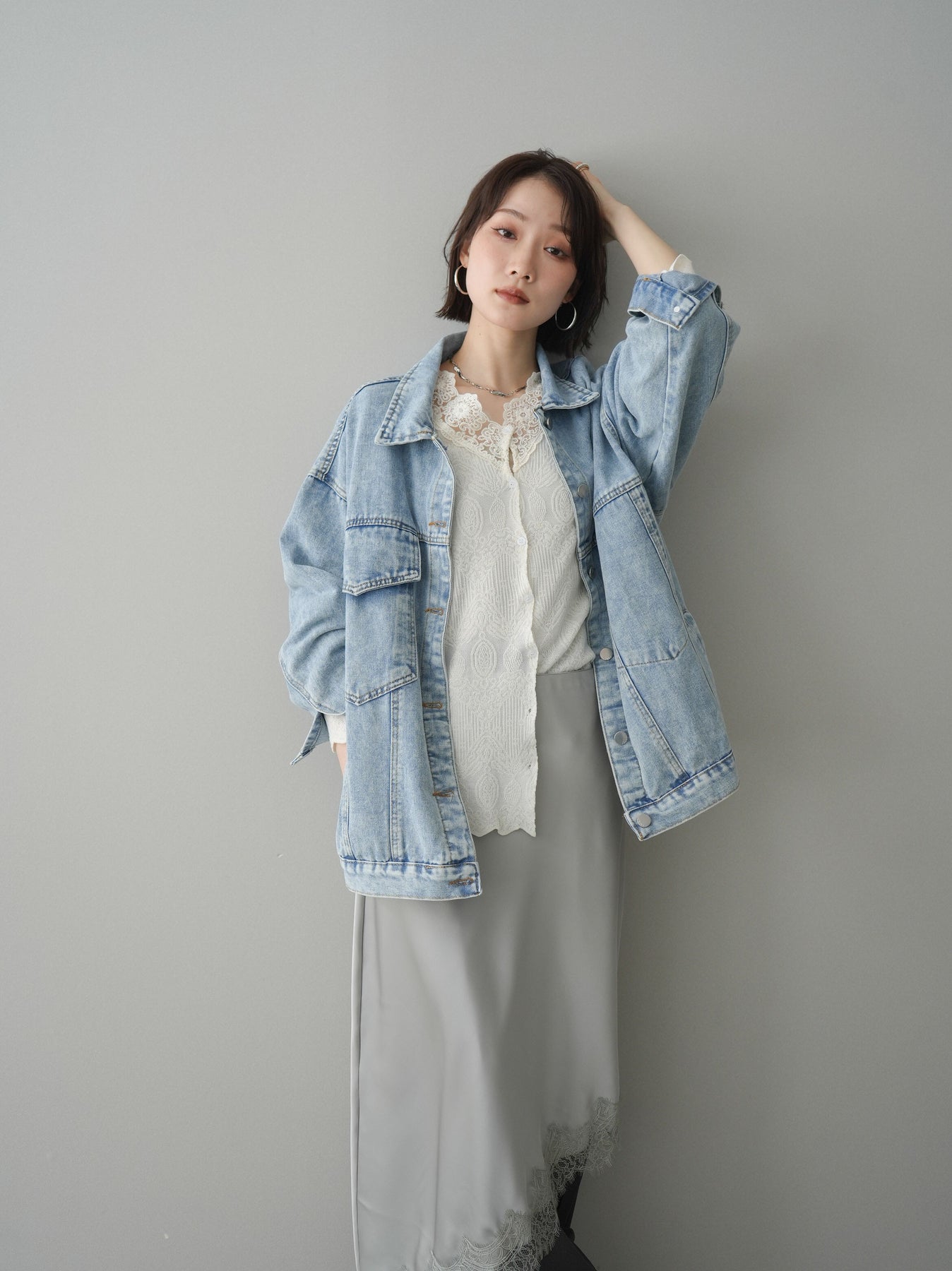 [SET]デザインBIGポケットオーバーデニムジャケット+サテンライクアシメレーススカート+センターシームフレアパンツ(3set)