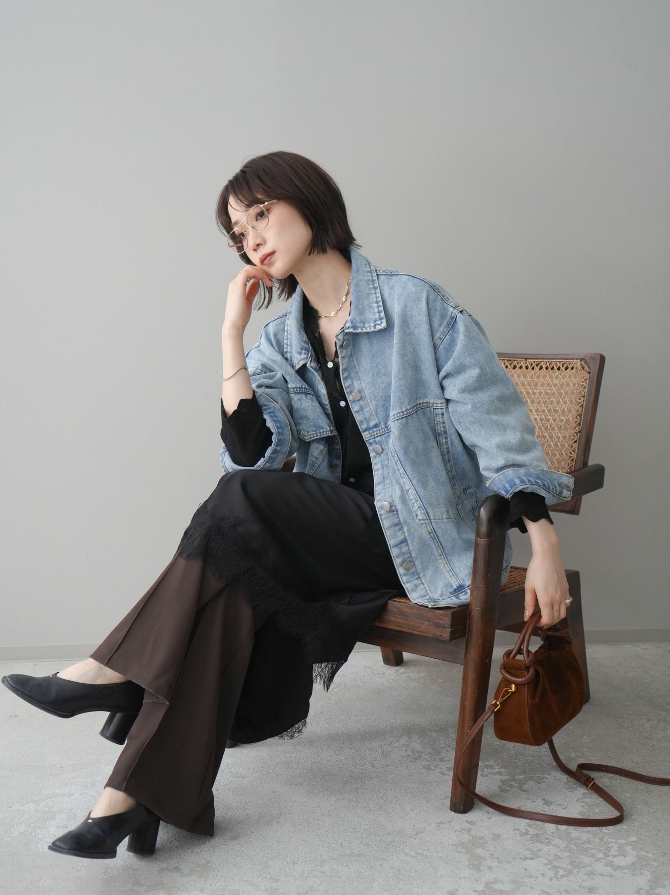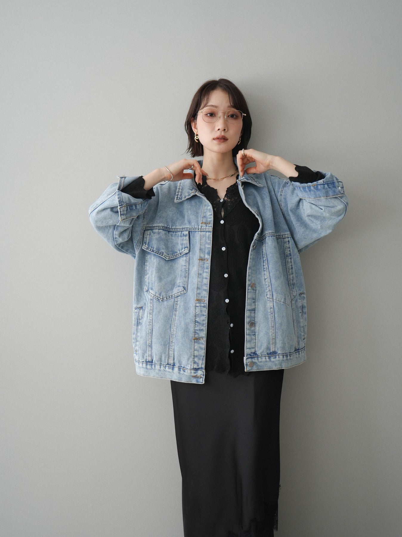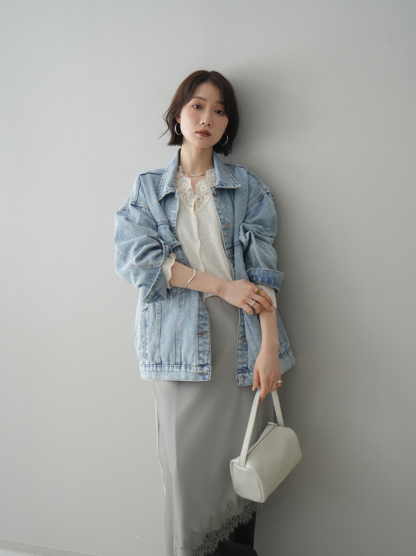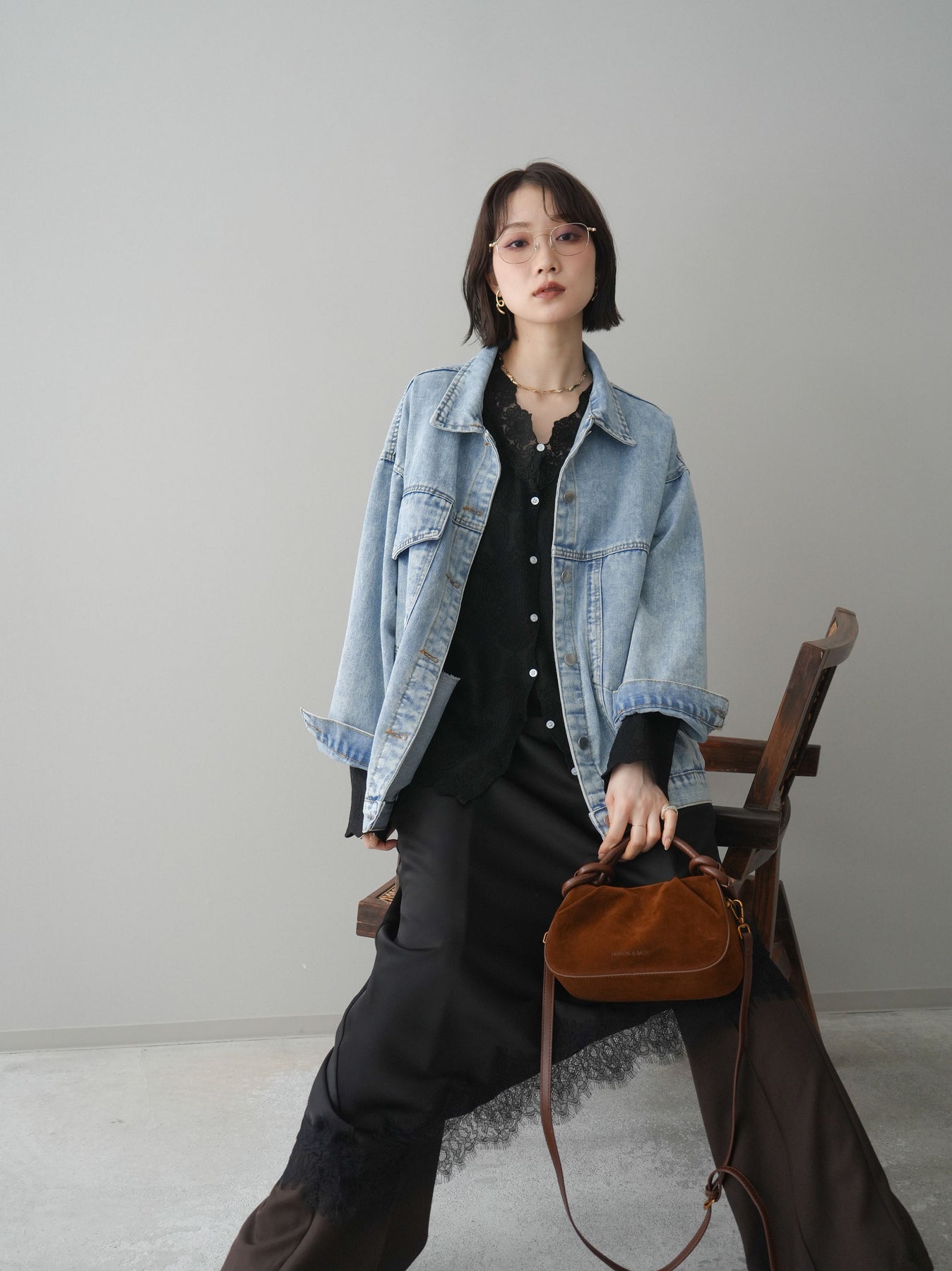 [SET]デザインBIGポケットオーバーデニムジャケット+サテンライクアシメレーススカート+センターシームフレアパンツ(3set)