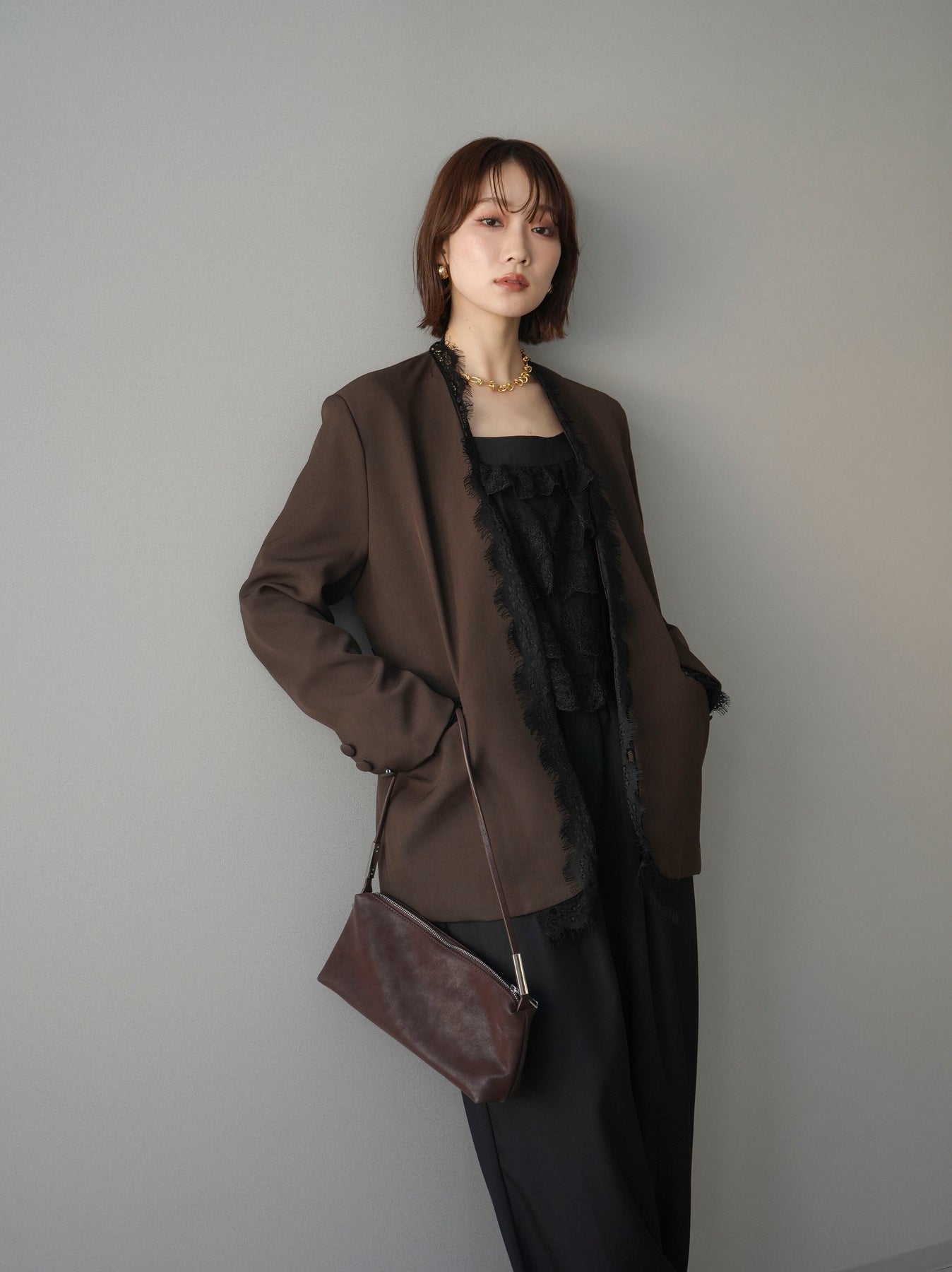 すっきりとしたノーカラーデザインに、繊細なレースをあしらったジャケット。フロントや袖口、裾からさりげなく覗くレースが女性らしさを引き立て、シンプルながらも華やかな印象に仕上げました。程よくゆとりのあるシルエットで、ワンピースやブラウスの上にさらっと羽織るだけで上品なスタイリングが完成します。オケージョンからデイリーまで幅広く活躍する一着です。