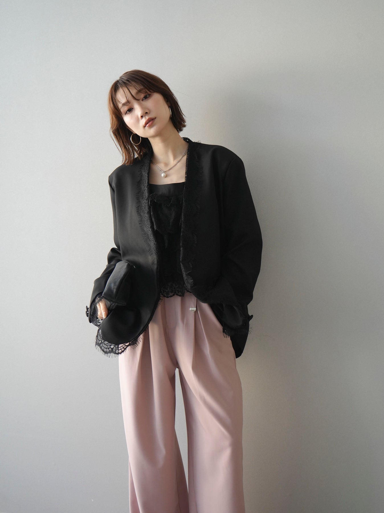 すっきりとしたノーカラーデザインに、繊細なレースをあしらったジャケット。フロントや袖口、裾からさりげなく覗くレースが女性らしさを引き立て、シンプルながらも華やかな印象に仕上げました。程よくゆとりのあるシルエットで、ワンピースやブラウスの上にさらっと羽織るだけで上品なスタイリングが完成します。オケージョンからデイリーまで幅広く活躍する一着です。