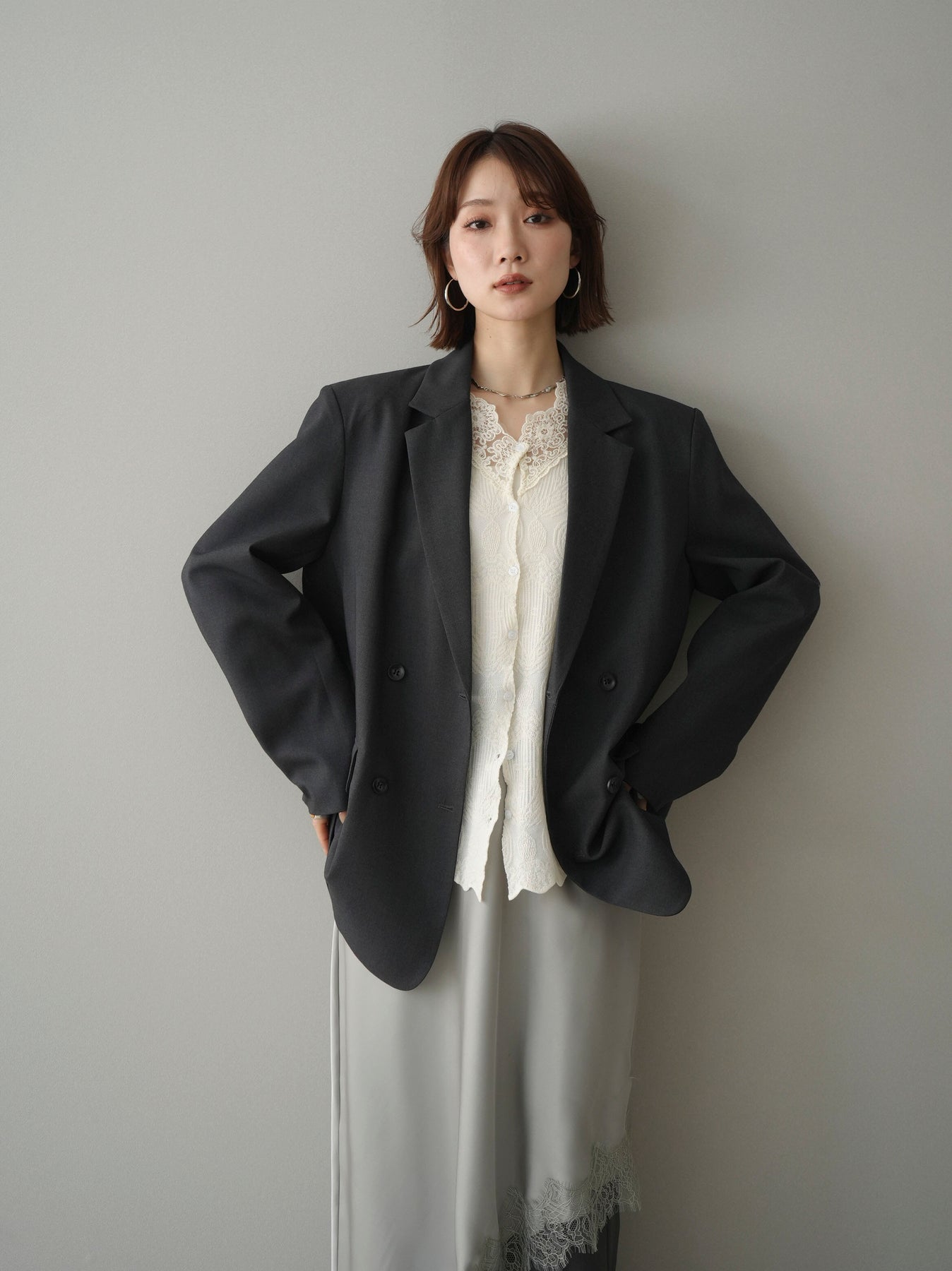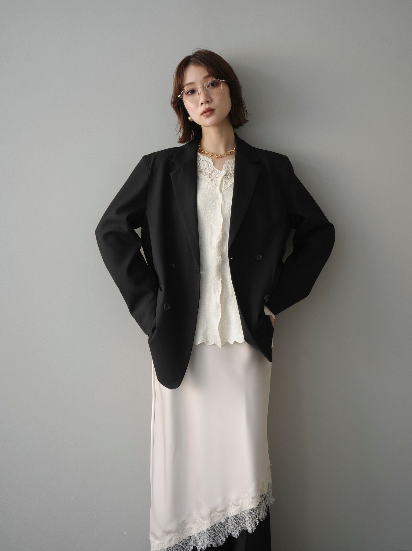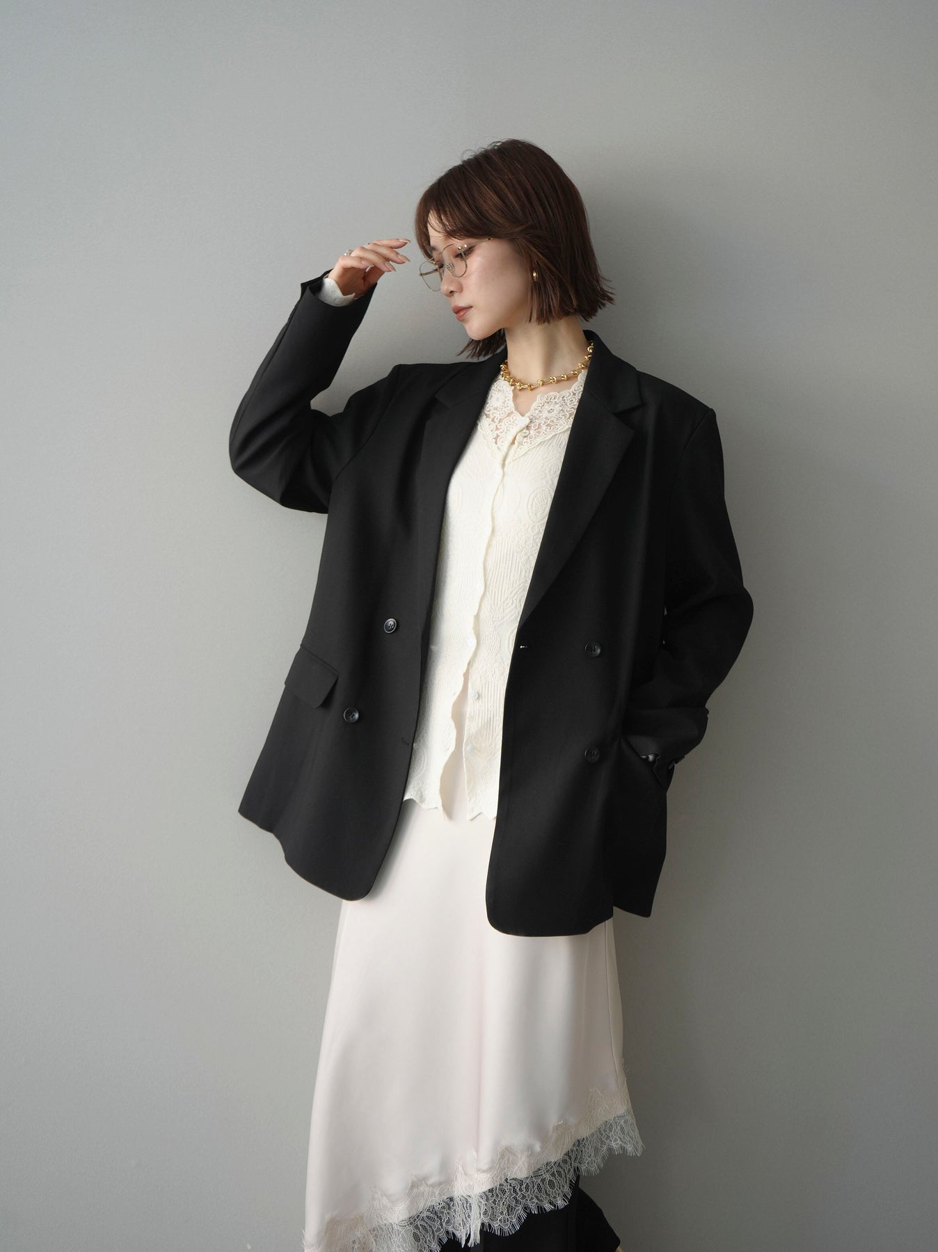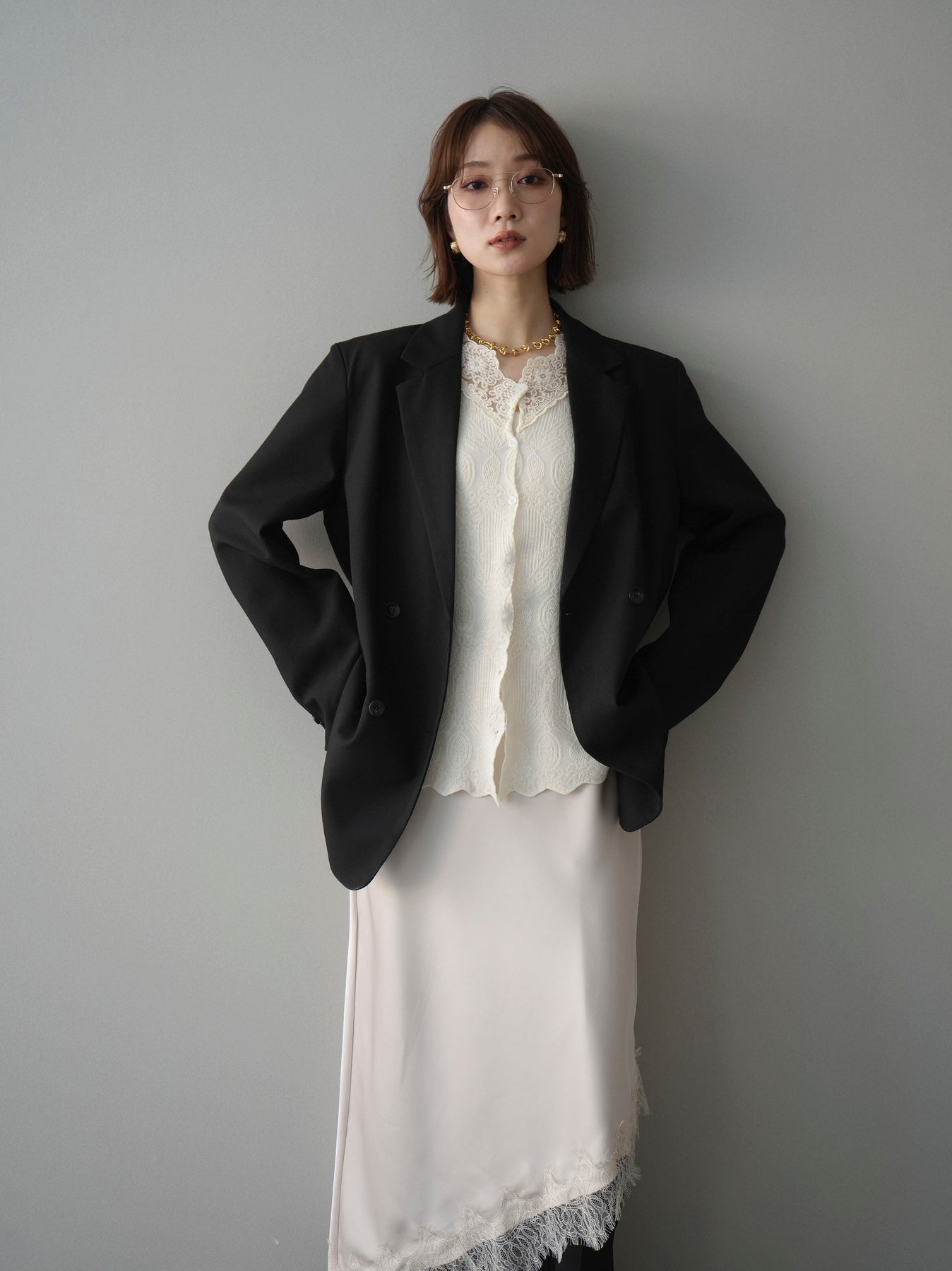 [SET]ダブルブレストオーバージャケット+レースネックジャガードニットカーディガン(2set)