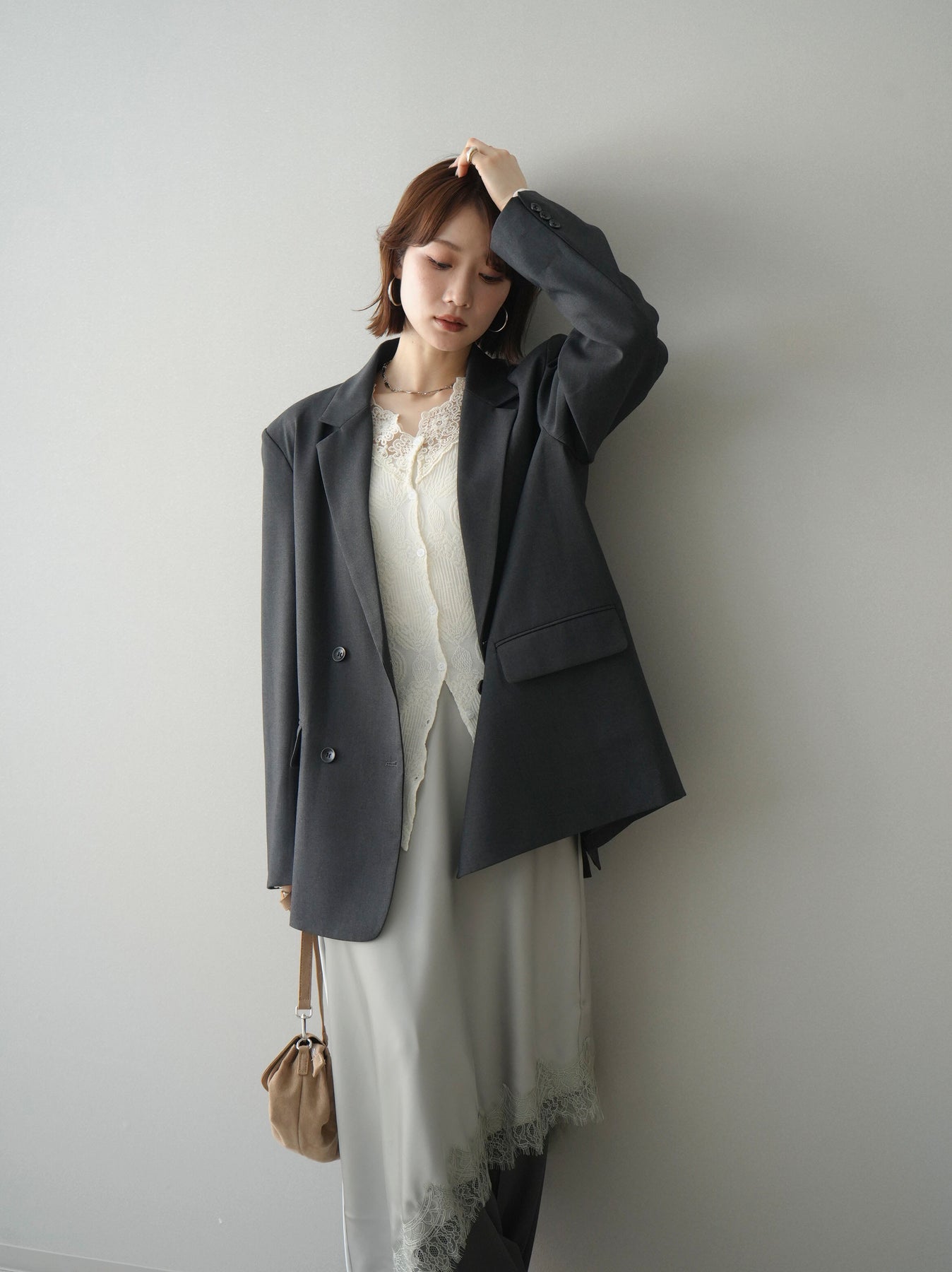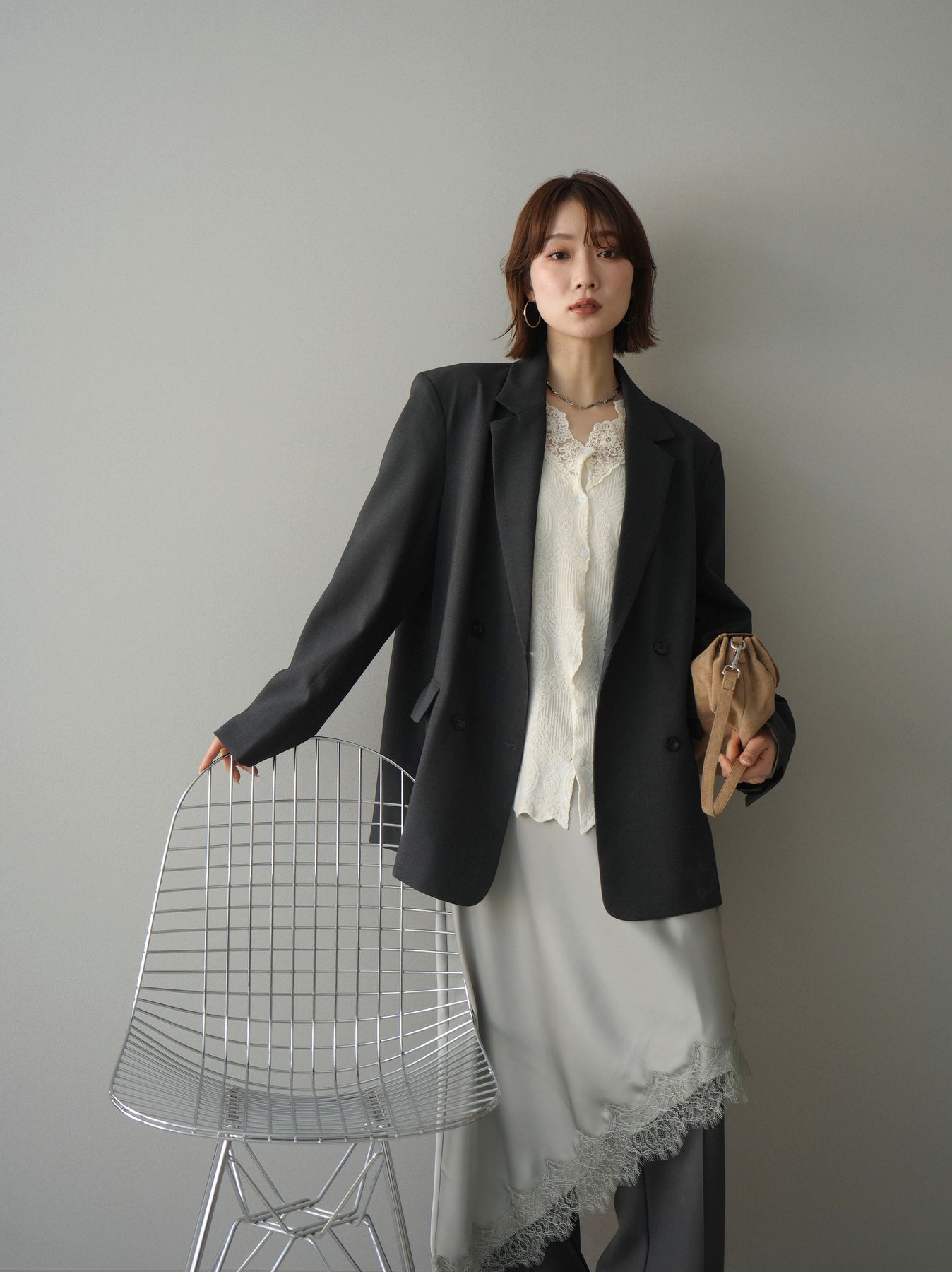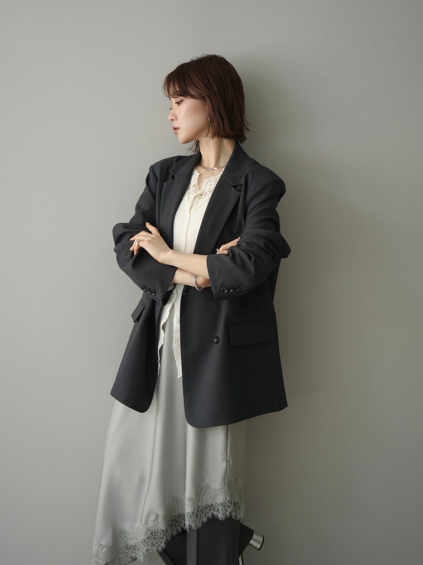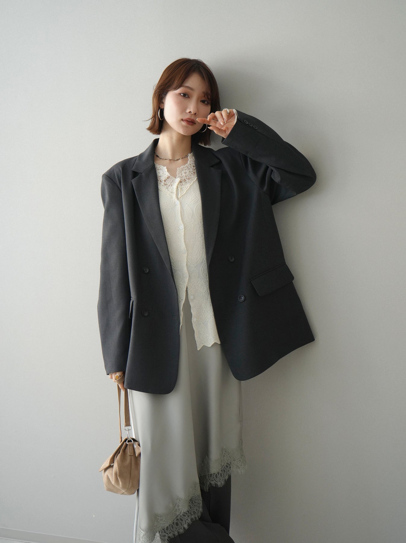 [SET]ダブルブレストオーバージャケット+レースネックジャガードニットカーディガン(2set)