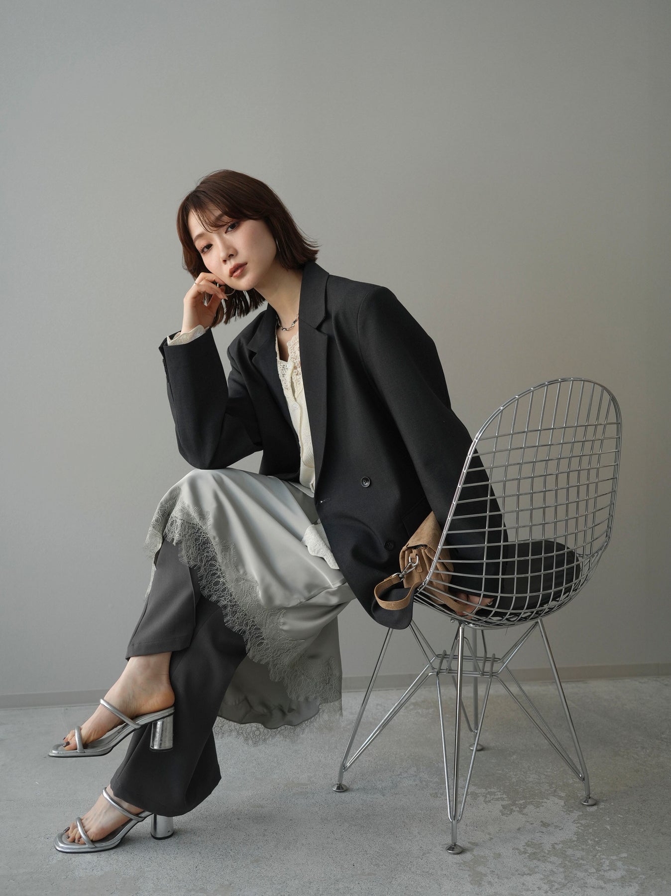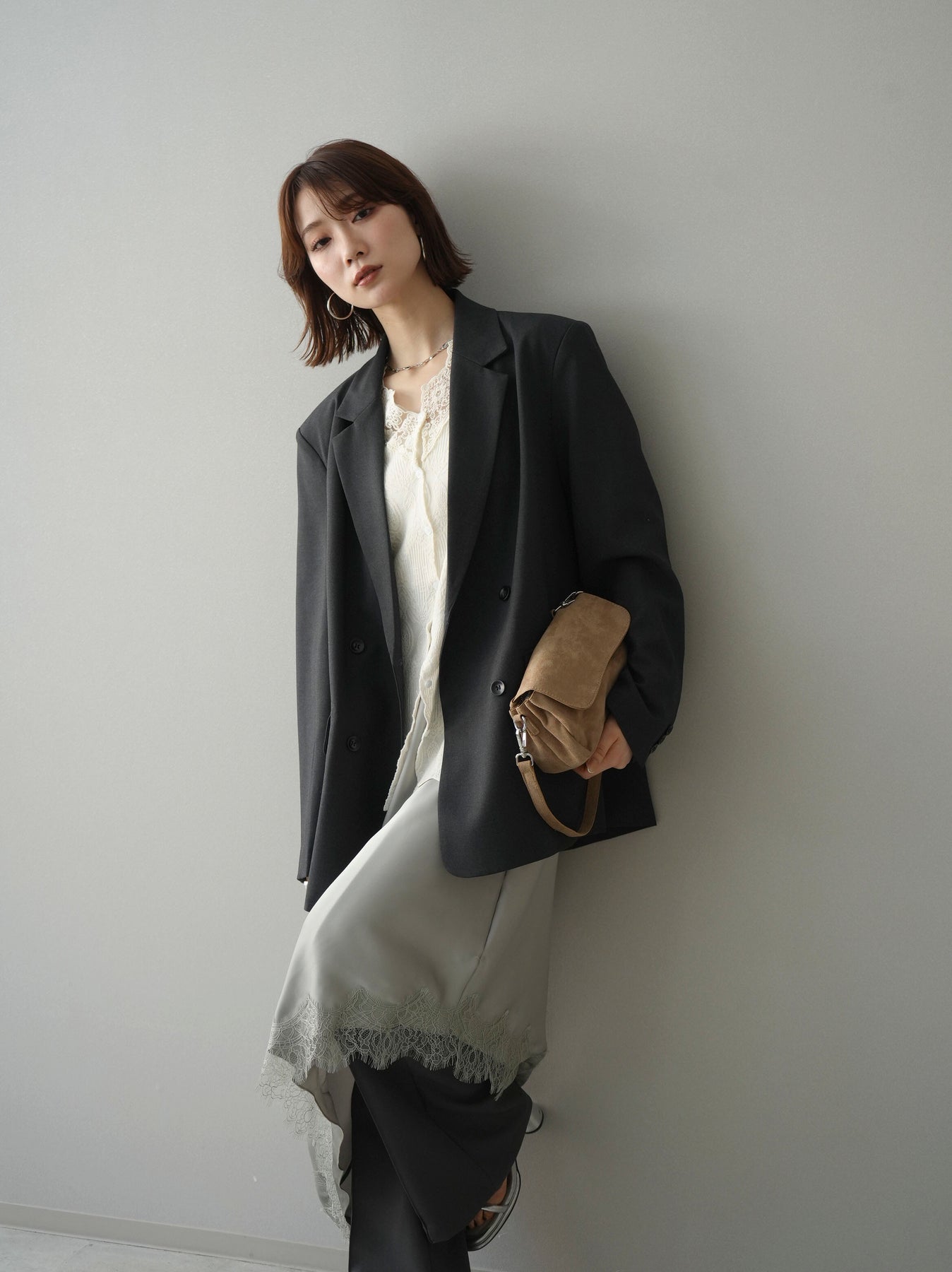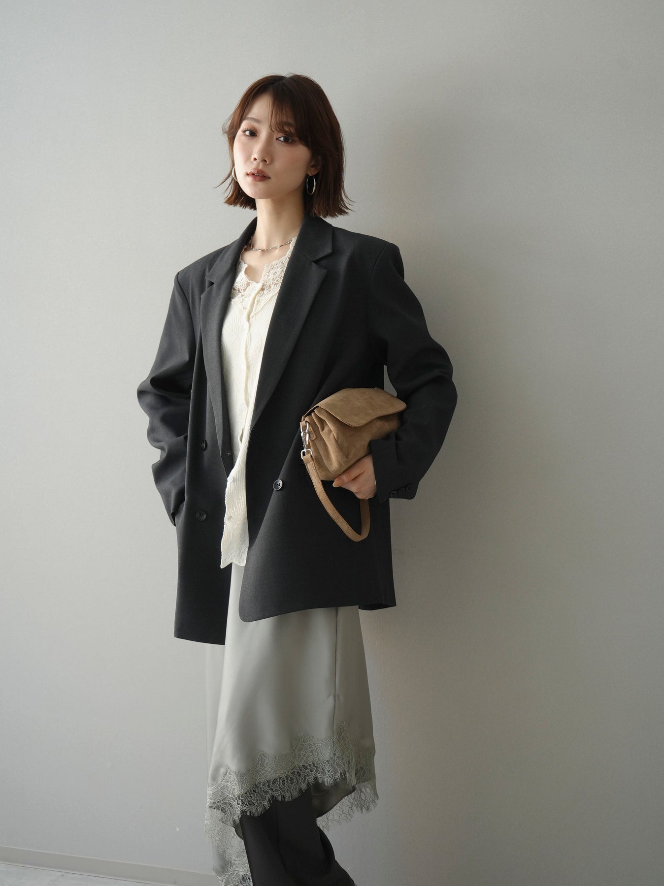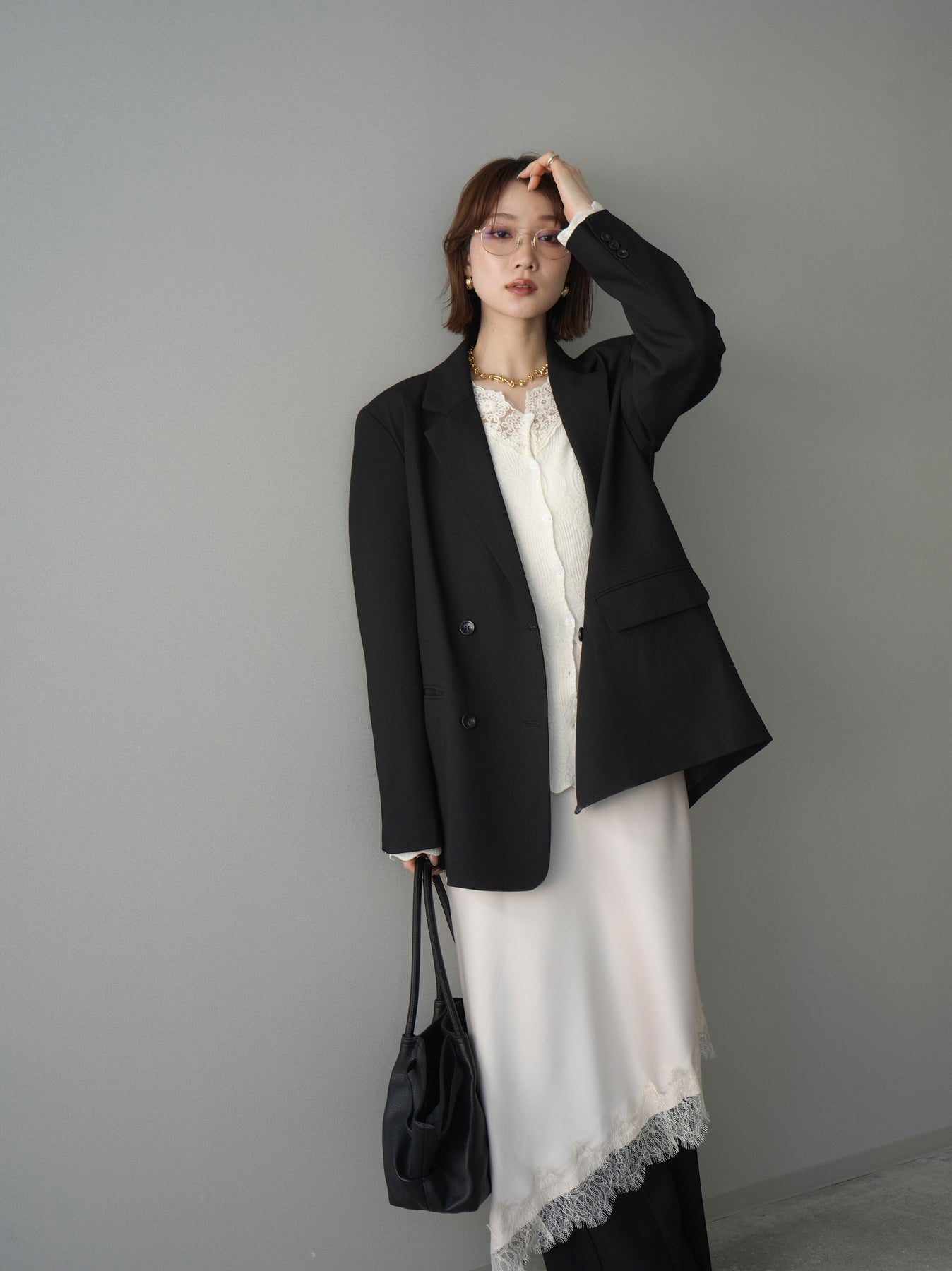 [SET]ダブルブレストオーバージャケット+レースネックジャガードニットカーディガン(2set)