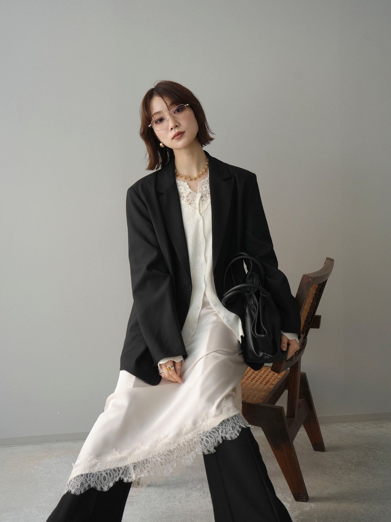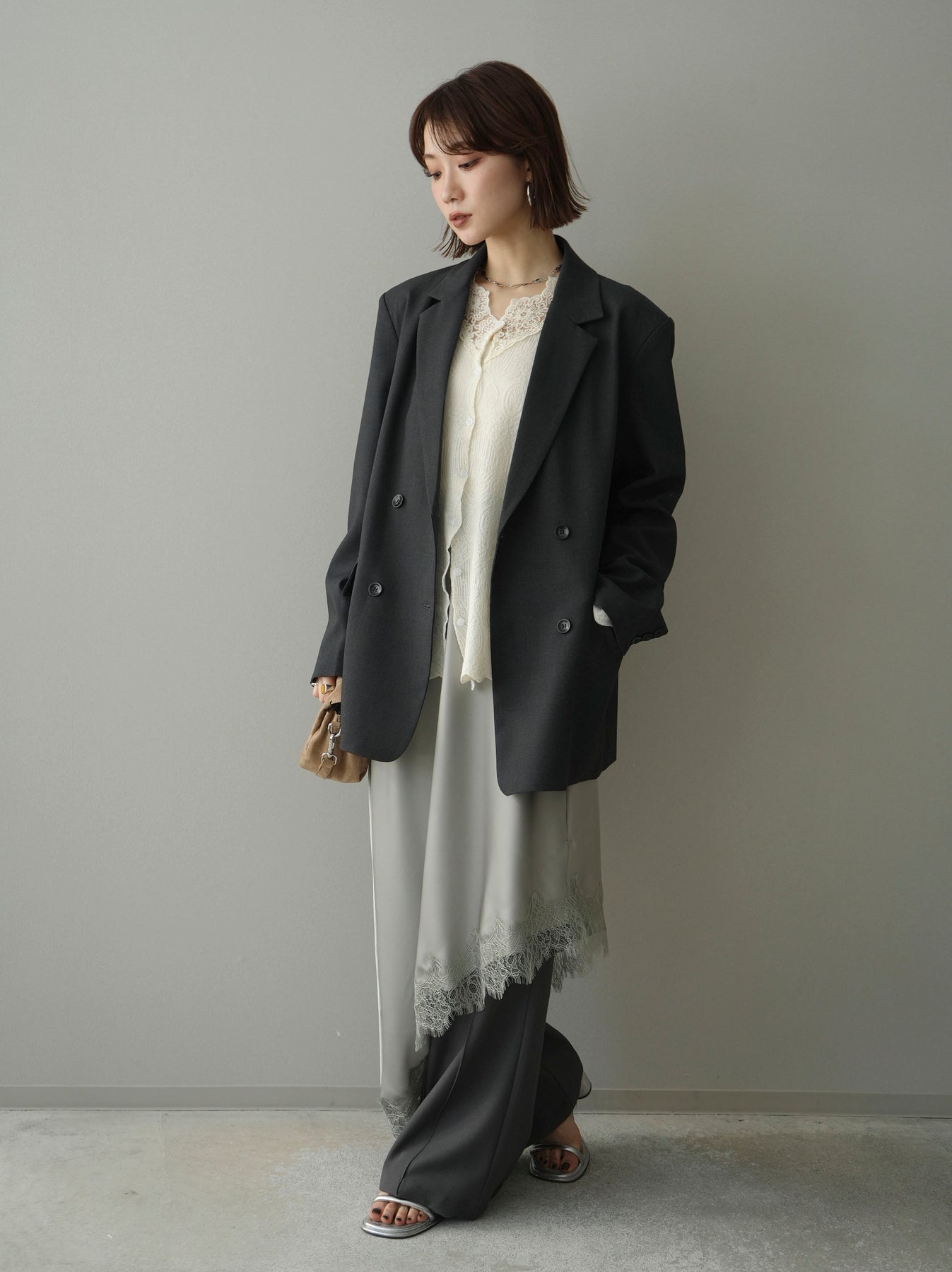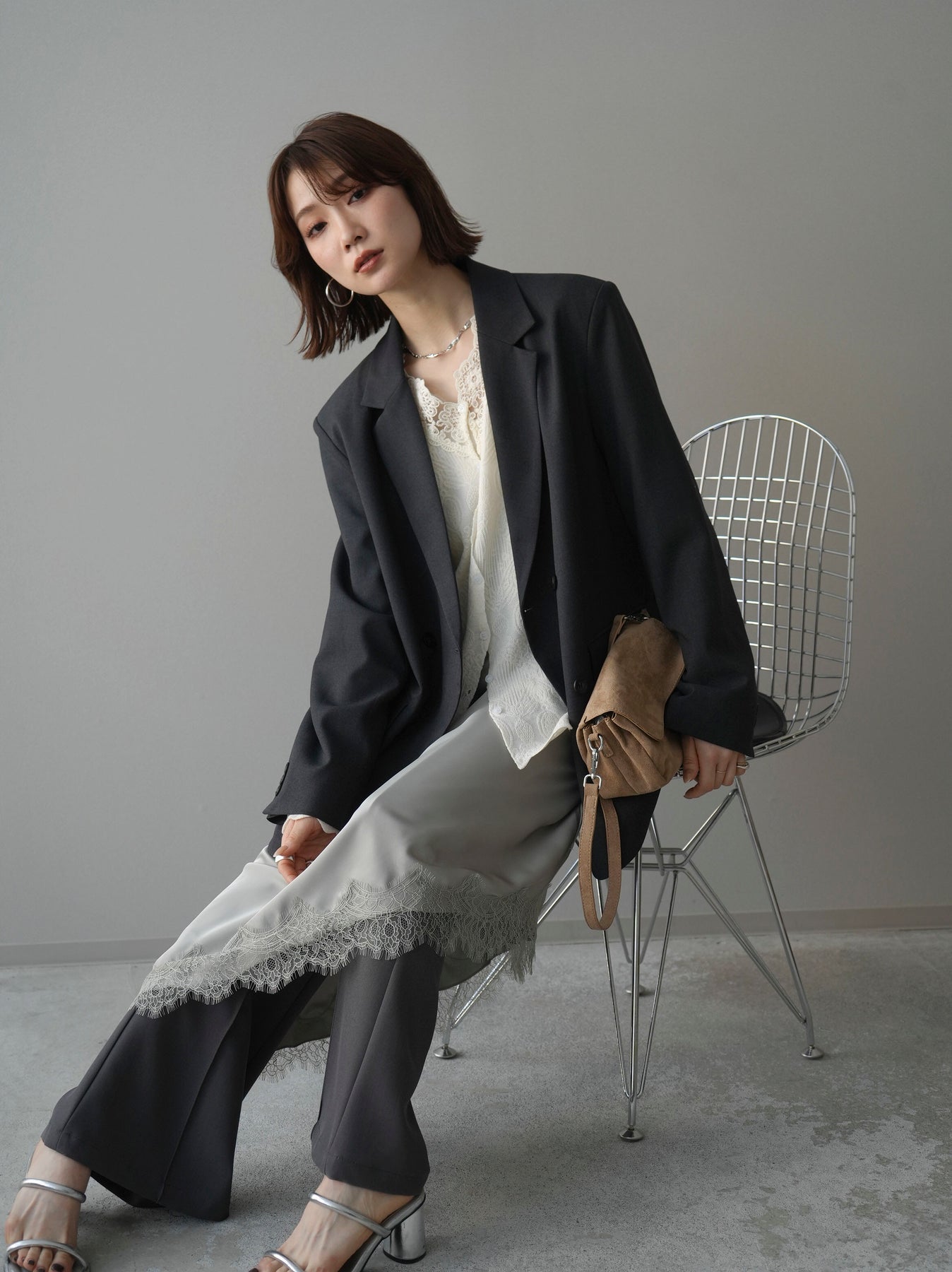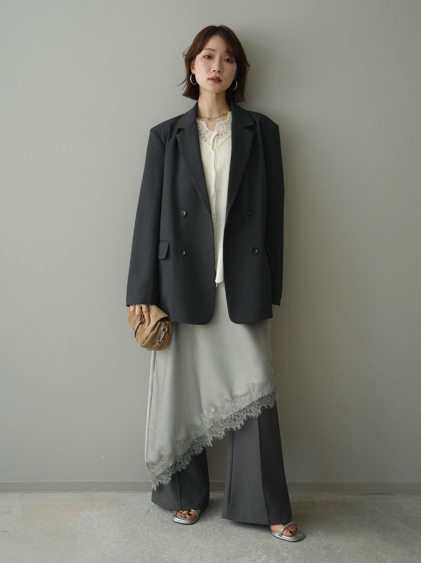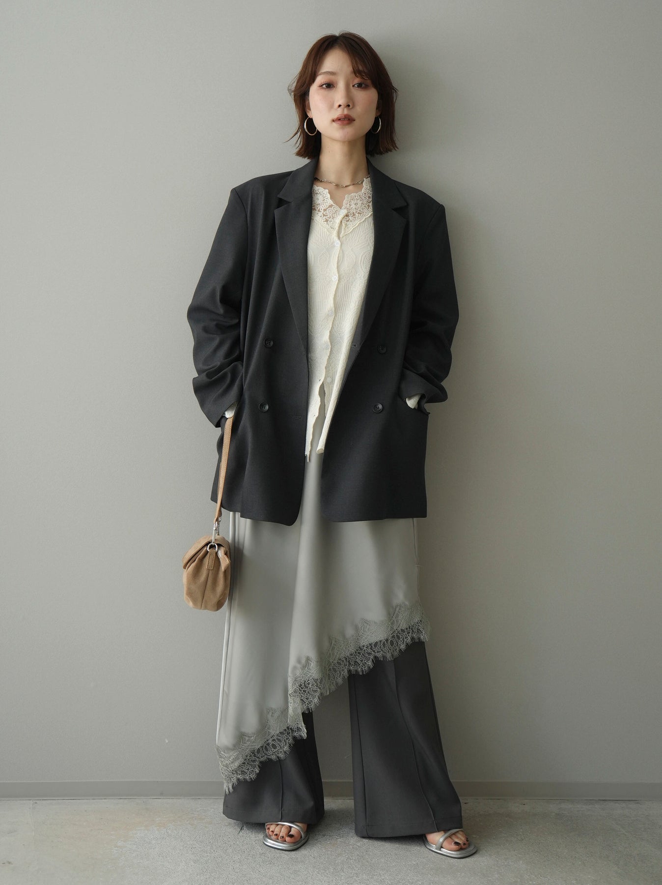 [SET]ダブルブレストオーバージャケット+レースネックジャガードニットカーディガン+サテンライクアシメレーススカート+センターシームフレアパンツ(4set))