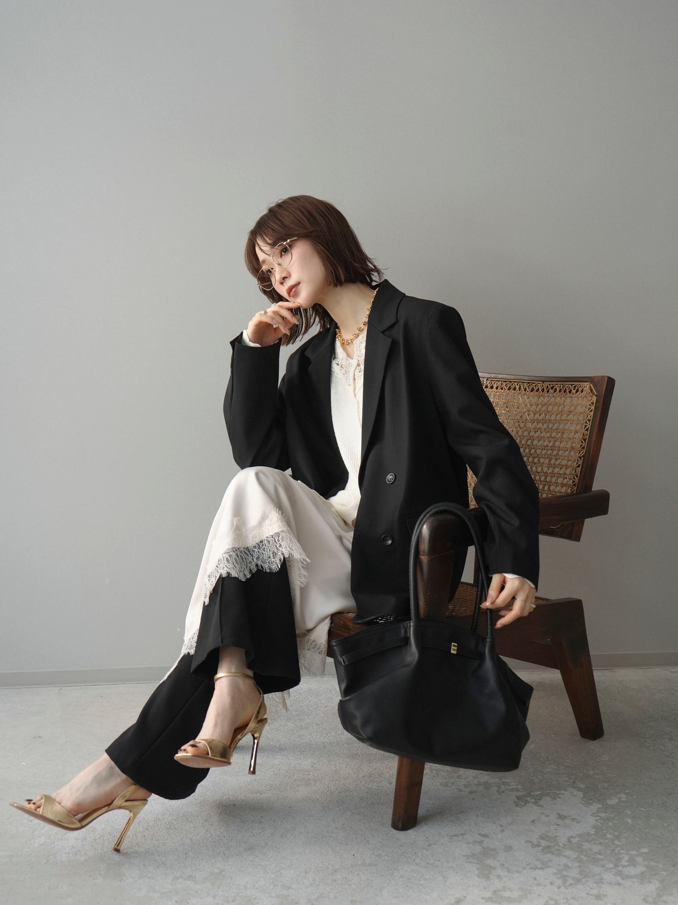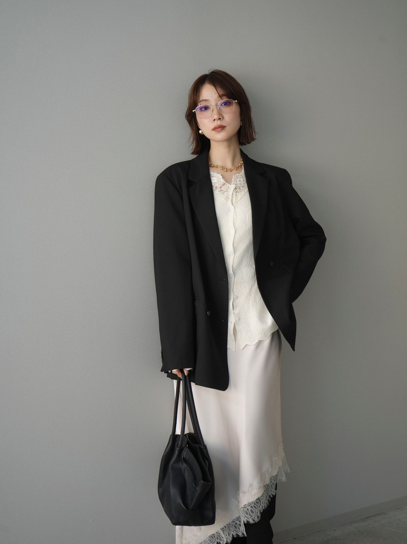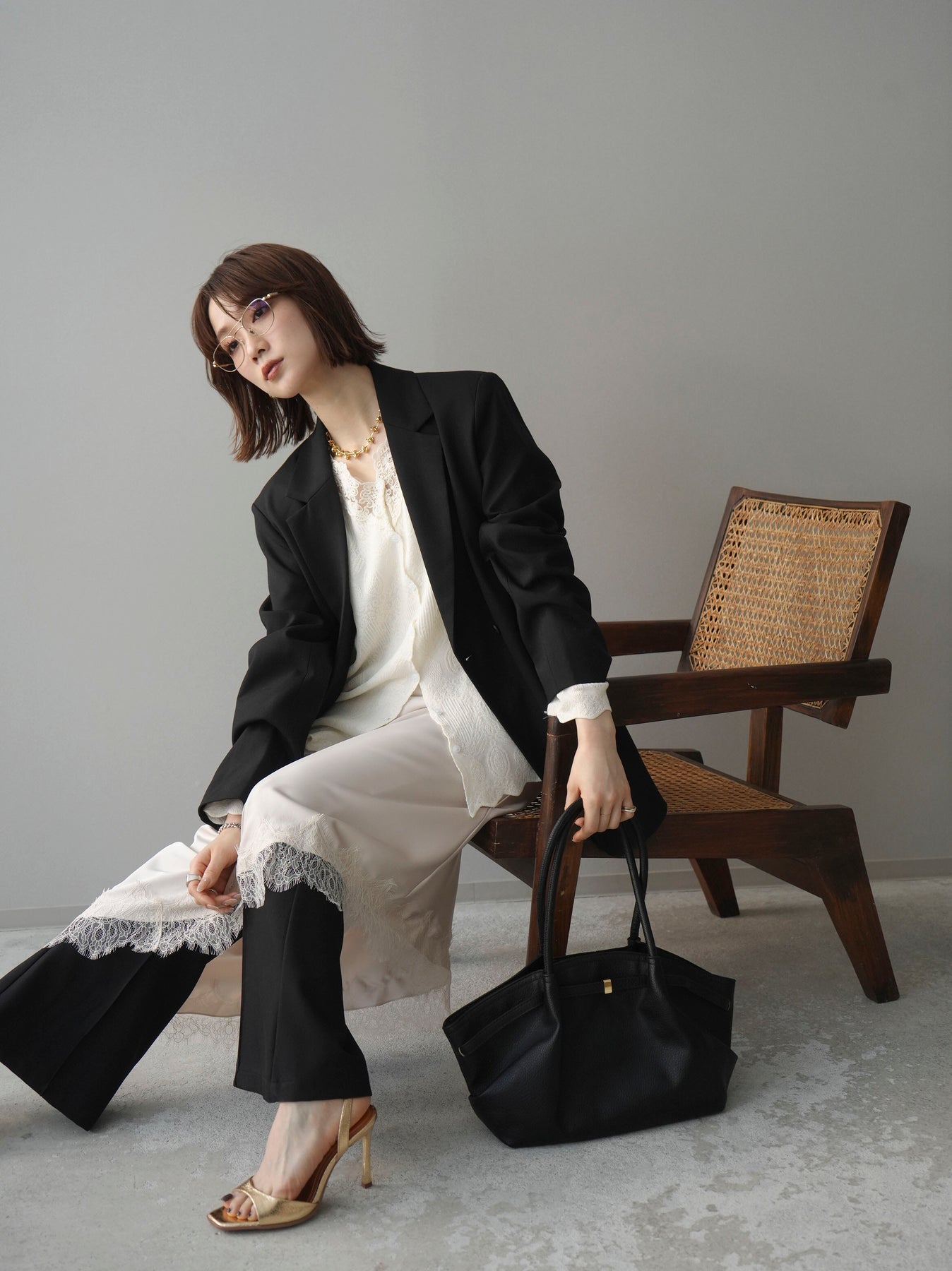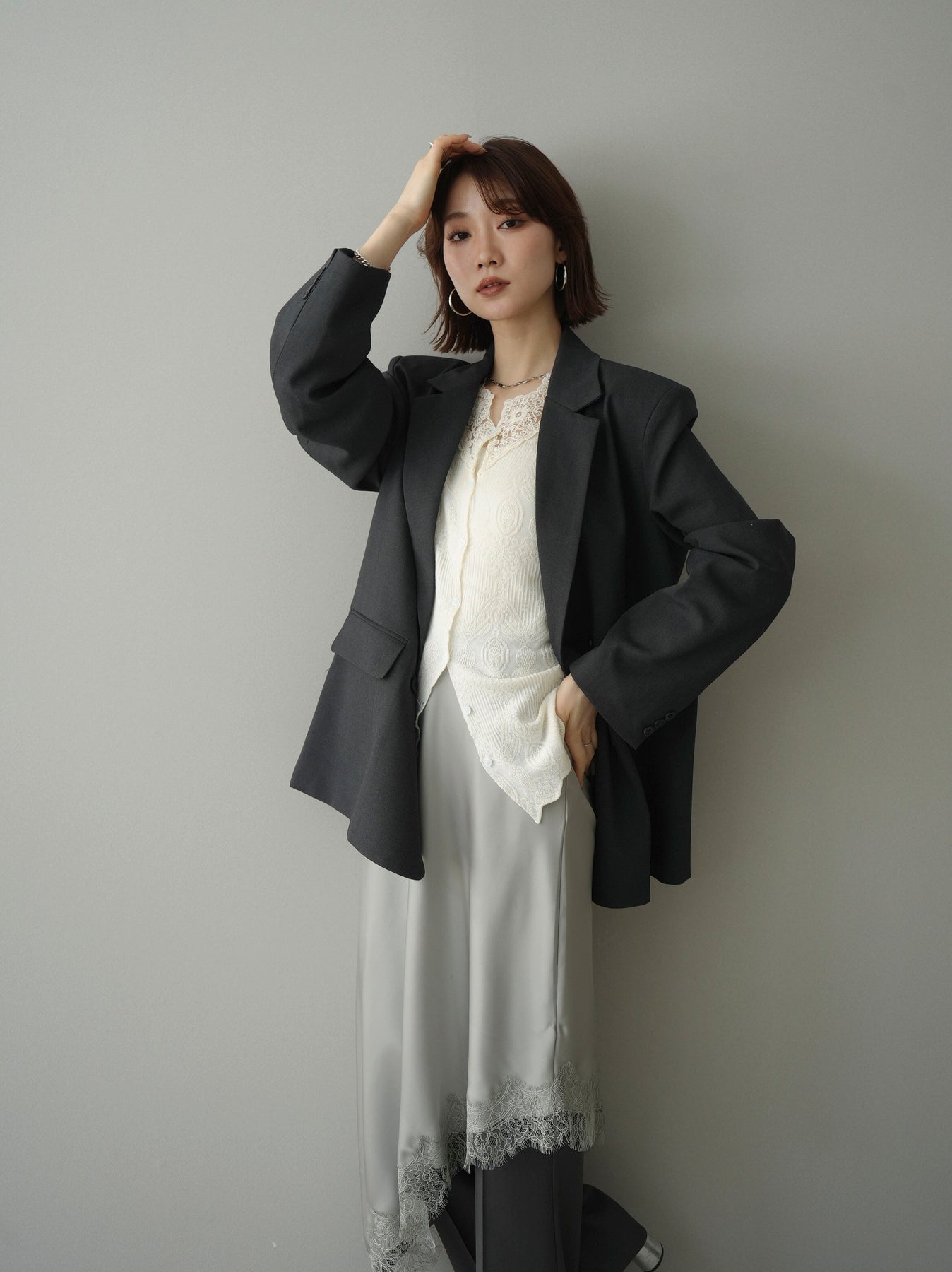 [SET]ダブルブレストオーバージャケット+レースネックジャガードニットカーディガン+サテンライクアシメレーススカート+センターシームフレアパンツ(4set))